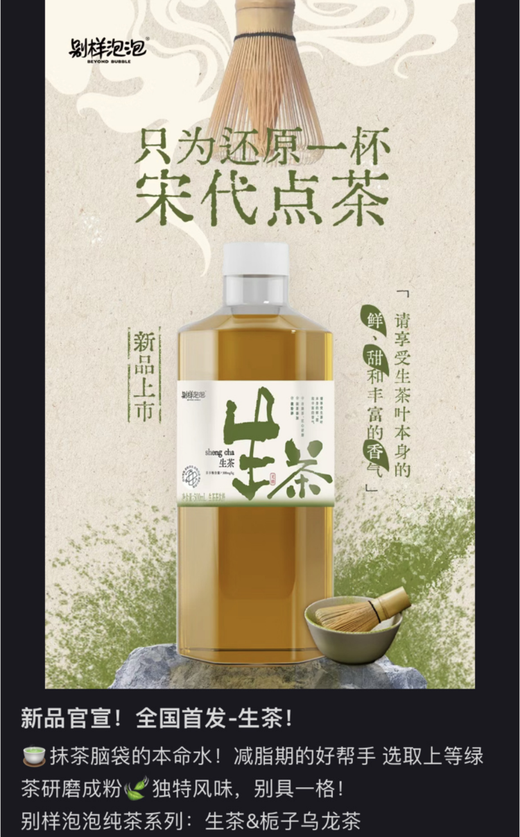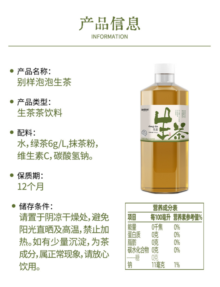 产品特质:采用的是绿茶+大量抹茶,冷磨成一杯具有宋代点茶一样口感的生茶茶饮料,🔥茶多酚≥300mg/kg!