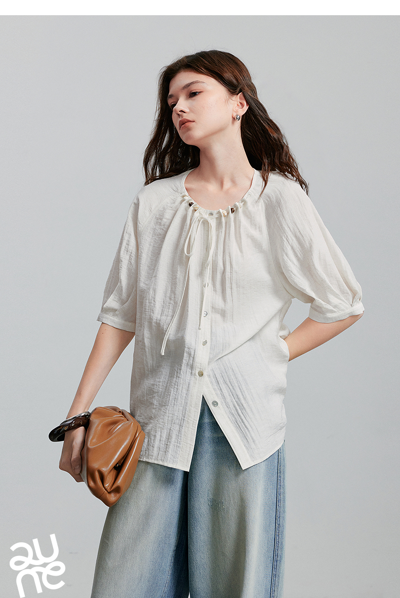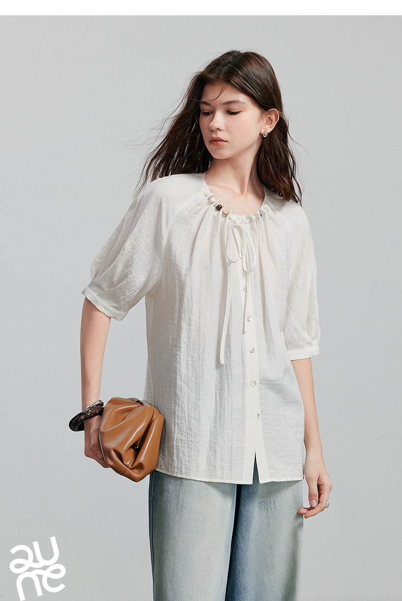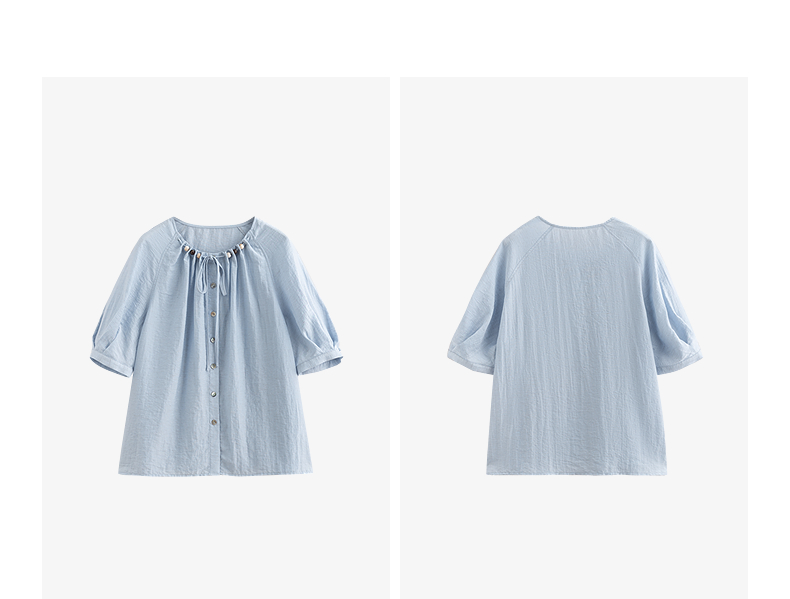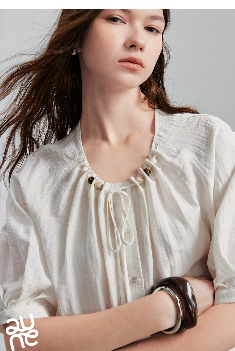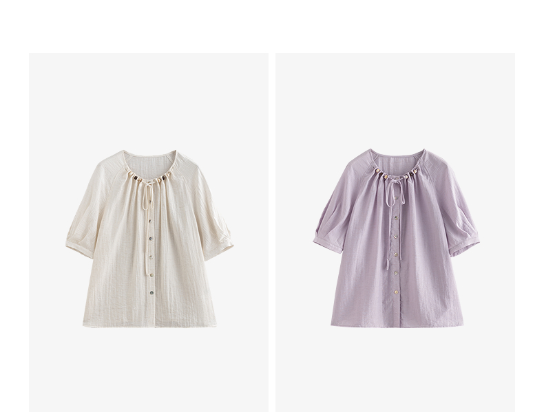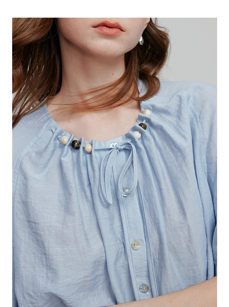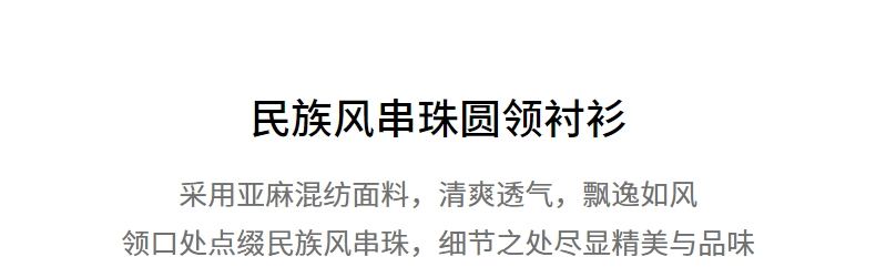 初语亚麻衬衫女民族风串珠圆领宽松衬衣清新上衣