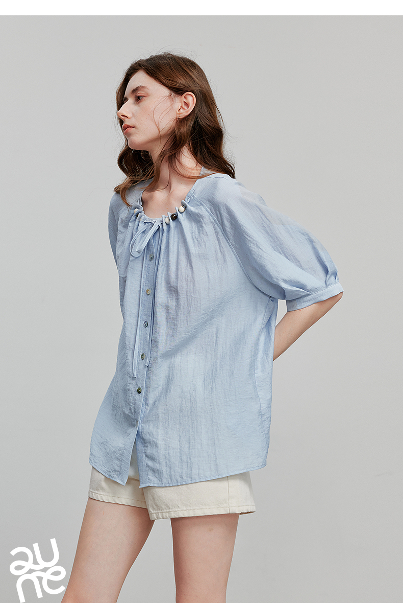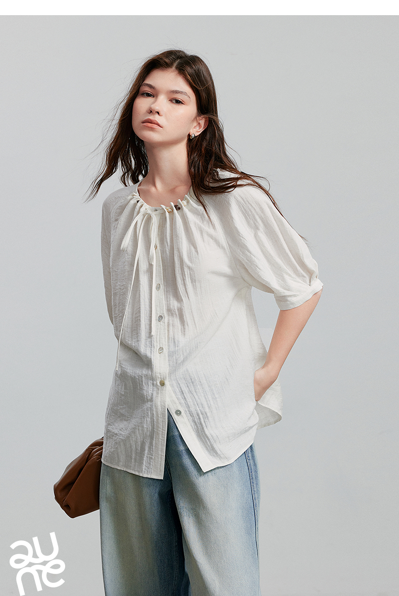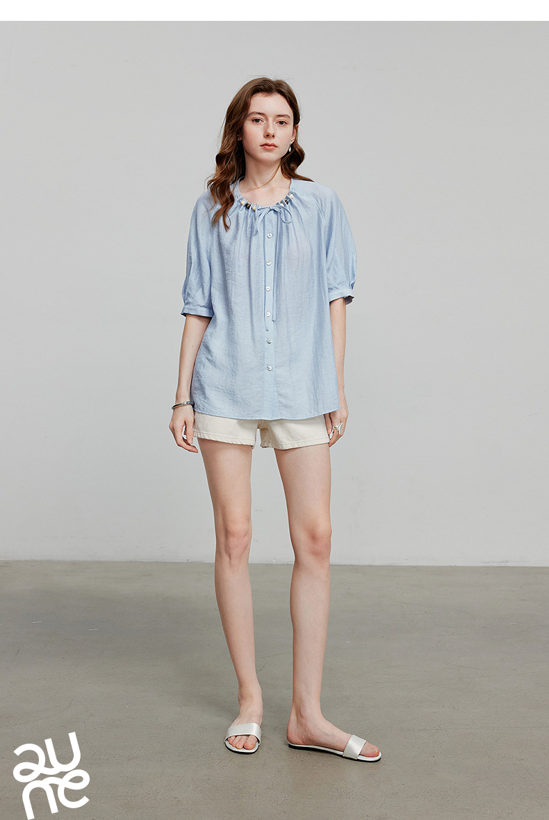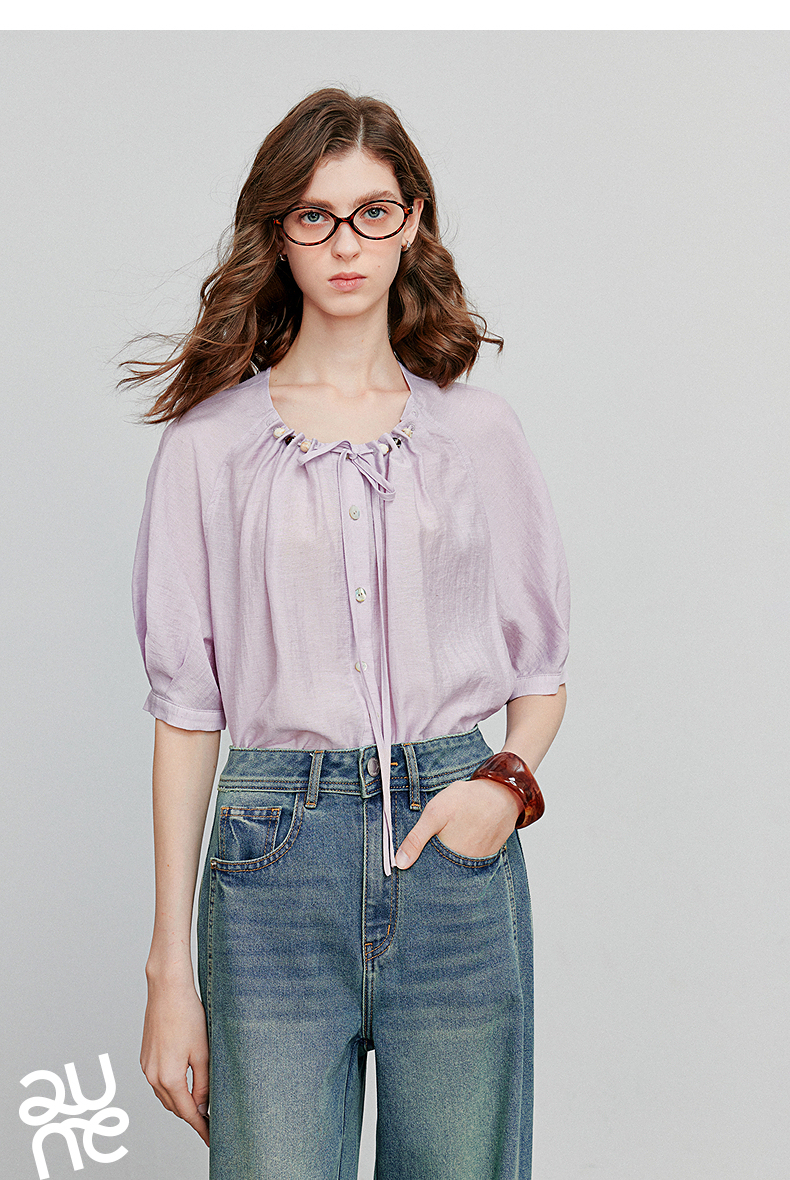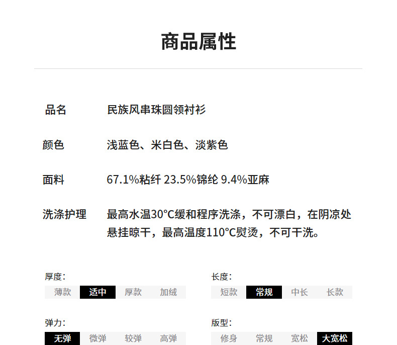 初语亚麻衬衫女民族风串珠圆领宽松衬衣清新上衣