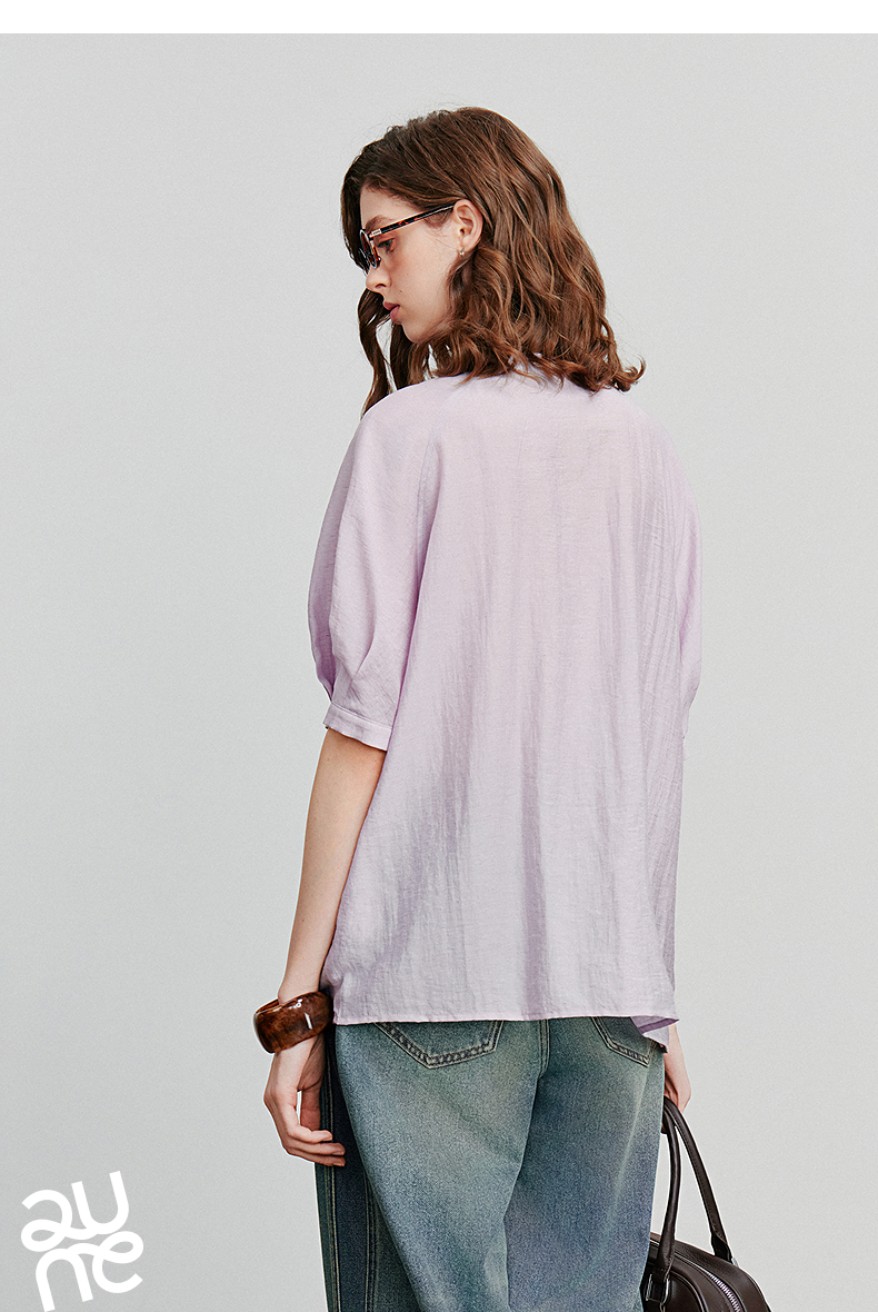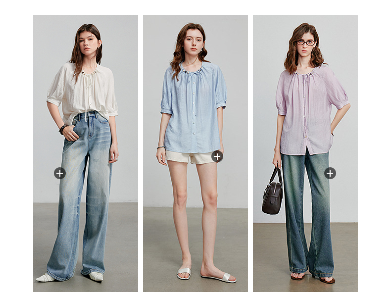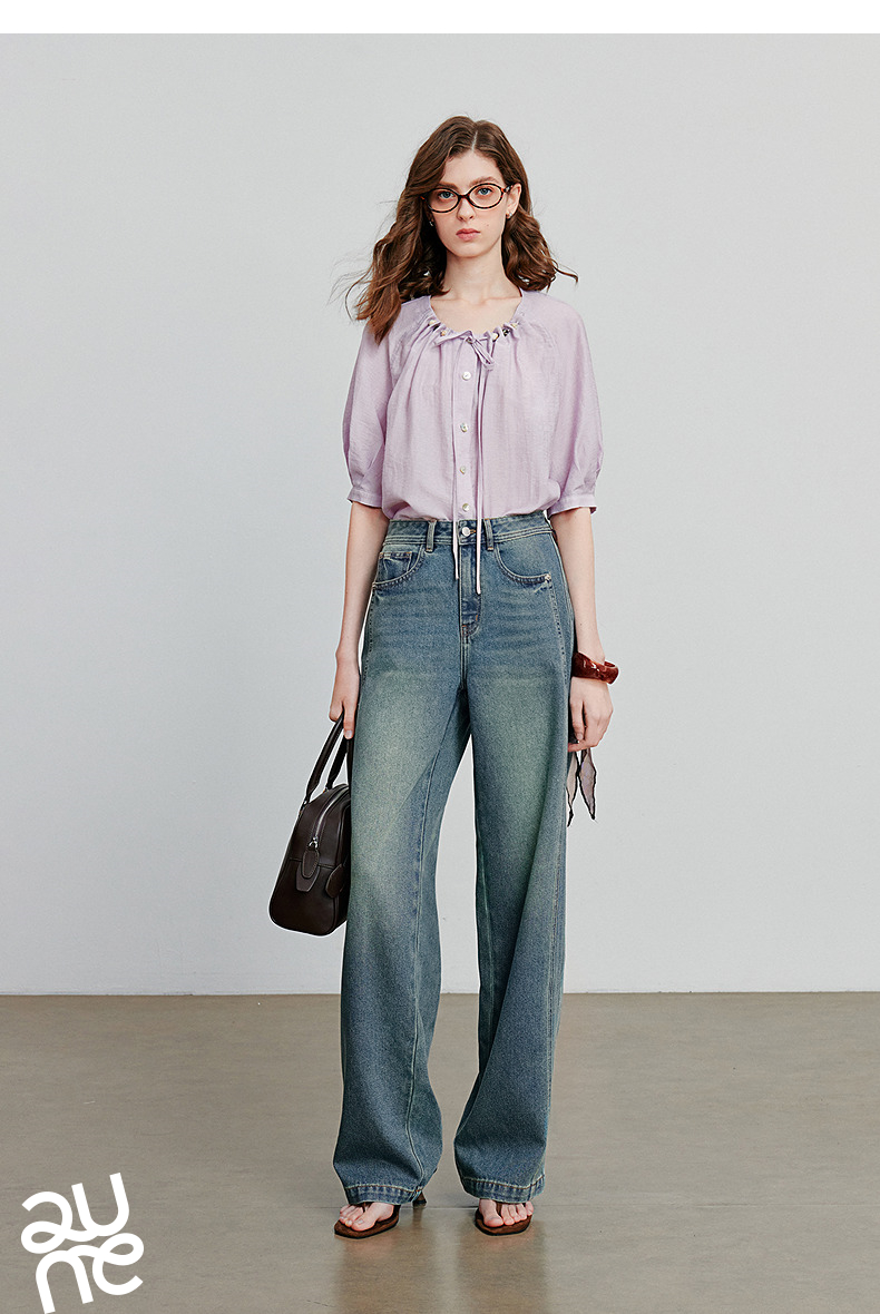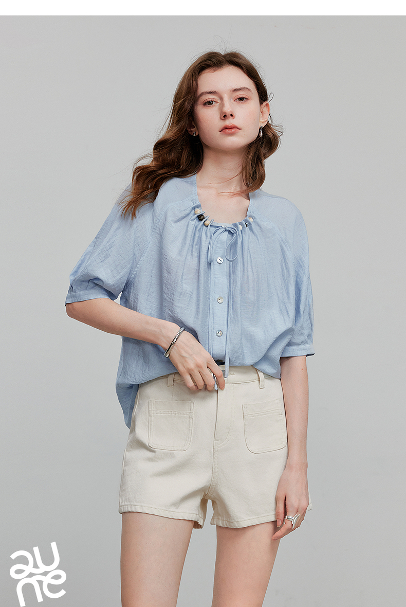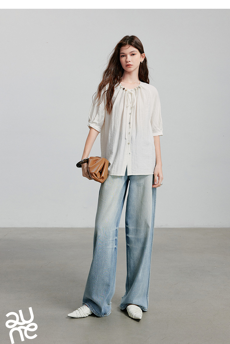 初语亚麻衬衫女民族风串珠圆领宽松衬衣清新上衣