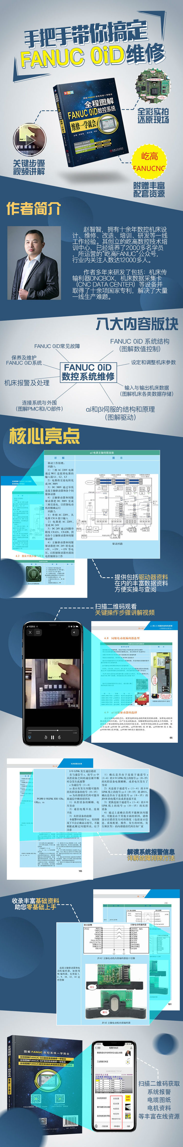 本书在参考大量FANUC 0iD操作说明书、维修说明书、参数说明书以及硬件连接功能说明书等资料的基础上,根据维修工程师的技能需求,按照由易到难的顺序编写。所配的图片和二维码,使全书简明易懂,能让初学者快速地进入维修工作状态。本书适合初学者学习,也可供维修工程师查阅。