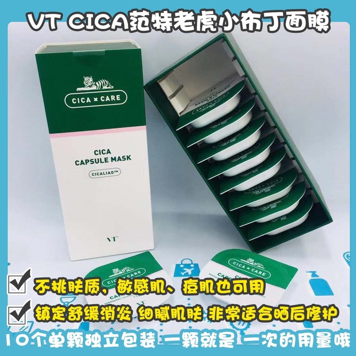 VT CICA范特老虎小布丁面膜 👍每个人必备的“肌肤灭火器🚑”,不挑肤质,敏感肌、痘肌也可✔。主打深层清洁毛孔🍃,镇定舒缓消炎,隐形毛孔,细腻肌肤。非常适合晒后修护☀,痘痘闭口粉刺肌。10个单颗独立包装,一颗就是 一次的用量哦,内含7.5g湿润的泥膜💦,任性涂抹,脸再大都足够用😊!建议油皮一周2次,干皮一周1次。因为是清洁面膜💆,所以不能太频繁使用哦❗
