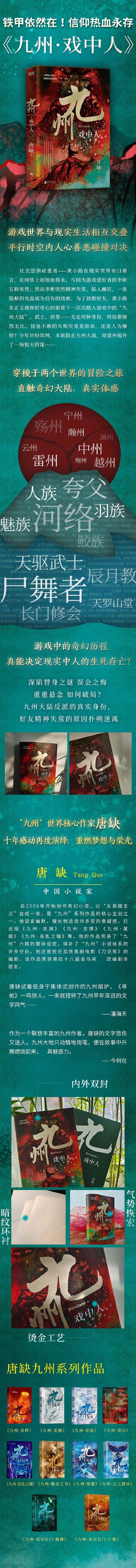 “九州”系列自开始创作至今已有十余年,围绕着九州大陆,江南、今何在、潘海天、唐缺等一批优秀作家涌现,吸引了众多年轻读者;相关图书热销,影视作品由关晓彤、鞠婧祎、张若昀等出演。唐缺以其充满悬念的故事和幽默的文风,成为九州世界中具影响力的核心作家;更以“反英雄主义”自成一家,拥趸众多。