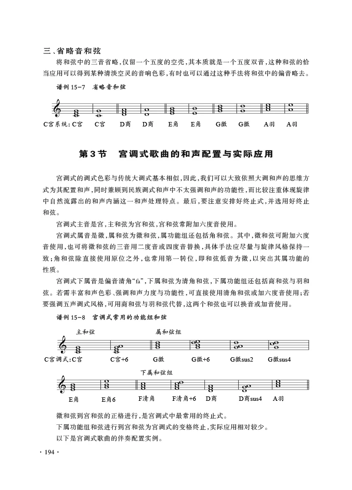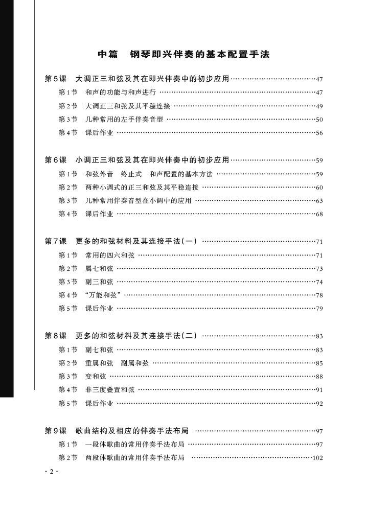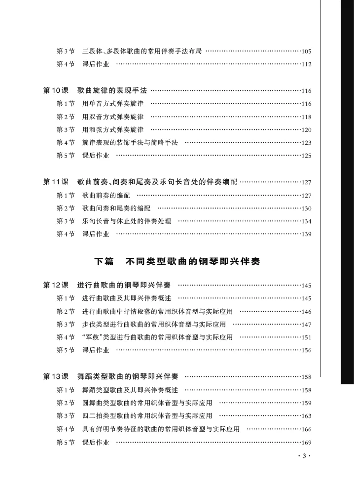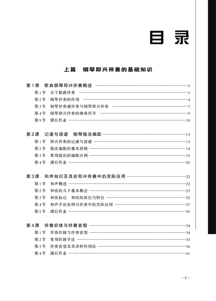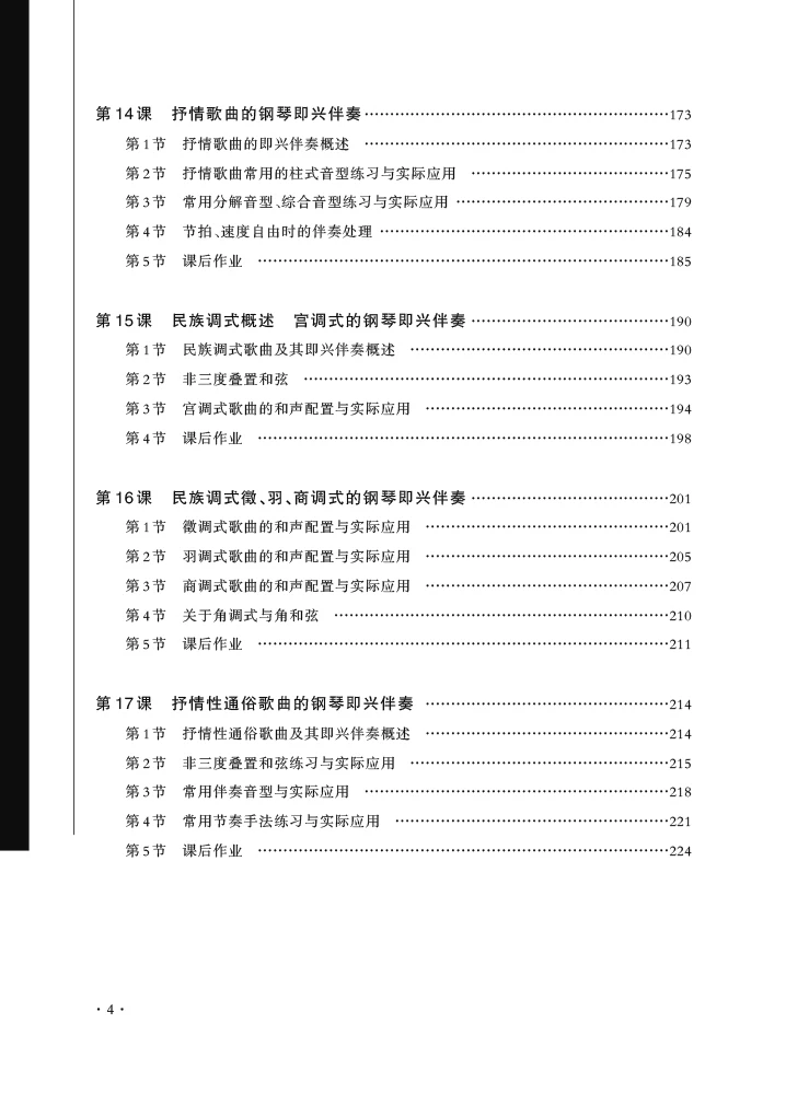 本教材以由浅入深的即兴伴奏知识的讲授以及应用和声的书面、键盘练习为主线,共分为17课。此次为第四次修订,修订内容主要集中于教育部提出的“整持正确的政治方向和价值导向,注重课程思政,增强课程教材育人功能”“体现类型教育特色,凸显实践性”这两大教材编写指导思想。修订主要特点包括:1.调整增加了大量中国优秀的民族民间歌曲、艺术歌曲、革命歌曲等,凸显了教材的时代性和育人作用;2.厘清了钢琴即兴伴奏的学习重难点和注意事项,通过不同伴奏风格、曲式结构或伴奏音型的歌曲比如儿童歌曲、进行曲歌曲、舞蹈型歌曲、一段式、二段式、三段式等,进一步强化培养了学生综合性的即兴伴奏能力和艺术表现力;3.增加了大量的具有非常强的技巧针对性和实际可操作性的课后作业,可以为学生能力的提升持续输送训练内容;4.教材编写上注重讲授与启发相结合,将系统性与学段针对性、可读性与学生适宜性紧密结合。 |