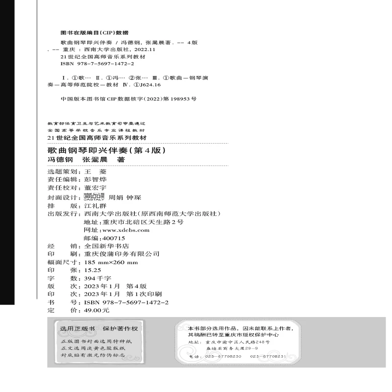 *书名:歌曲钢琴即兴伴奏(第4版) | *ISBN:978-7-5697-1472-2 |