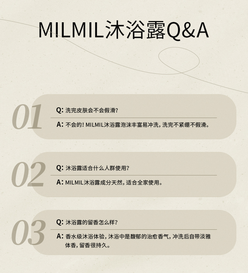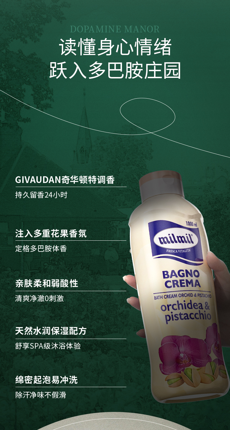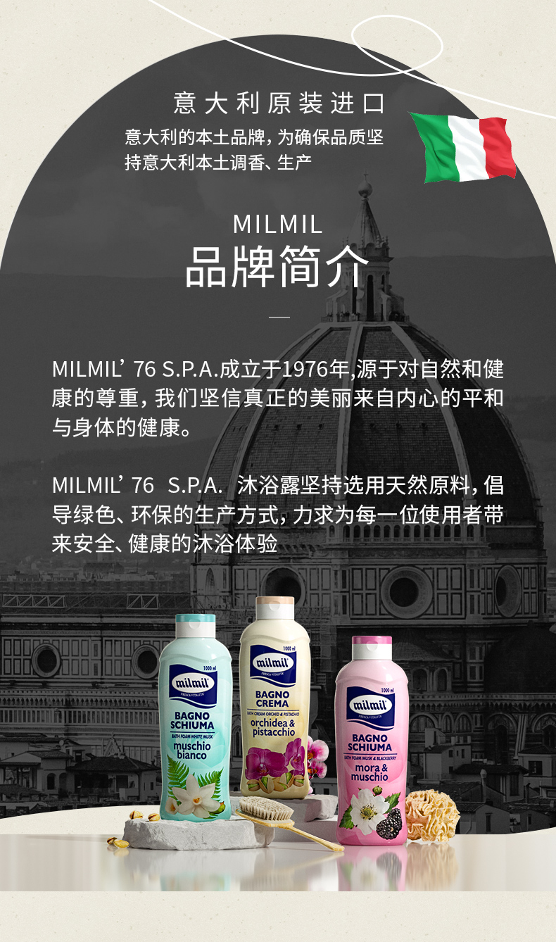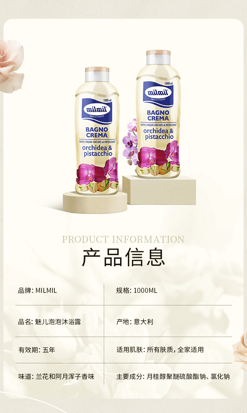 【品名】意大利原装进口 Milmil-魅儿 香氛泡泡沐浴露 1000ml/瓶 大容量 5款可选 【规格】兰花和阿月浑子香味1000m1 ;白麝香香味1000ml ;阿甘果和黑檀木香味1000ml ;鸢尾和紫罗兰香味1000ml ;麝香和黑莓香味1000ml 【产地】意大利 【保质期】5年 【发货包装】独立包装瓶 【发货地】广东惠州 【发货快递】中通 【不发货区域】港澳台 【补邮费地区】新疆,西藏,内蒙古,宁夏,青海,甘肃+10元/单 【发货时效】48-72小时,周末节假日顺延 |