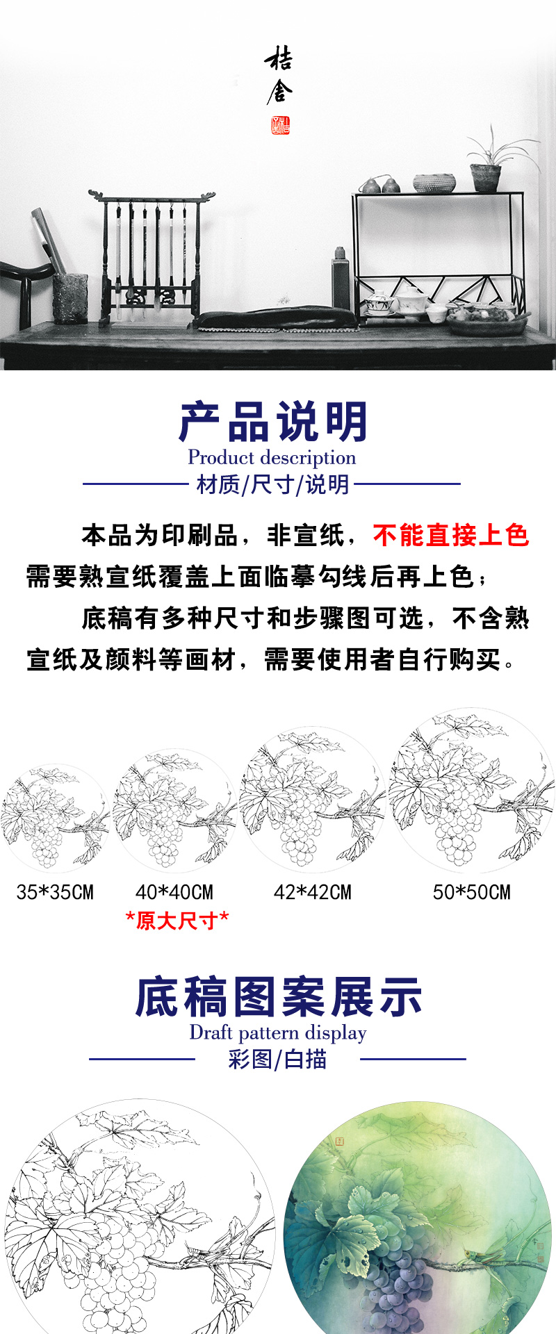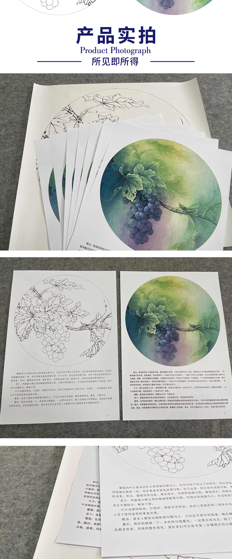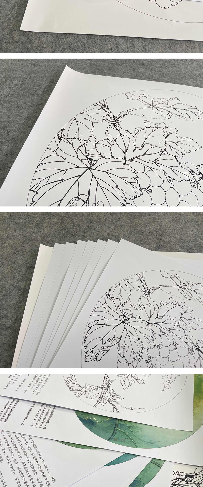 【有步骤、大彩图】李晓明工笔画白描底稿圆形《蝗虫葡萄图》临摹勾线高清打印稿 KB03