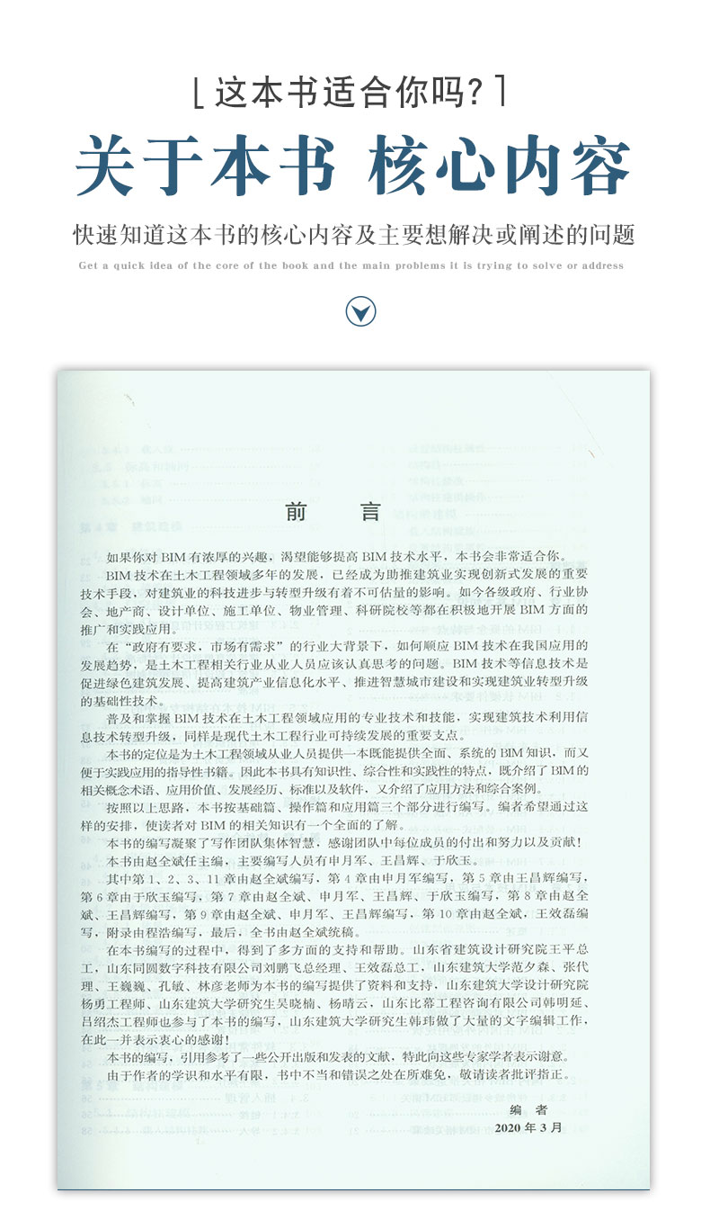 建筑信息模型(Building Information Modeling)是以建筑工程项目的各项相关信息数据作为基础,建立起三维的建筑模型,通过数字信息仿真模拟建筑物所具有的真实信息。它具有信息完备性、信息关联性、信息一致性、 可视化、协调性、模拟性、优化性和可出图性八大特点。目前国内尚无相关适合土木工程专业的高校教材。BIM软件众多,如何选择都难以全面涵盖。BIM的发展类似于CAD当年的情形,建模软件最终还是以通用软件为主。土木工程BIM技术应用类教材以BIM理念开篇,以能完成建模、虚拟建造、结构计算接口等基本功能为主线,以工程应用案例结篇即可。