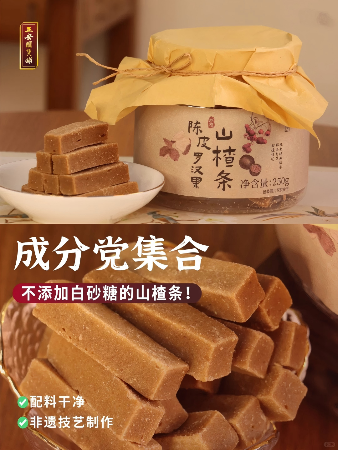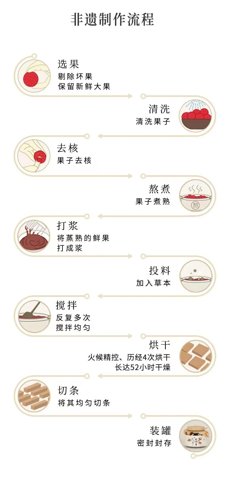 配料干净,食材添加含量更高,采用非遗技艺古法制作,新鲜的原果打浆,去除了坏果、不成熟果实,保留山楂原香,搭配的食材更是健康营养,满满陈皮颗粒,口感丰富。非遗制作工艺,坚持0添加色素、香精、防腐剂,更大程度保留产品本味!