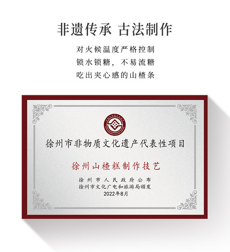 ●徐州作为中国山楂糕的发源地,从北宋起,这里的山楂糕就作为贡品进贡上京,并且这项制作技艺也在2022年列入了非物质文化遗产代表行项目。而这款山楂条的制作工艺采用先制糕再制条的工艺,所有原材由人工筛选清洗一遍后,再经过熬煮—打浆—投料—搅拌—烘干—切条等繁琐工艺,也正因为有了这样工匠的制作流程,所以产品对比普通工艺制作的会有不一样的感受。