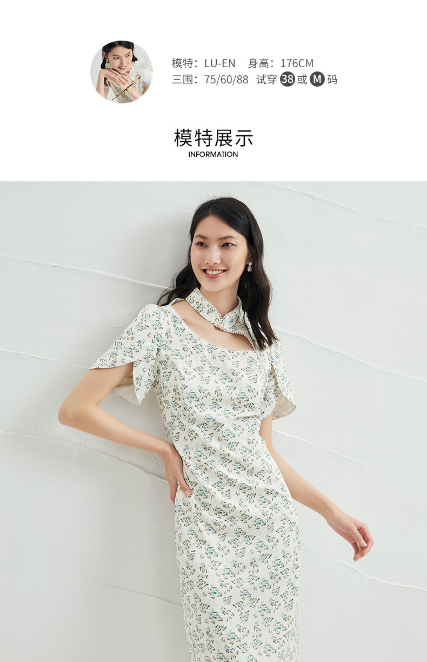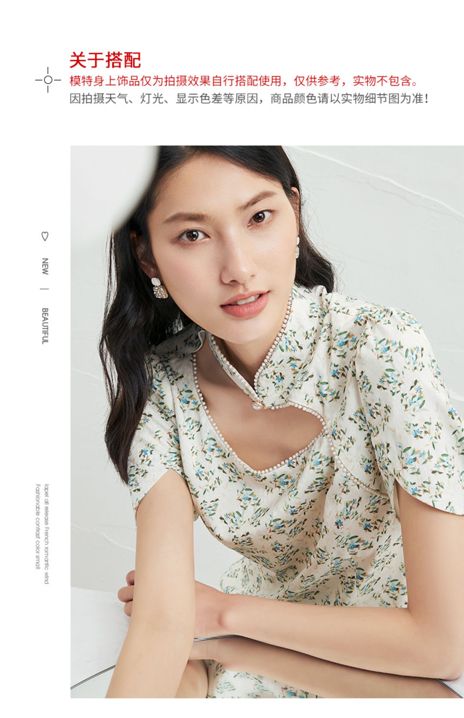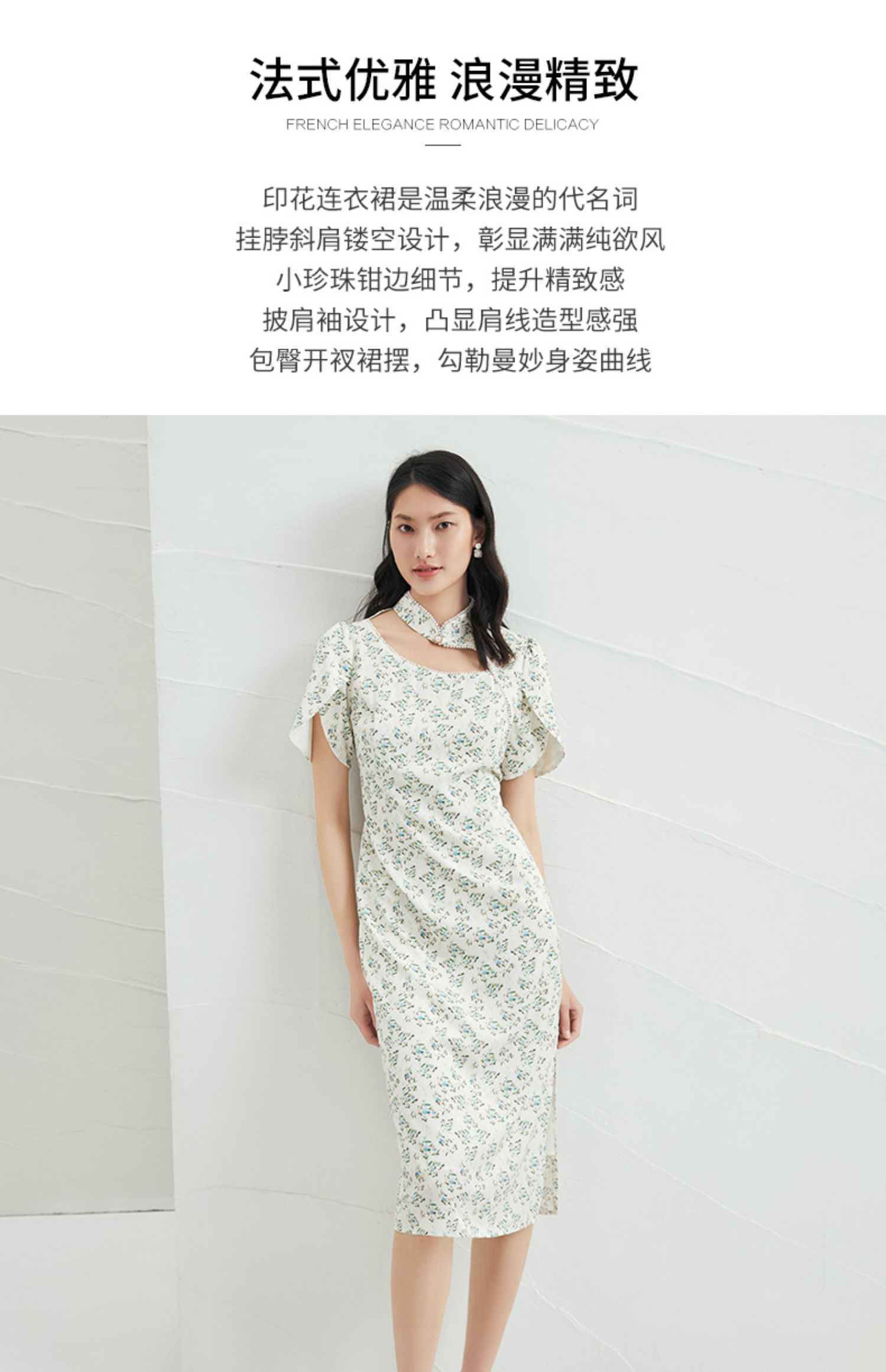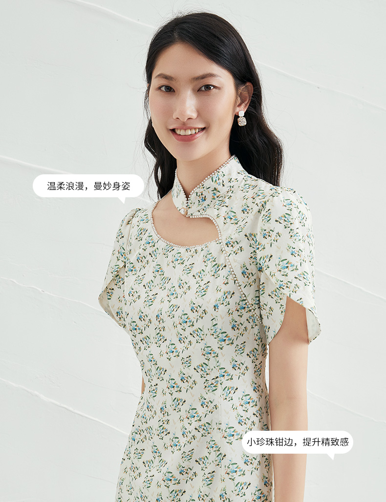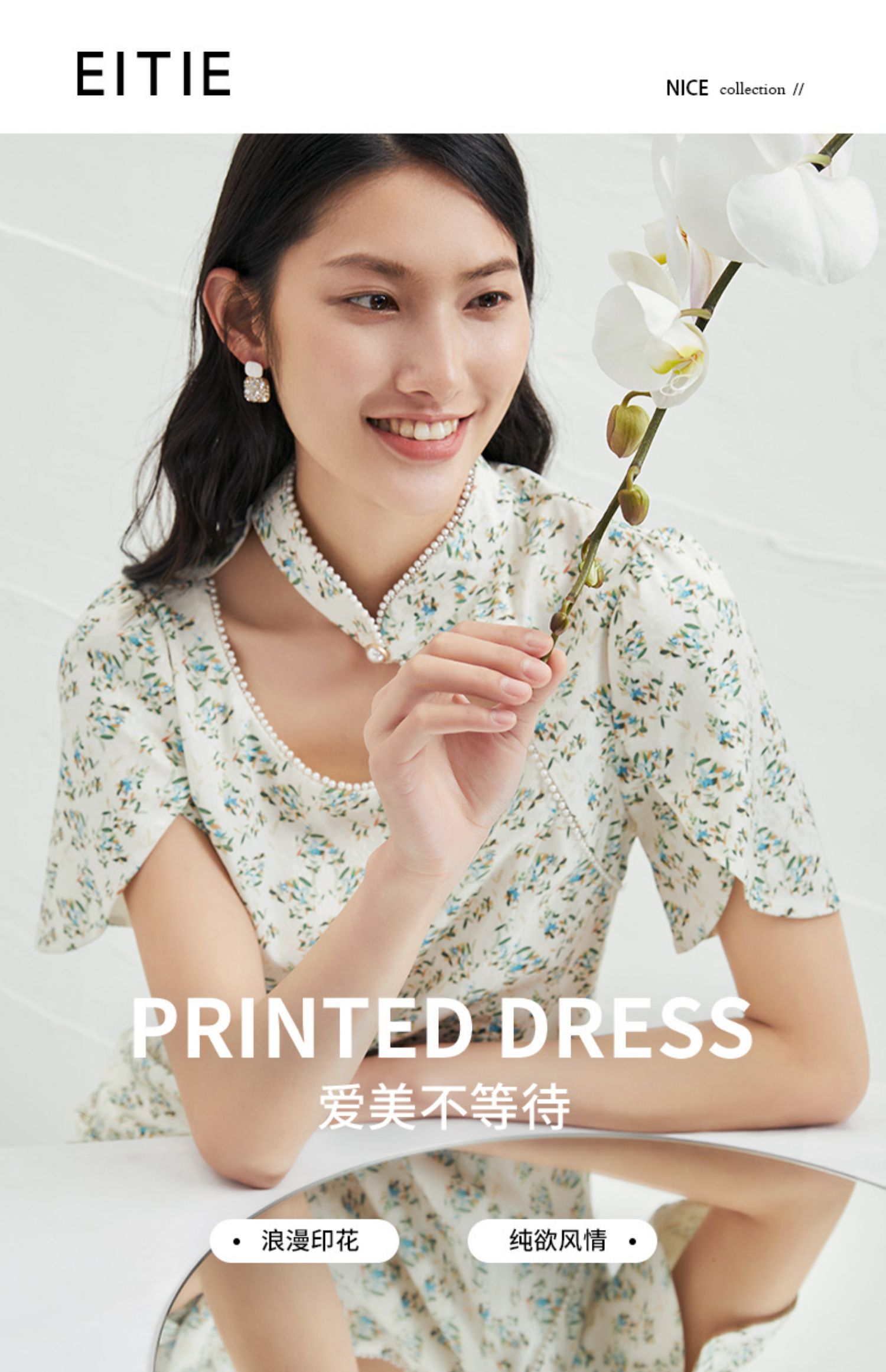 EITIE爱特爱夏新款立领镂空清新碎花温柔气质改良旗袍连衣裙B2207968