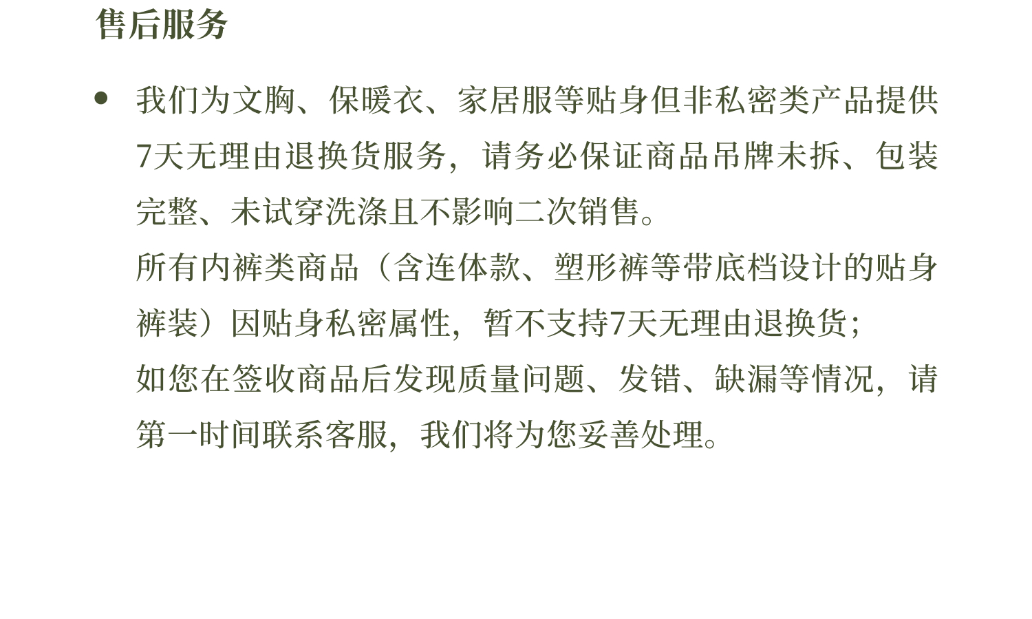 退换货规则:1.7天无理由退换货规则:品牌产品为贴身私密性衣物,务必保证所退产品吊牌水洗标齐全,无人为因素导致的破损、污渍、异味等影响二次销售的状况,否则,品牌有权不予退货退款,退货请将赠品一同寄回。内裤不支持7天无理由退换。换货差价将遵循多退少补的原则。