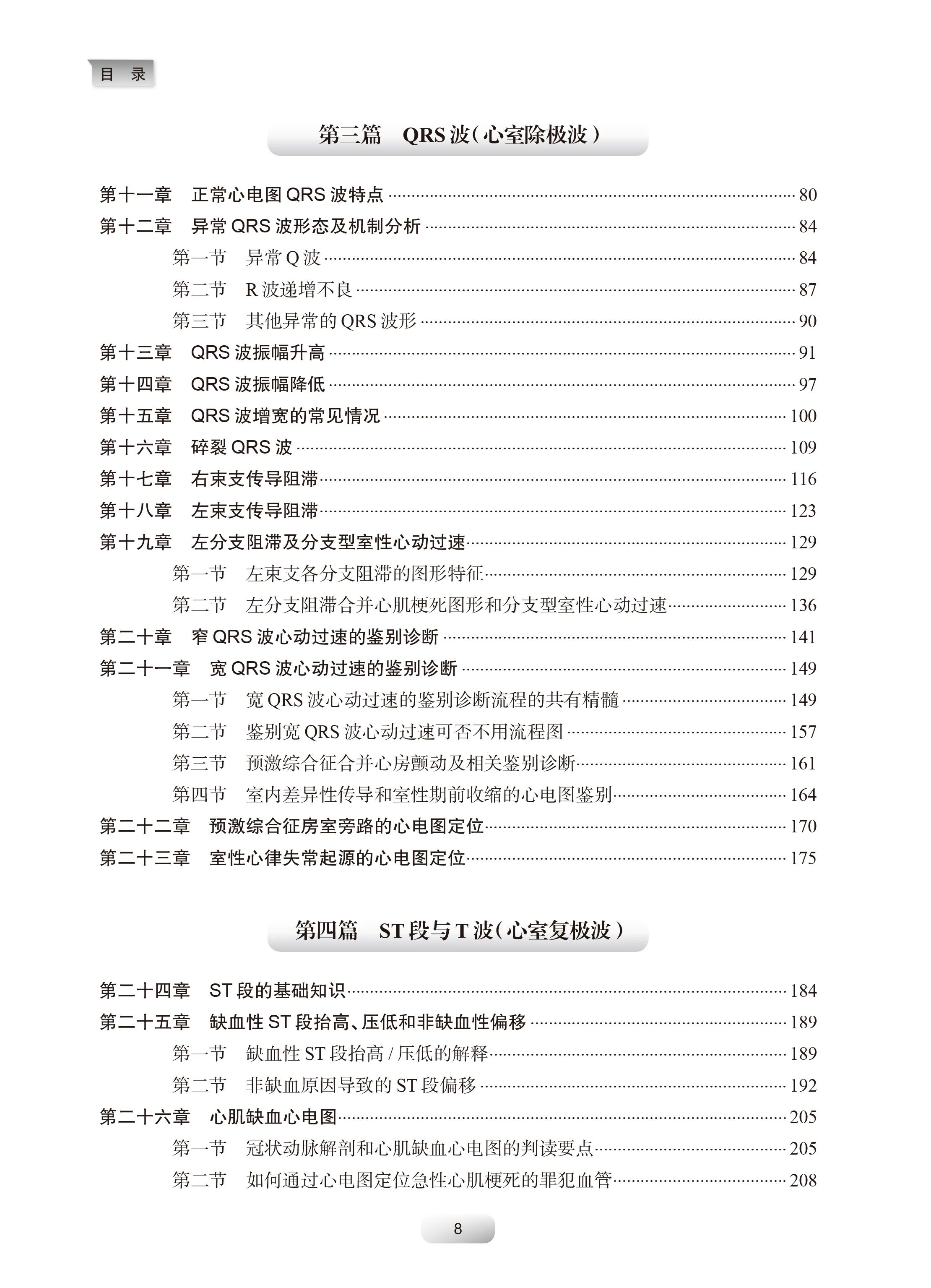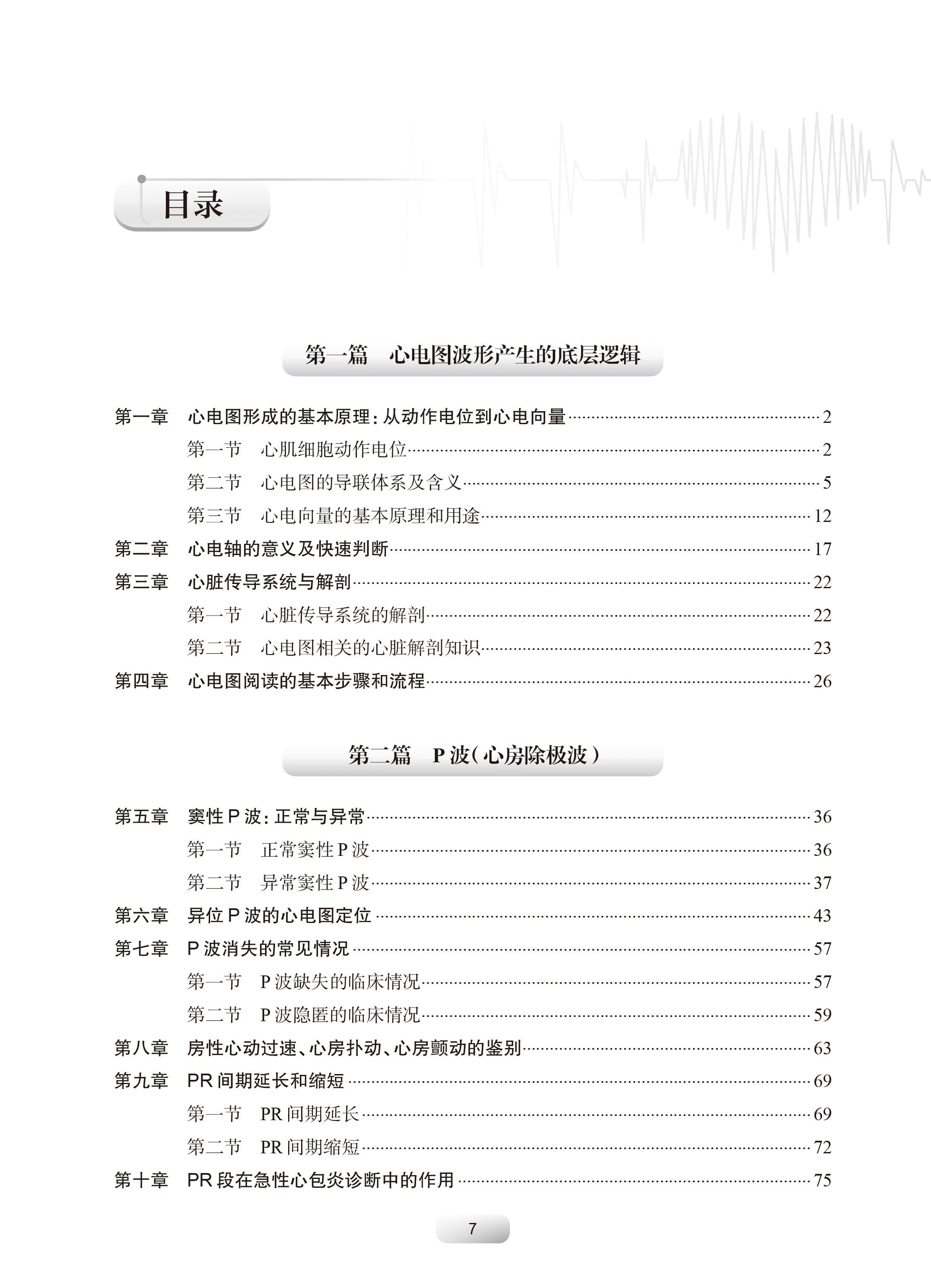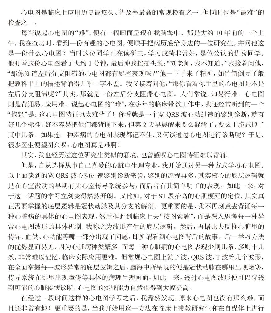 本书包括8篇40章内容,从心电图波形产生开始,逐篇将P波、QRS波、ST段与T波、P波与QRS波的关系、QT间期、心电图危急值,以及少见的心电概念或心电波形串联起来,为读者梳理每一种异常心电图波形的具体机制,关联冠状动脉及其分支的解剖,反推心脏传导、血供、心功能等问题,使读者能够透过心电图波形看透可能的诊断,无须再“死记硬背”每一种心脏病少则几条、多则十几条的心电图表现。