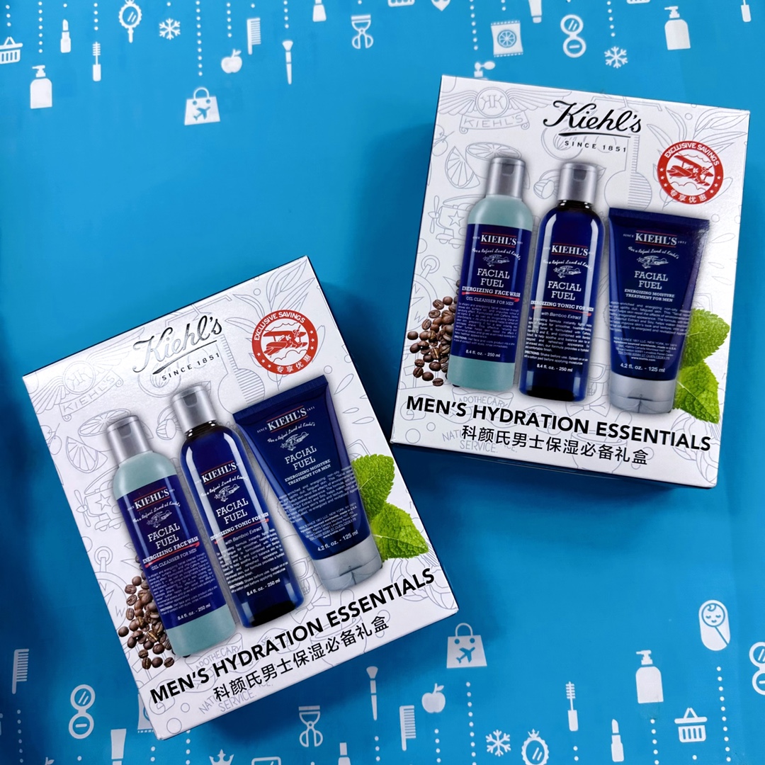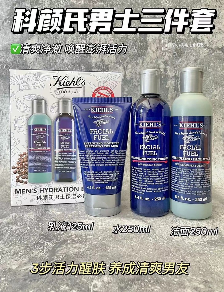 👑科颜氏男士保湿三件套 👍 适合所有男士肤质,保湿补水,清爽控油💦。 👍吸收很快不油腻,闻起来是清爽的香气, ✅其中含有特别的栗子精华,维生素C、E精华等,帮助改善皮肤💯。 【套装包括】:水250ml+乳125ml+洁面啫喱250ml