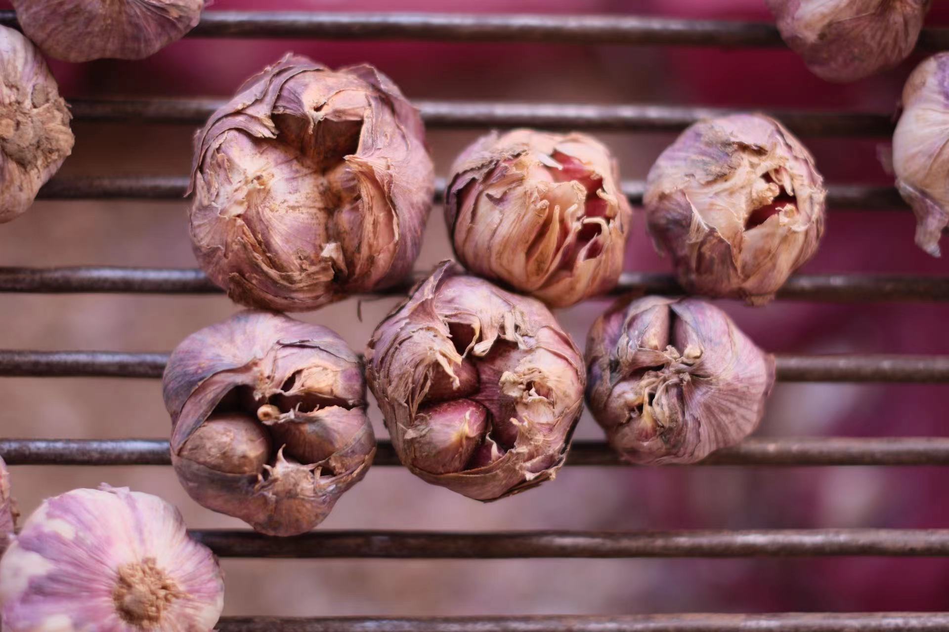 紫皮蒜外皮呈紫红色,蒜瓣紧实、肉厚肥大,口感好、辣味浓厚,风味独特、营养丰富。