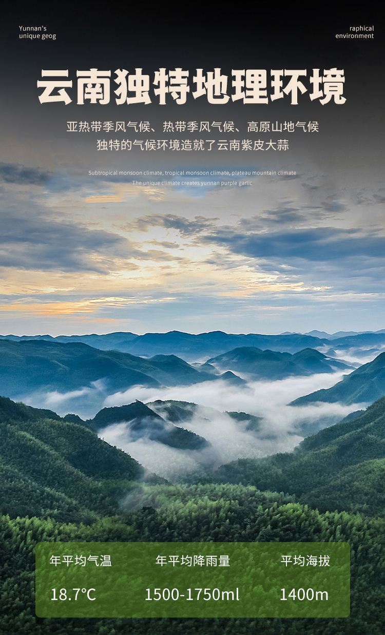 低纬度高原季风气候,四季恒温,光照和降雨充足,年日照达到2500小时,土壤肥沃,独特的风土条件,与优质的生态系统,使独蒜成为大理唯一的地理标志保护产品,是公认的紫皮蒜上好产区之一。