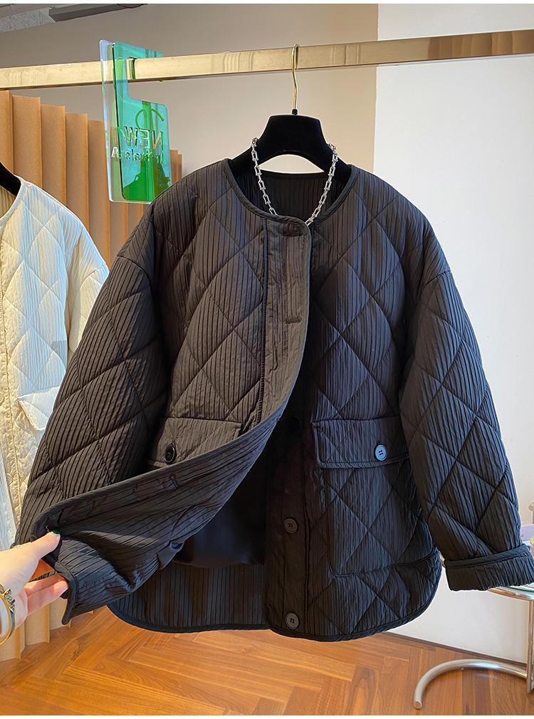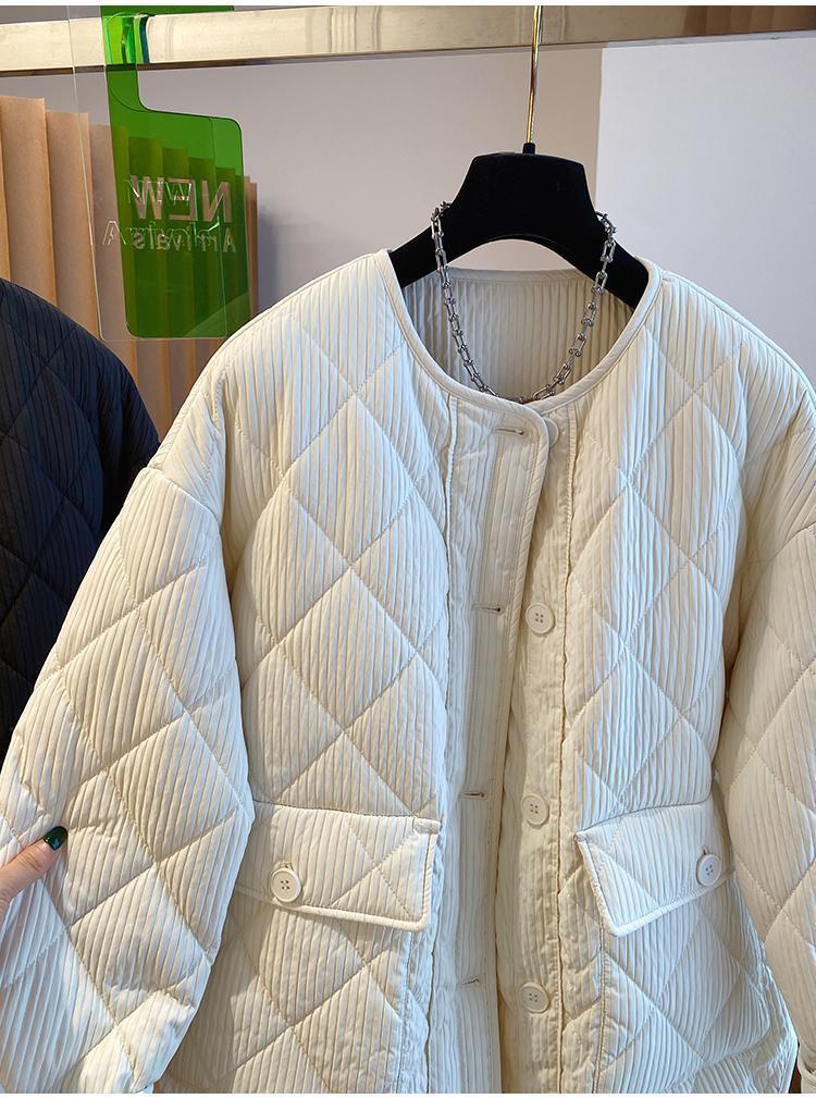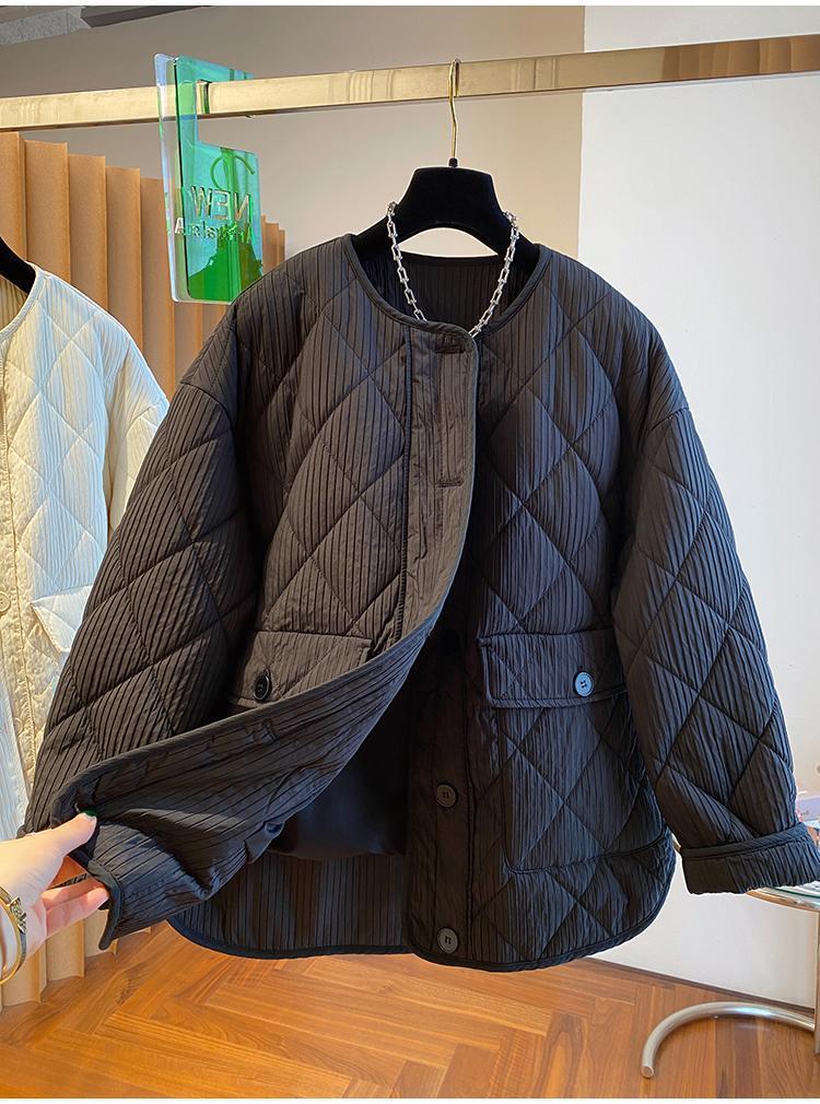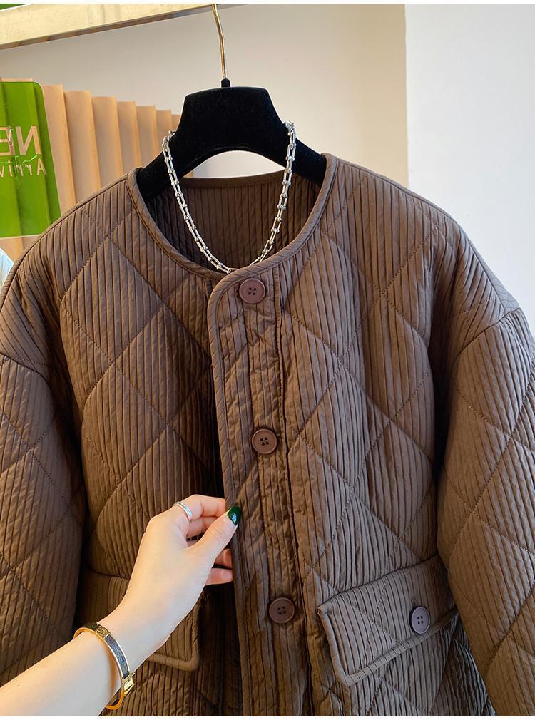 雀说 新款休闲无领菱形格棉服女冬季简单设计感圆领棉衣外套4ZF-62569