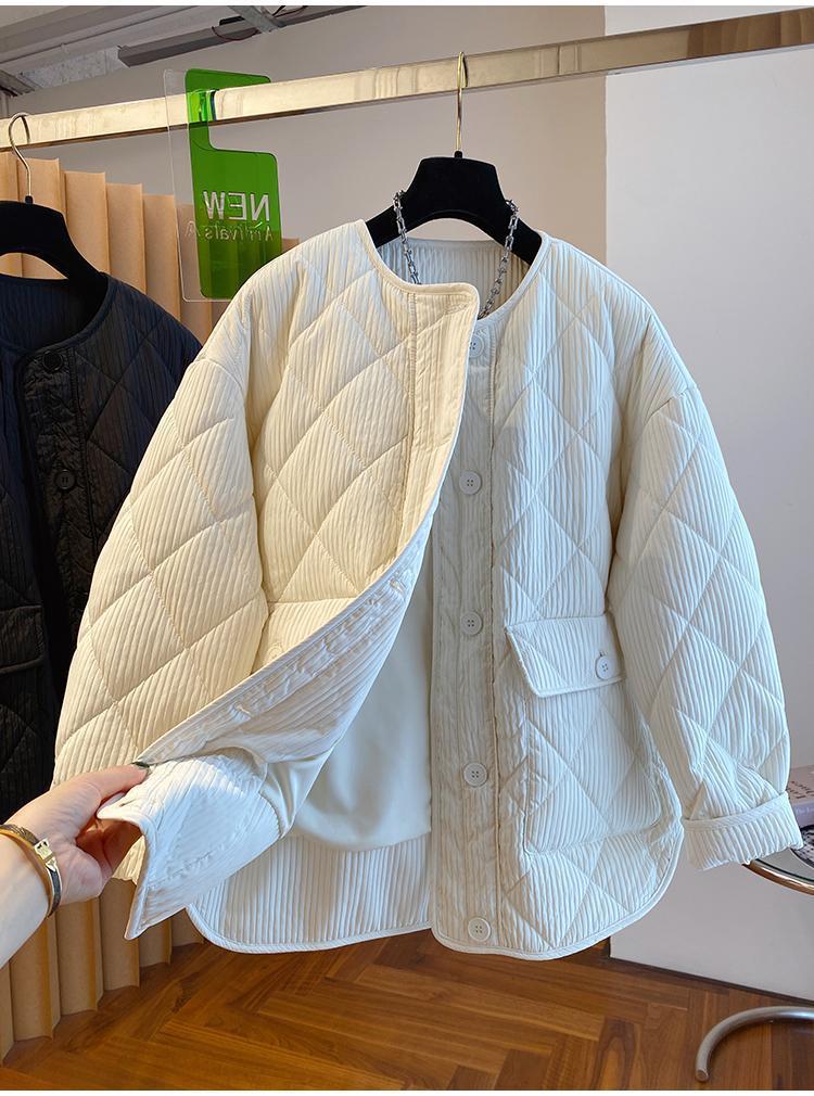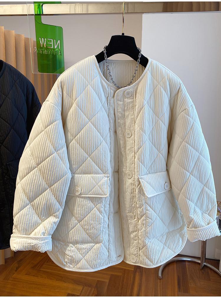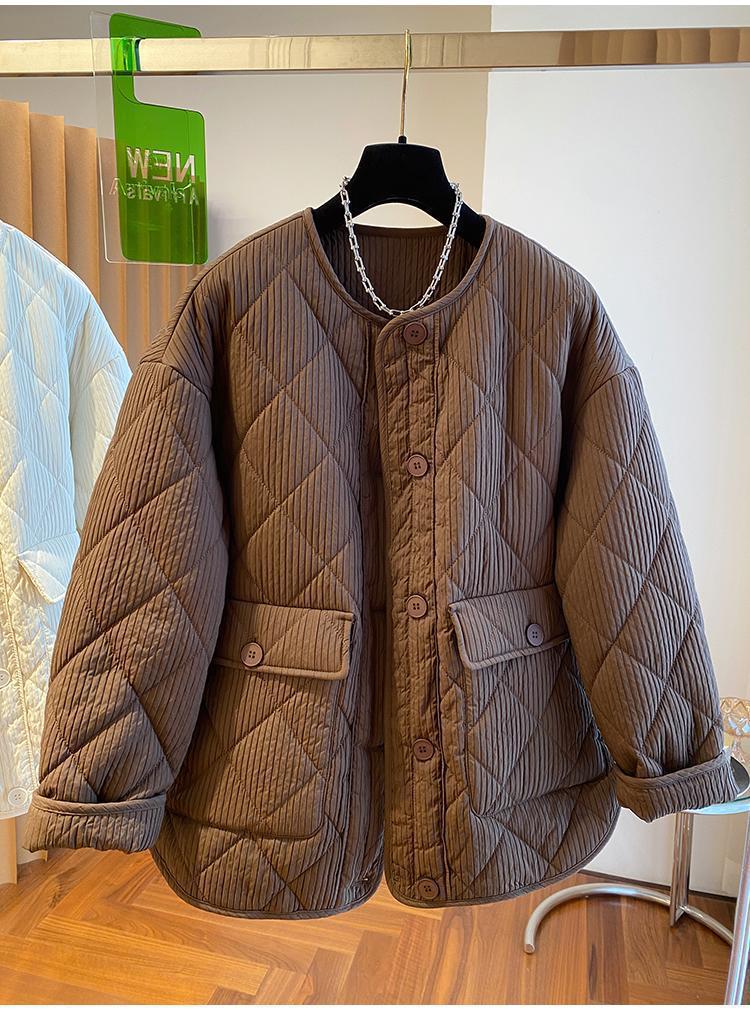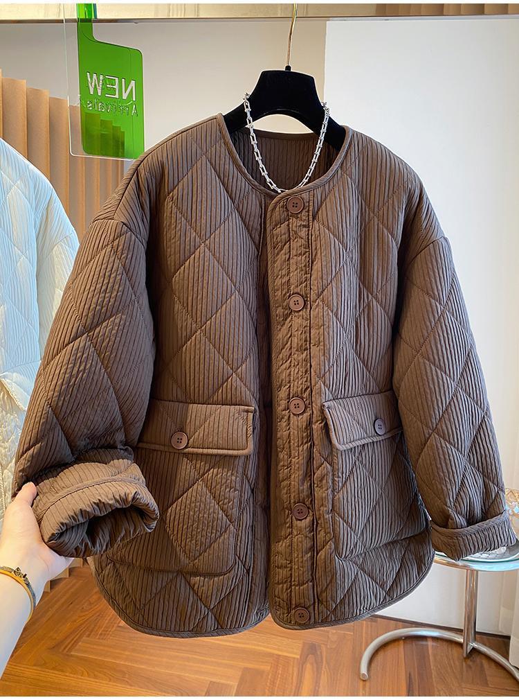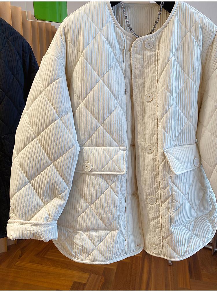雀说 新款休闲无领菱形格棉服女冬季简单设计感圆领棉衣外套4ZF-62569