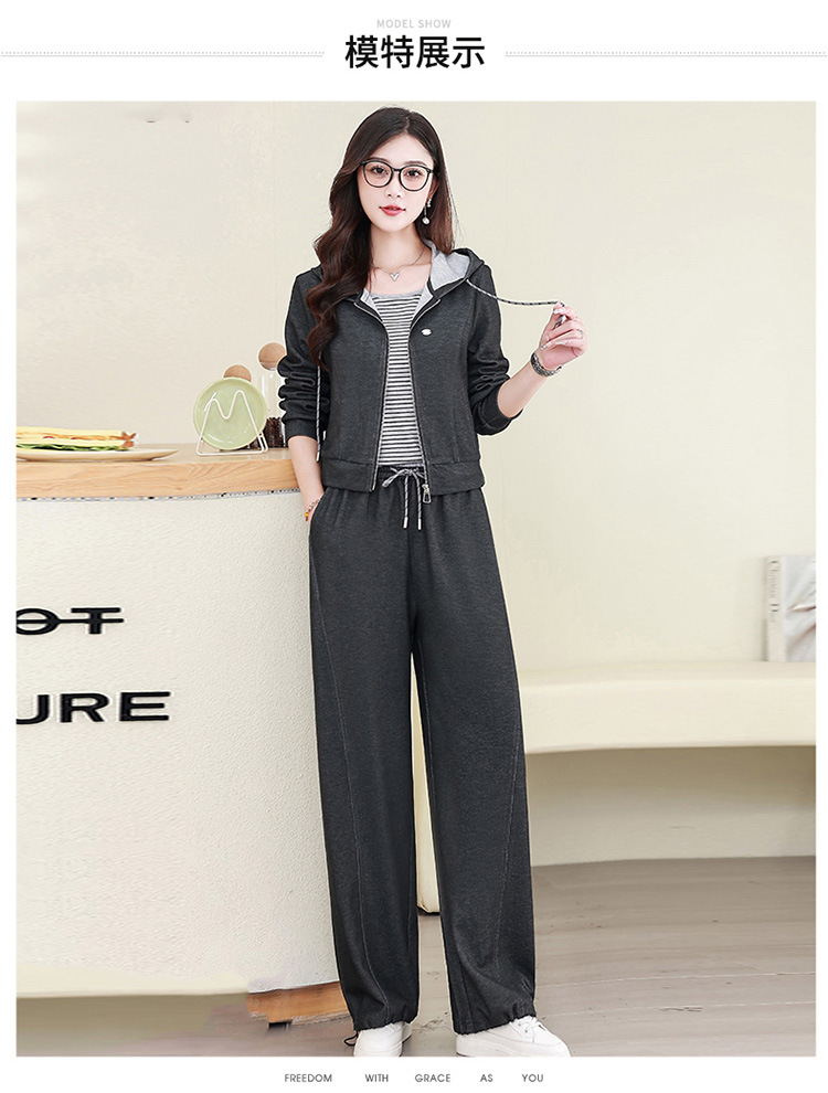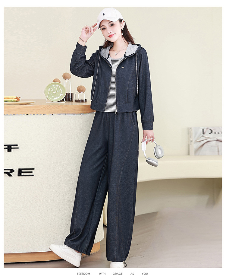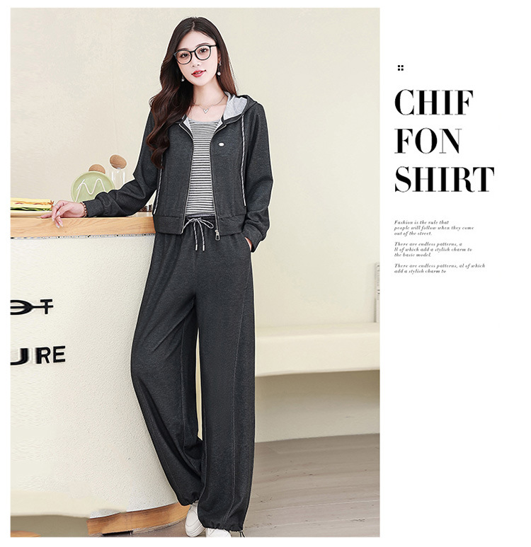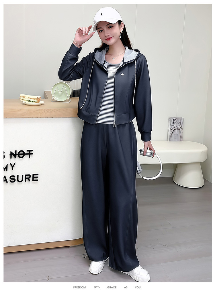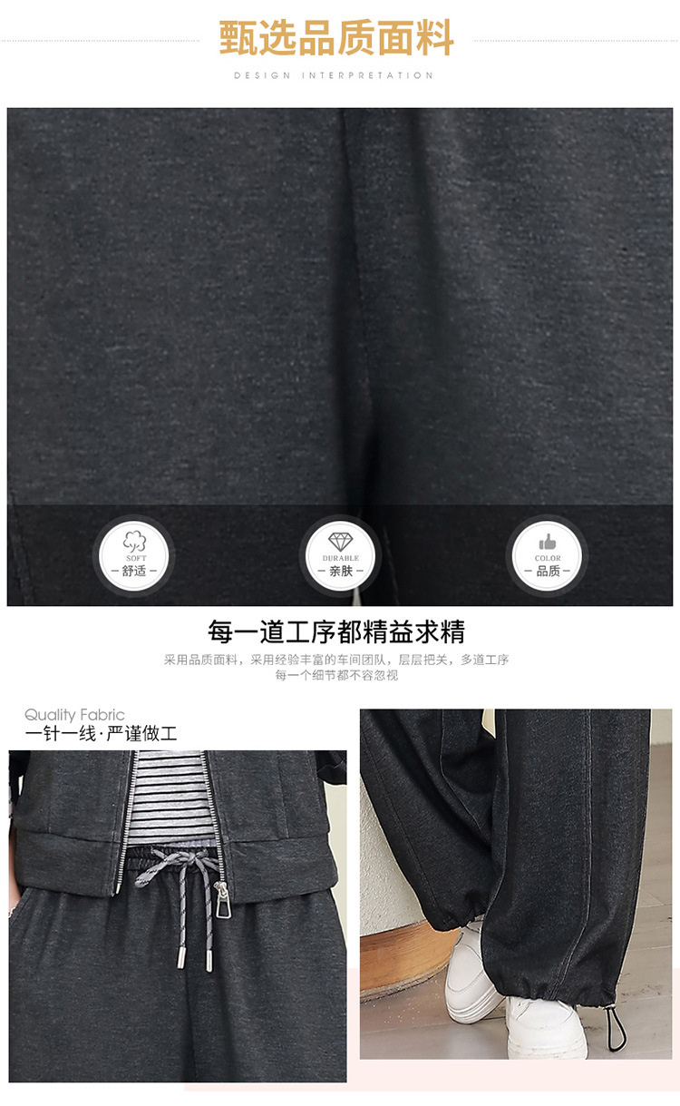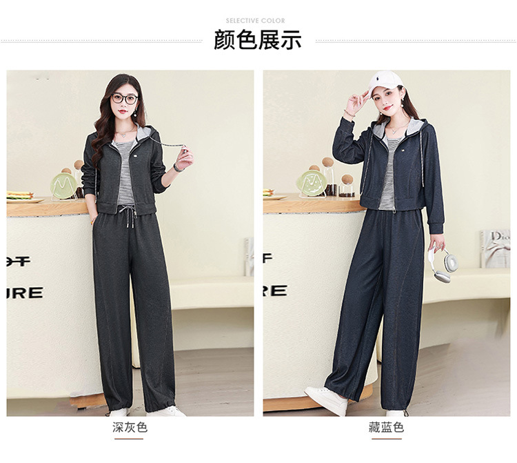 QYM 7701-Y时尚运动三件套条纹小衫+外套+阔腿长裤休闲套装