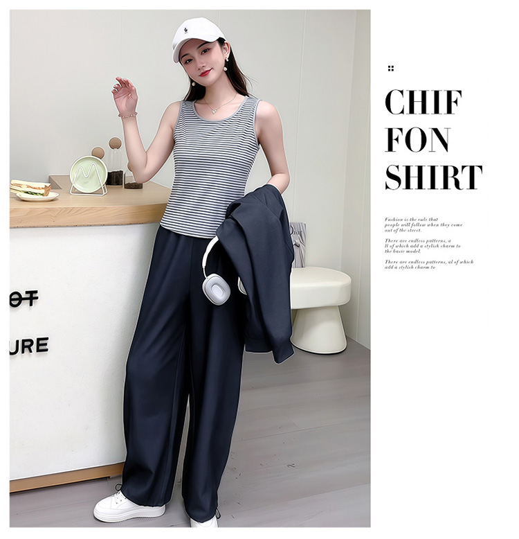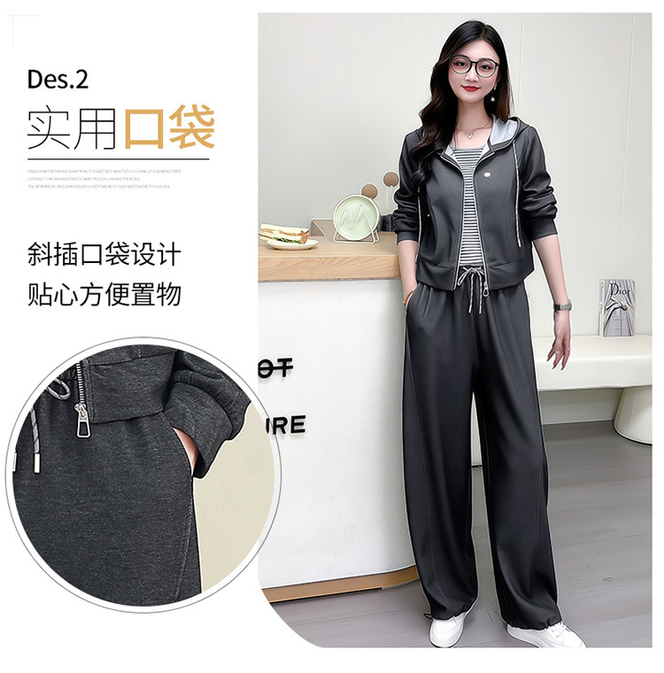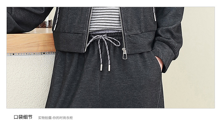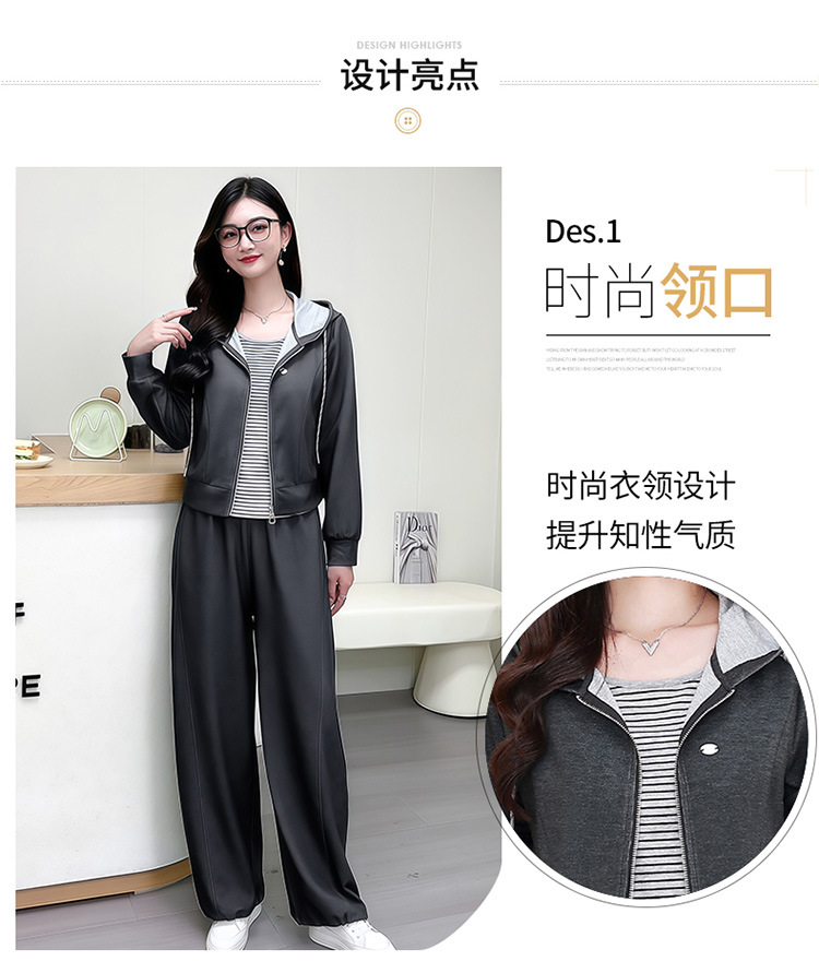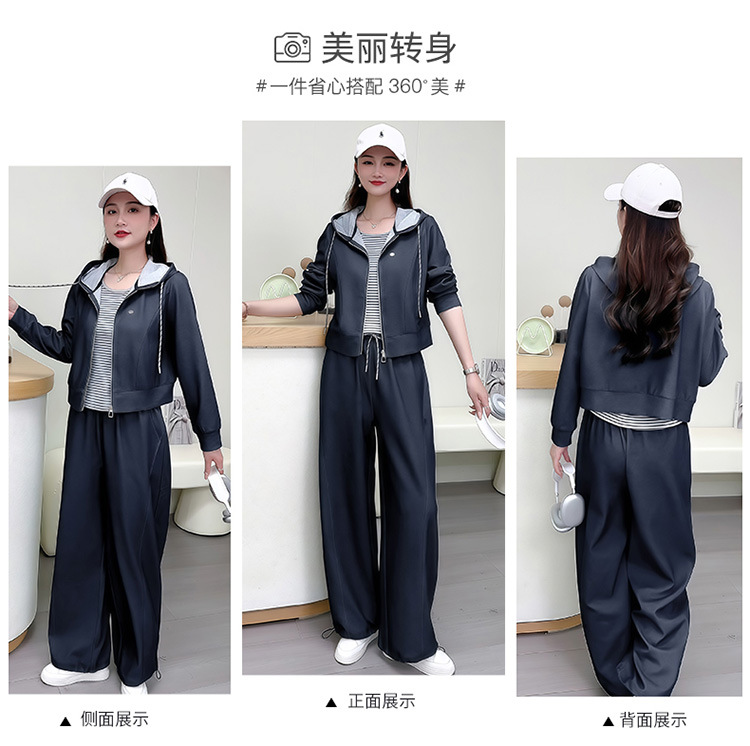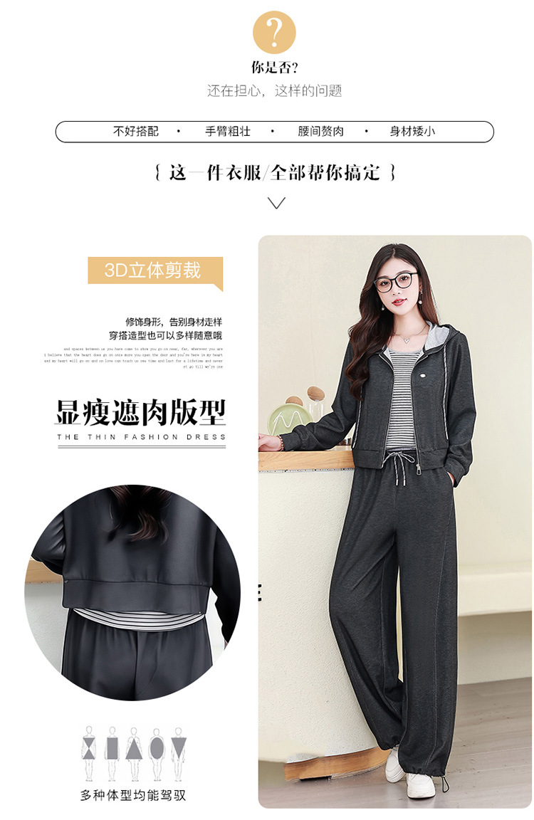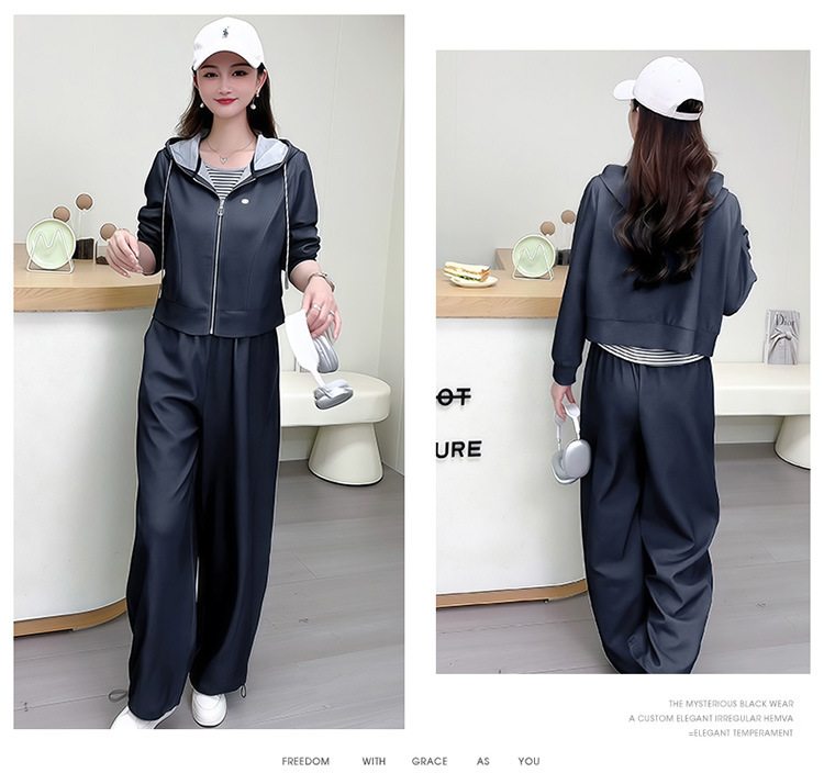 QYM 7701-Y时尚运动三件套条纹小衫+外套+阔腿长裤休闲套装