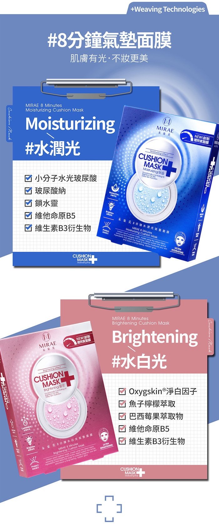 未来美8分钟气垫面膜4片#蓝色水润光/#粉色水白光👍就像气垫粉饼一样,面膜采用4D立体蜂巢的设计,其纤维高达28000个超微导孔👀,紧紧服贴脸部锁住水乳精华,只需8️⃣分钟,就能渗透传导精华成分到肌肤底。💙#蓝色入门款,主打保湿💦+提亮✨,深层保湿配方有效提升含水量,让肌肤水嫩发亮!适合全肤质日常使用。/💖#粉色进阶款,主打加强亮白✨✨,深层亮白配方让肌肤透出光,就像内建LED等发光,适合追求白皙肌肤的人群使用。