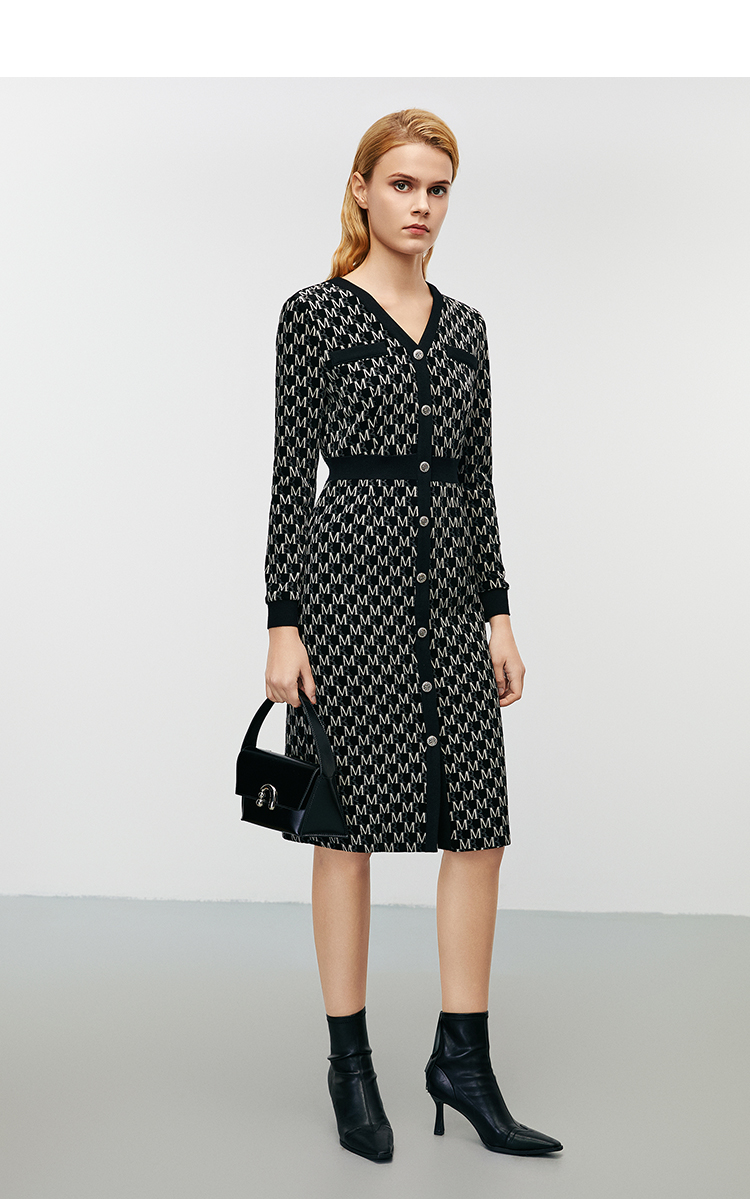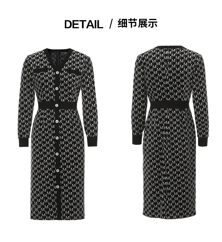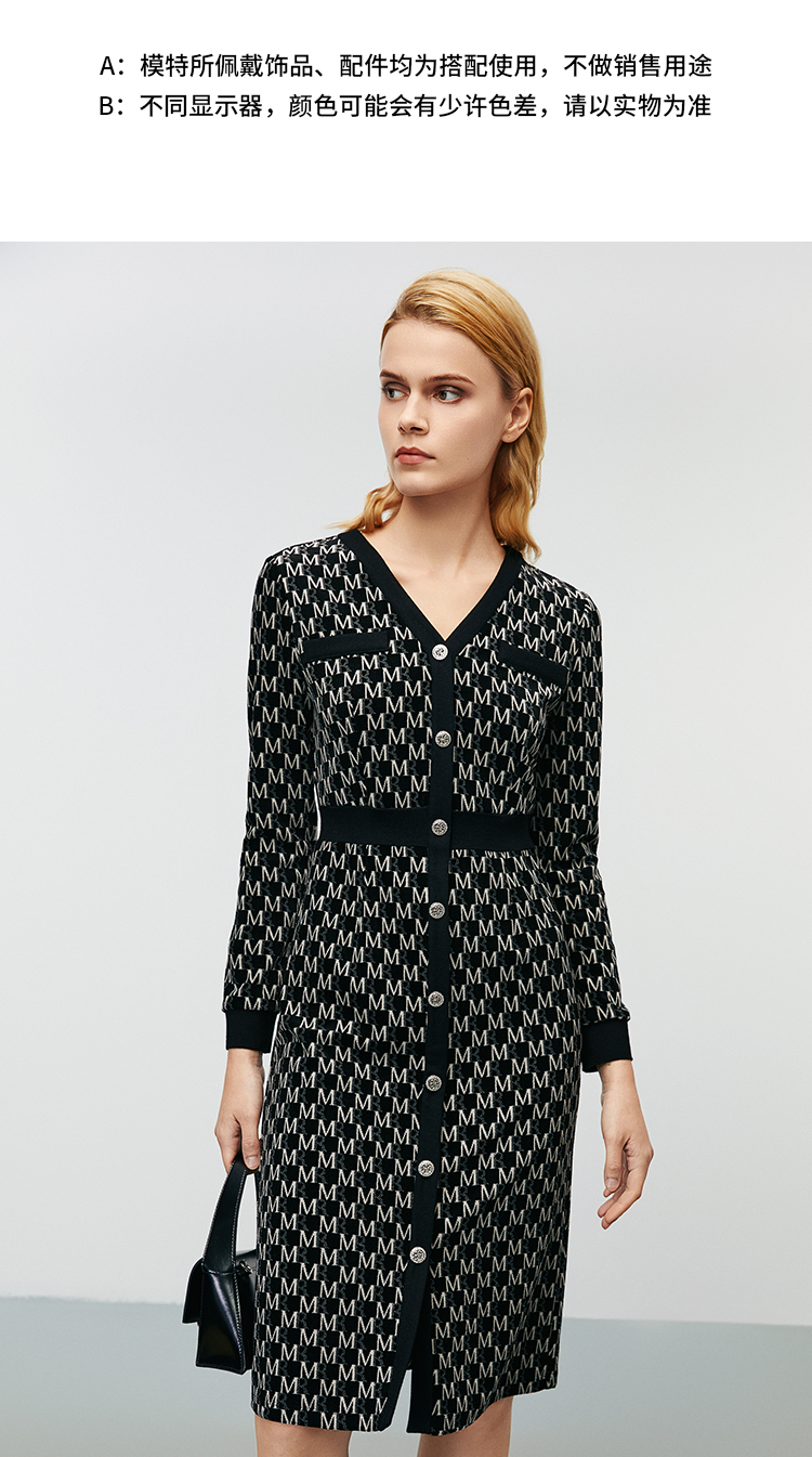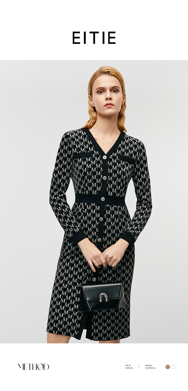 EITIE爱特爱冬季新款气质V领高腰显瘦印花连衣裙8007711