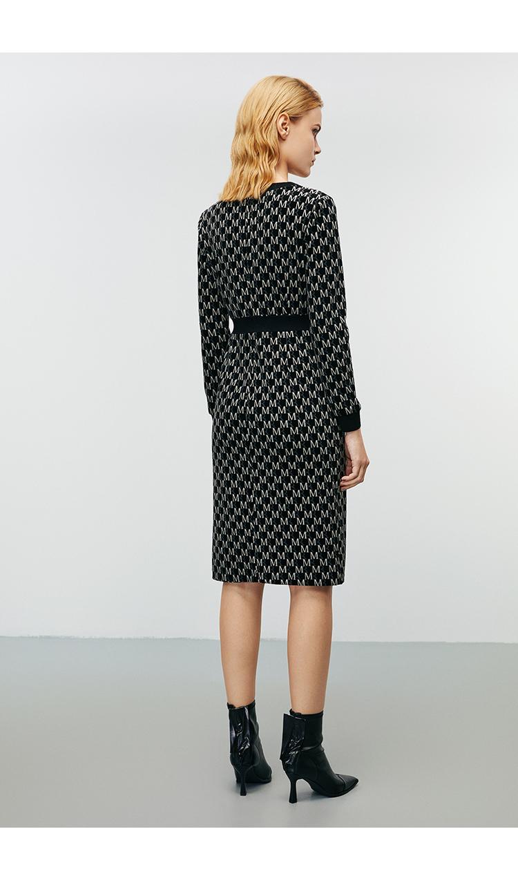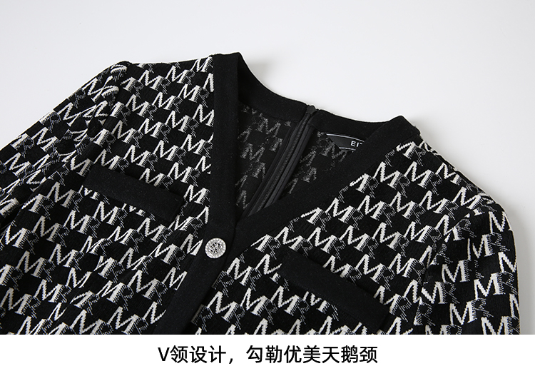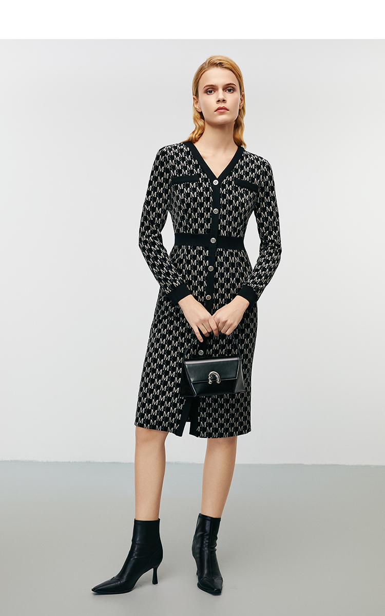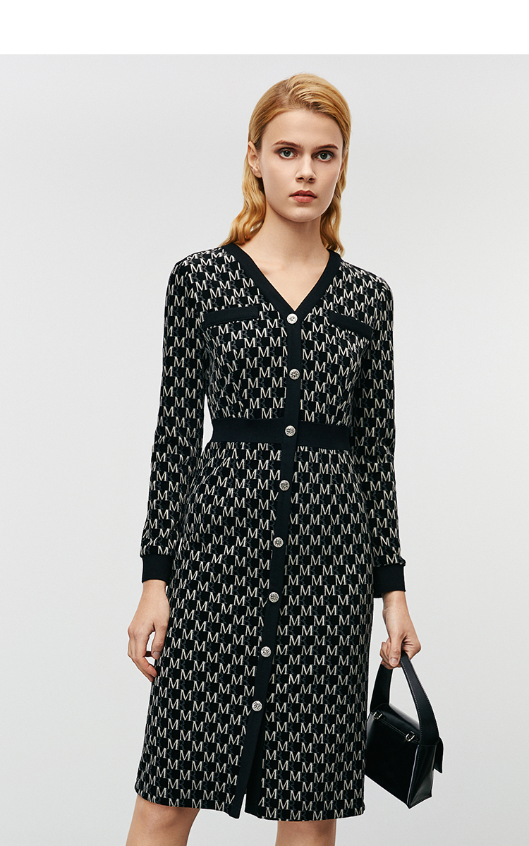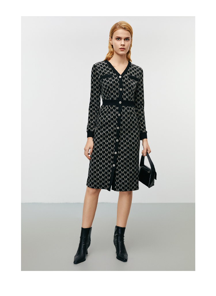 EITIE爱特爱冬季新款气质V领高腰显瘦印花连衣裙8007711