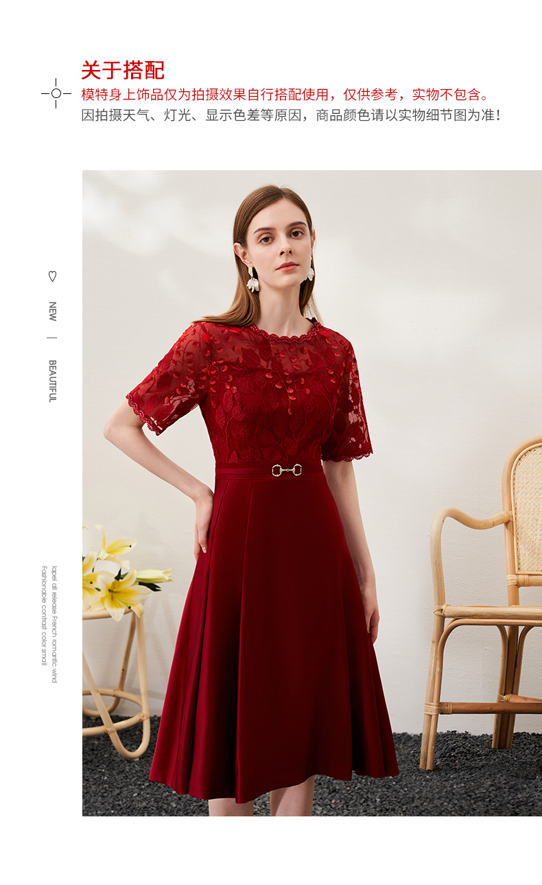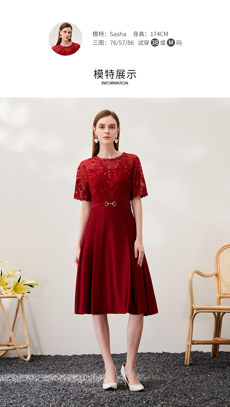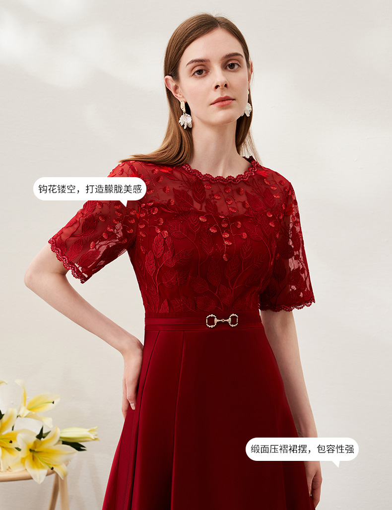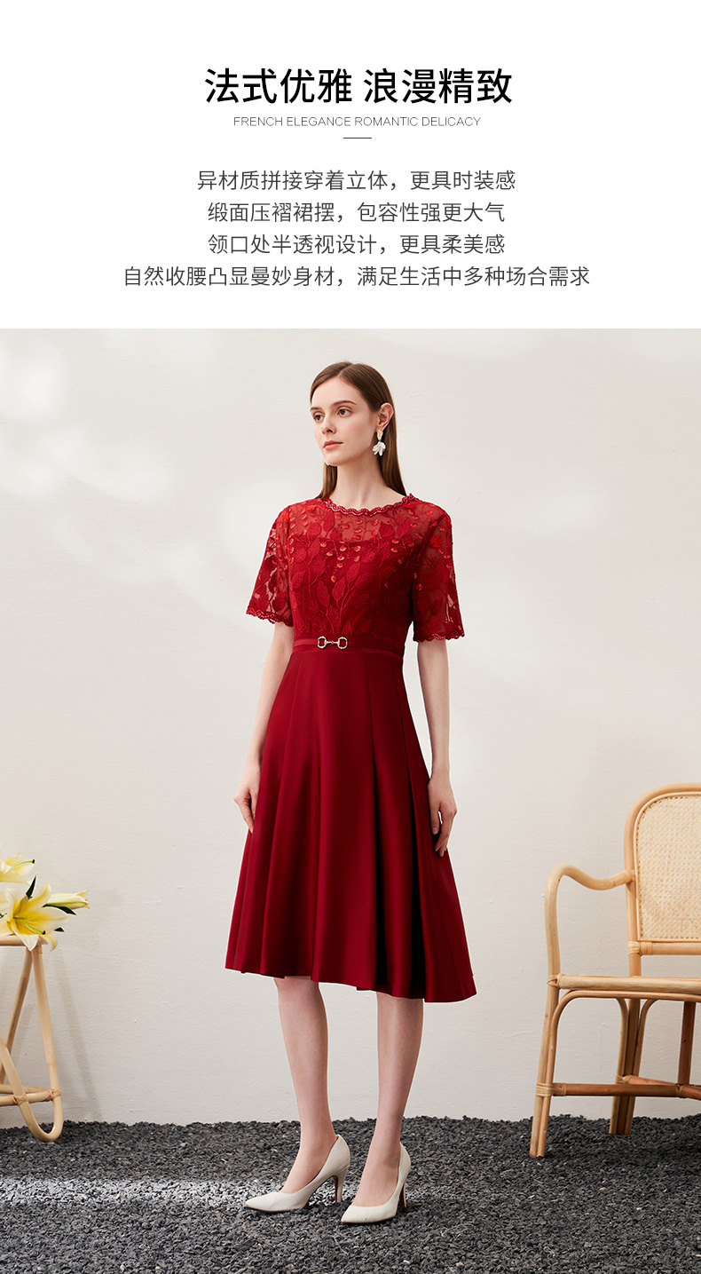 EITIE爱特爱春季新款气质翻领镂空蕾丝七分袖连衣裙女中裙A2007405
