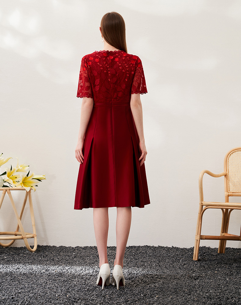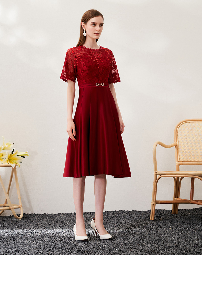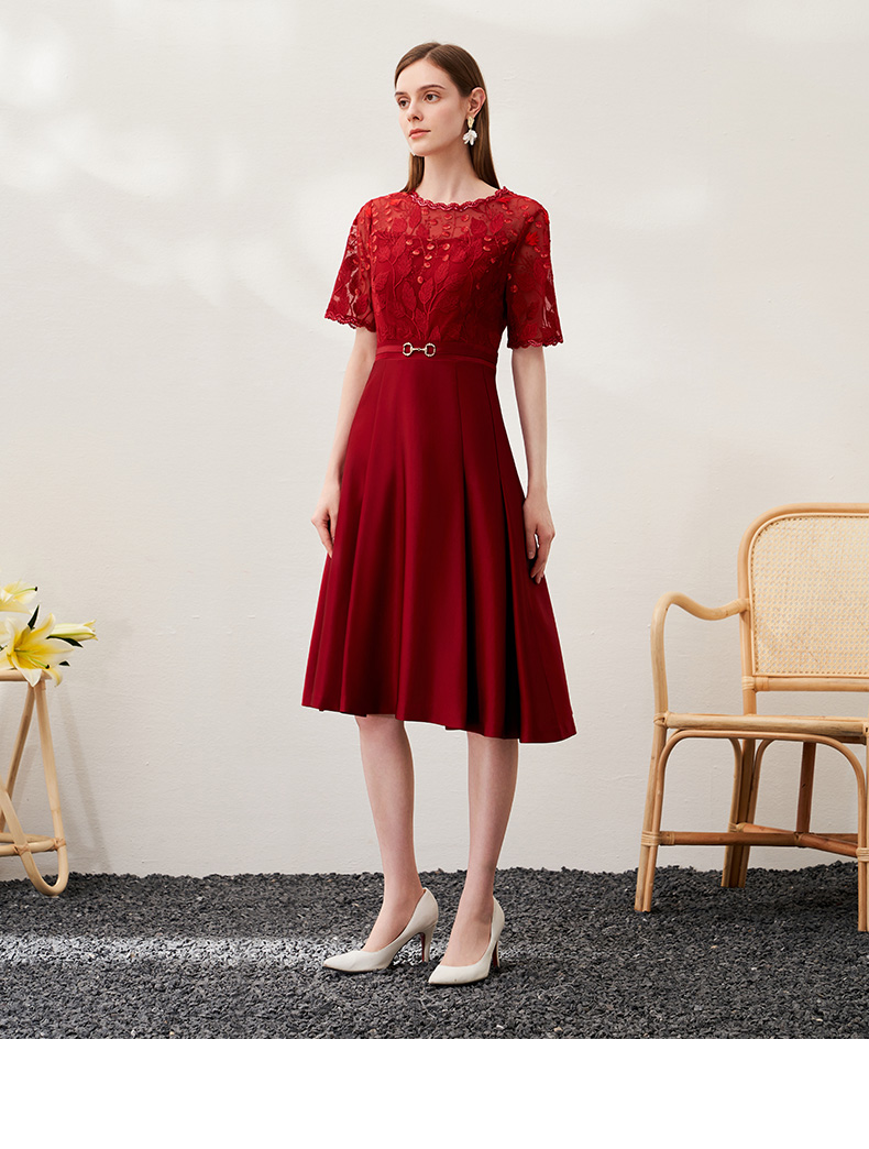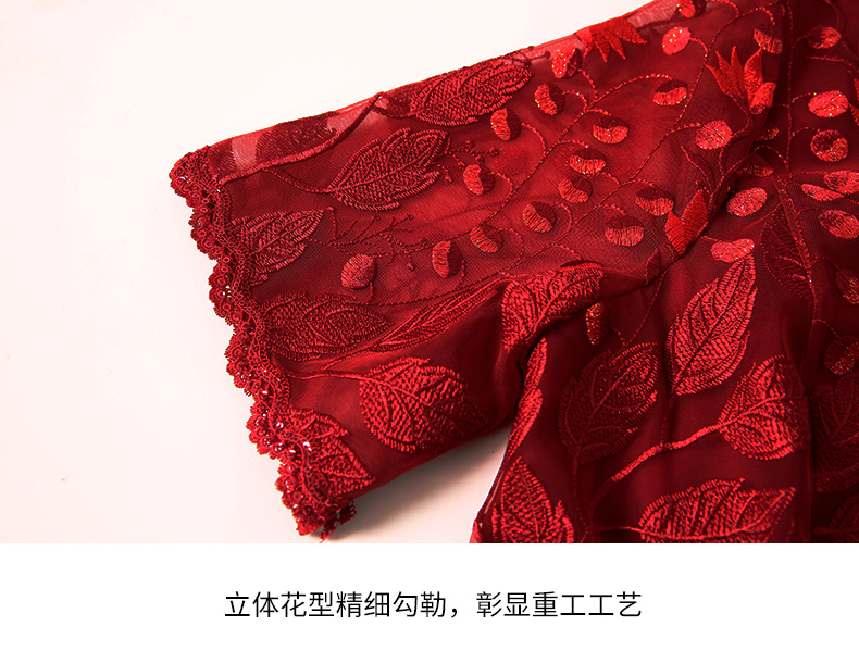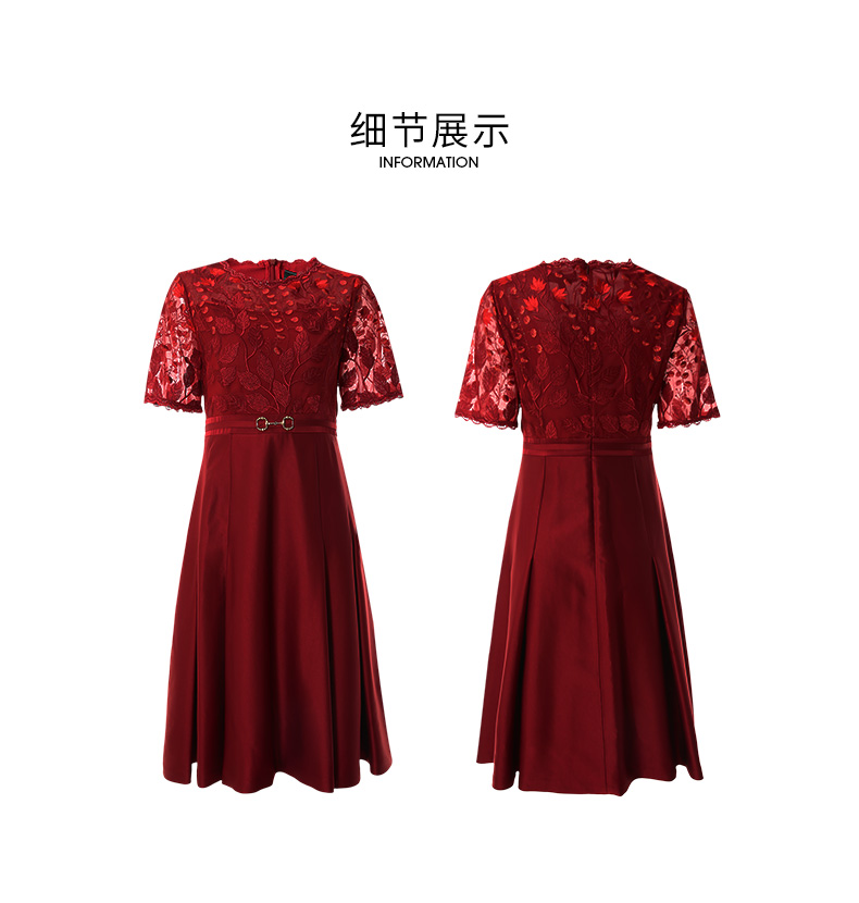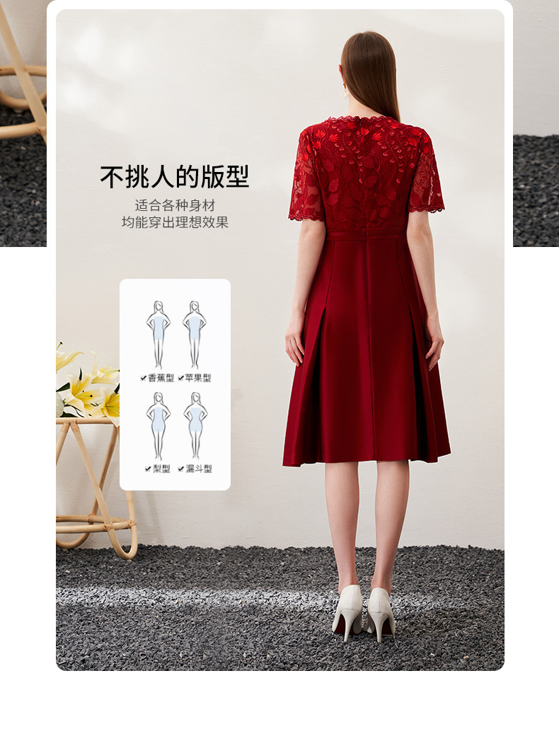 EITIE爱特爱春季新款气质翻领镂空蕾丝七分袖连衣裙女中裙A2007405