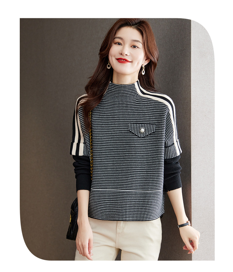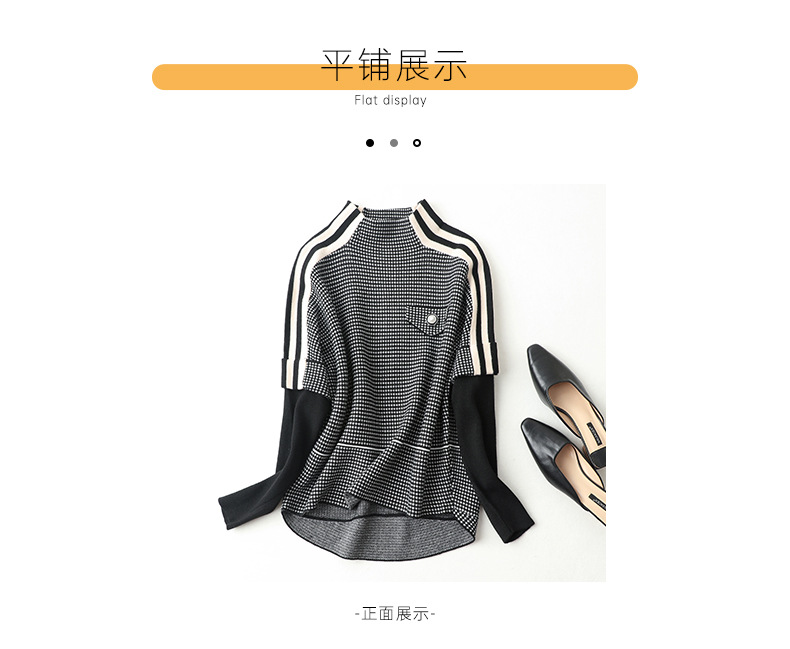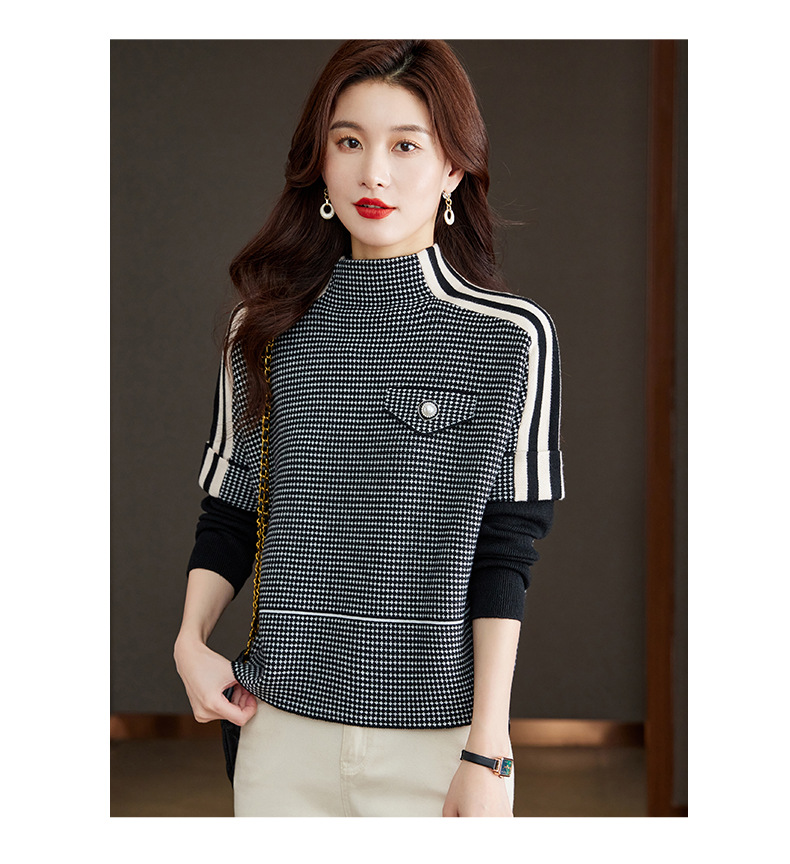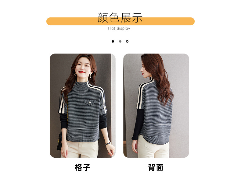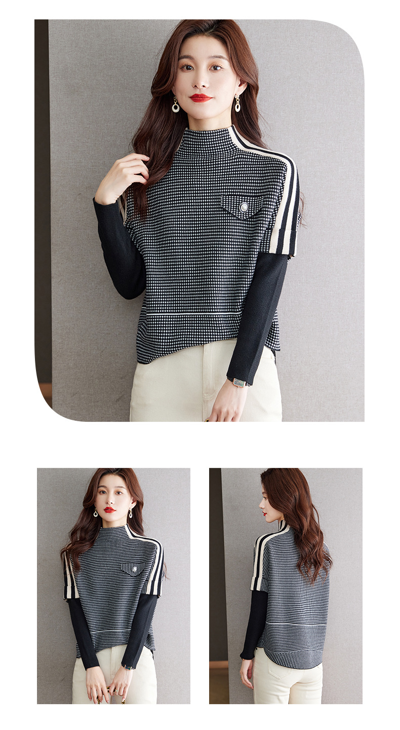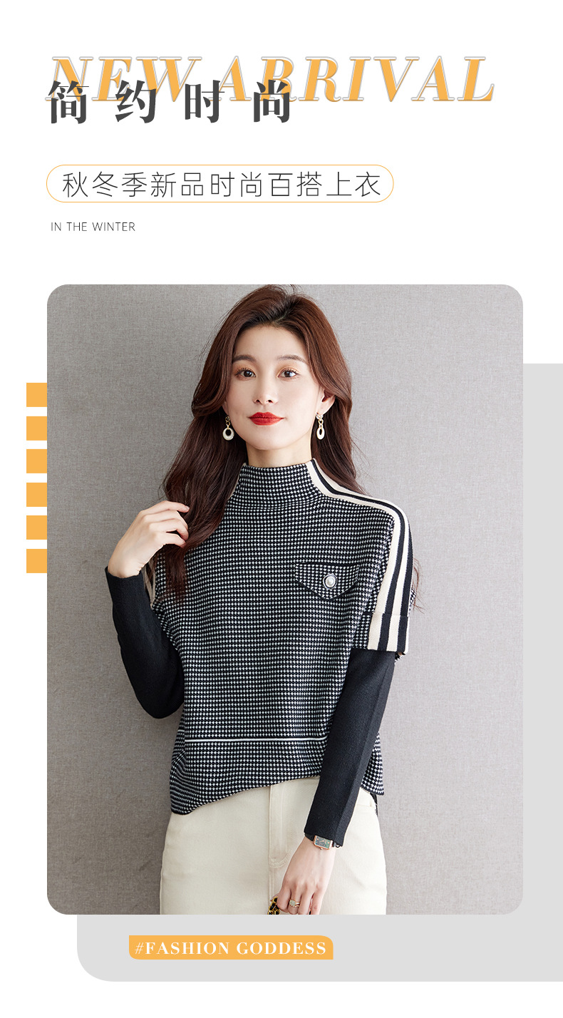 半高领细格纹毛衣,女秋冬新款假两件拼接长袖打底针织衫CC-JDS-8601