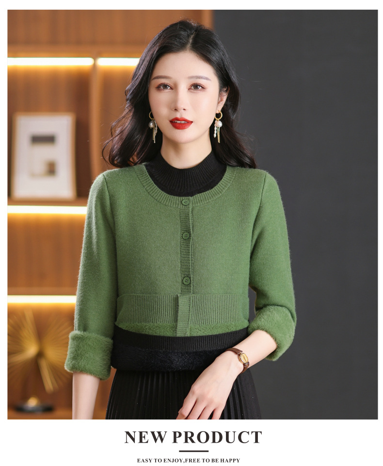 CC-103-26692半高领假两件加绒毛衣女2024新款秋冬时尚针织上衣内搭保暖打底衫