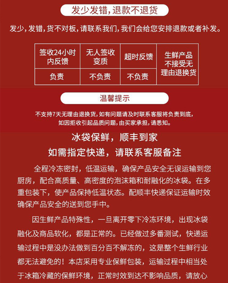 【关于售后】因产品的特殊性(生鲜冻品类),不支持七天无理由退货,收到后如有少货,破损等情况,请签收后24小时内联系客服处理!