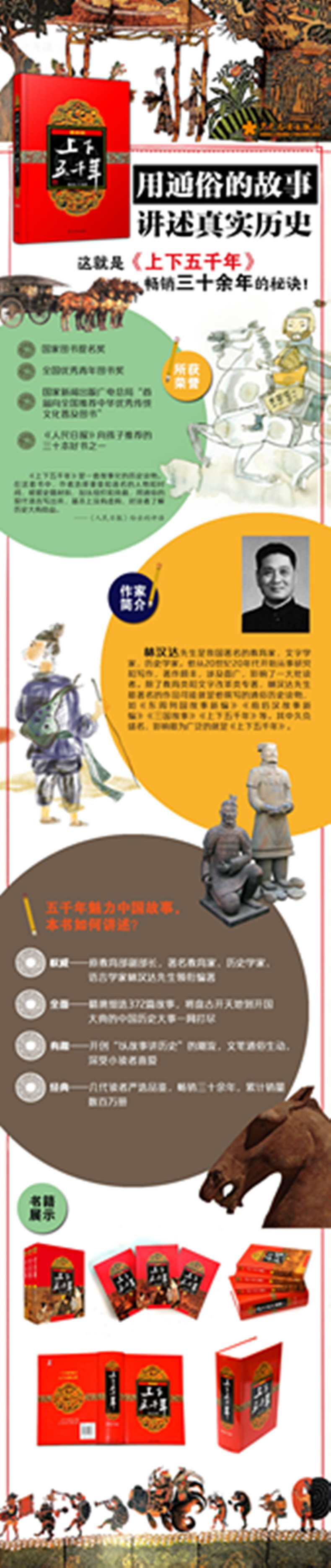 这次推出的《*版上下五千年》,将全书内容延至中华人民共和国成立,并将篇目从早期的262篇扩充到372篇,内容涵盖政治、军事、科技、文化、经济、艺术、民族、法律、外交、教育等诸多方面,讲述了从盘古开天辟地到1949年新中国诞生的中华五千年历史。这里不仅有斑斓瑰丽的上古创世神话,有斗智斗勇的春秋战国谋略故事,也有天下一统的秦汉雄风和战事纷扰的三国故事,有气势恢弘、文采精华的唐宋故事和跌宕起伏的元明清朝代更替,还有近代史上的受辱与抗争,以及浴火重生的新中国的建立。