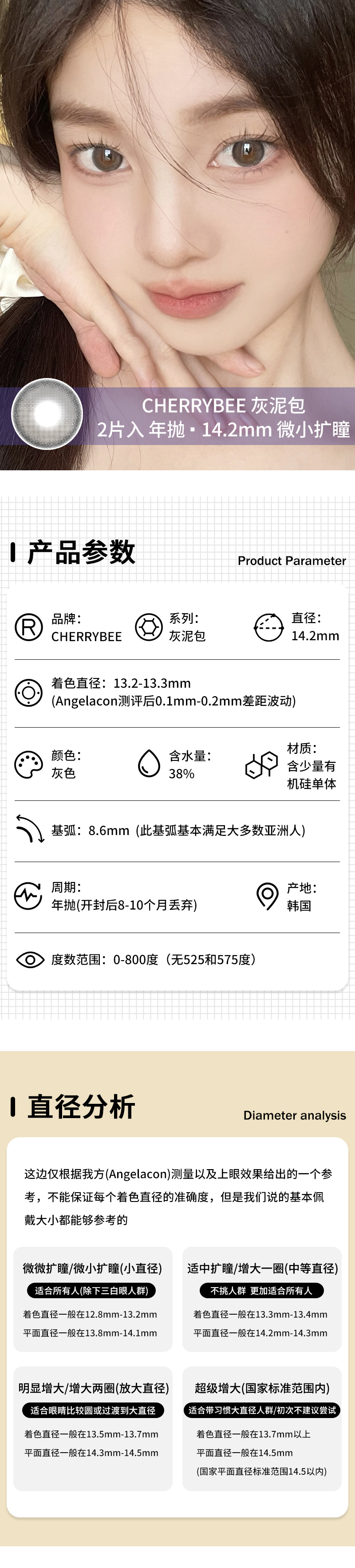 CHERRYBEE / 灰泥包 / 2片入 / 美瞳年抛 / 14.2mm / 微小扩瞳融瞳自然心机通勤款