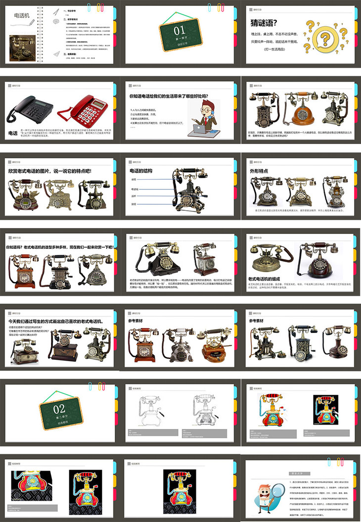 通过参考电话的图片,感受电话的不同造型,运用自己掌握的线条丰富电话的形态,对电话装饰出丰富的花纹。在装饰时,直线、曲线、螺旋线、交叉线等等都可以成为装饰的图案,但是对这些元素要合理的有规律的进行描绘,那样才能突出画面的装饰效果。