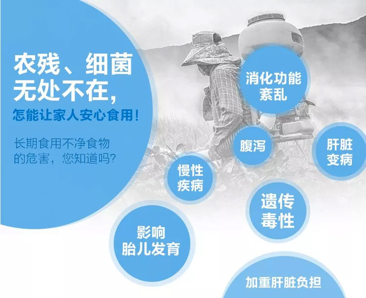 除了农残,我们对食品安全的各种担忧,它几乎都能解决:像干金针菇上的二氧化硫、苹果上的工业蜡、肉类的重金属残留等等,尤其是大家这段时间尤为关心的细菌、病毒。