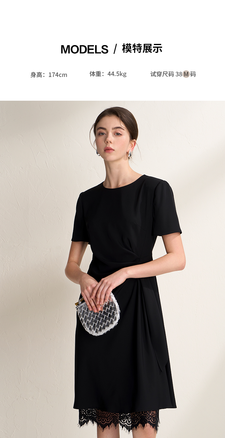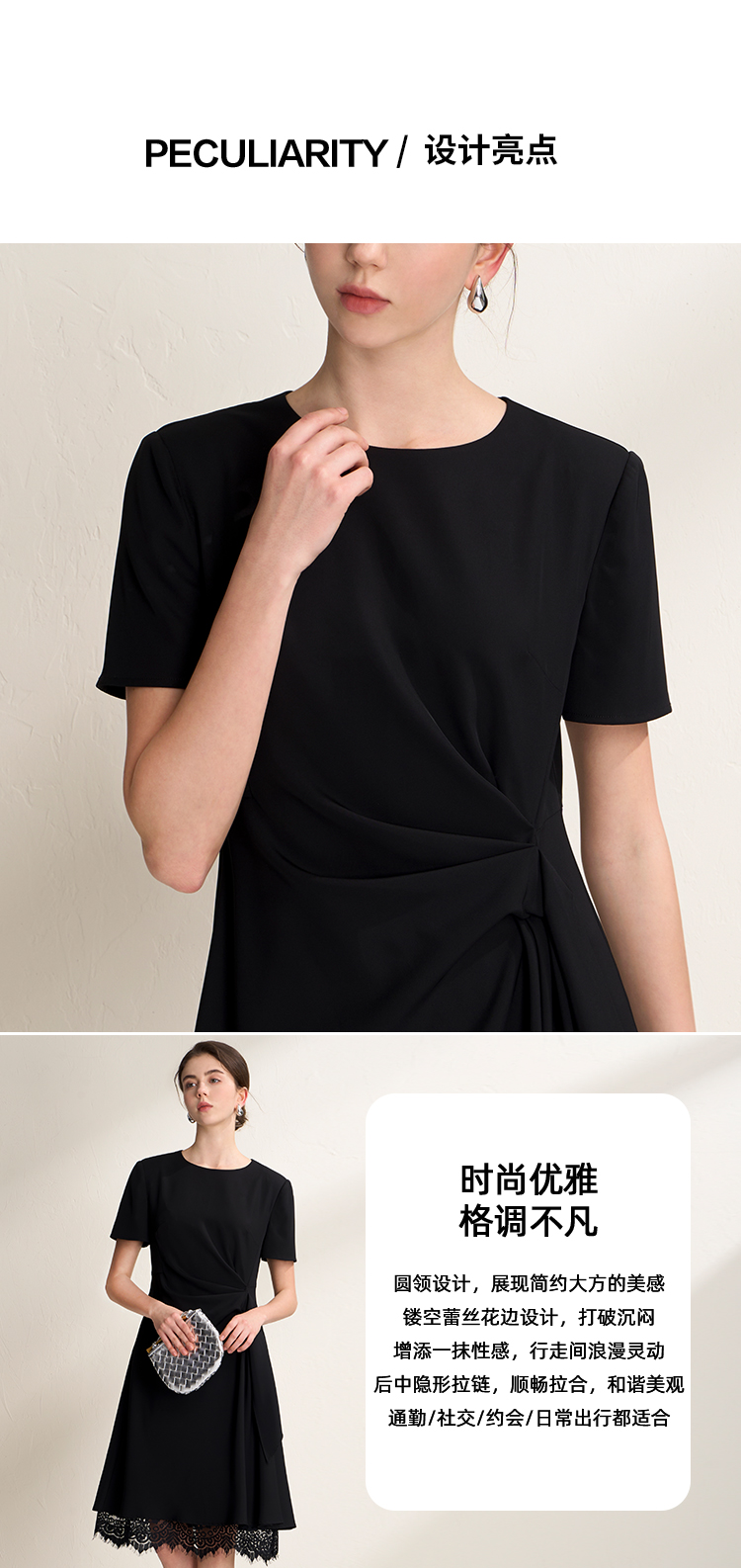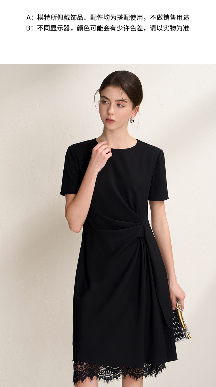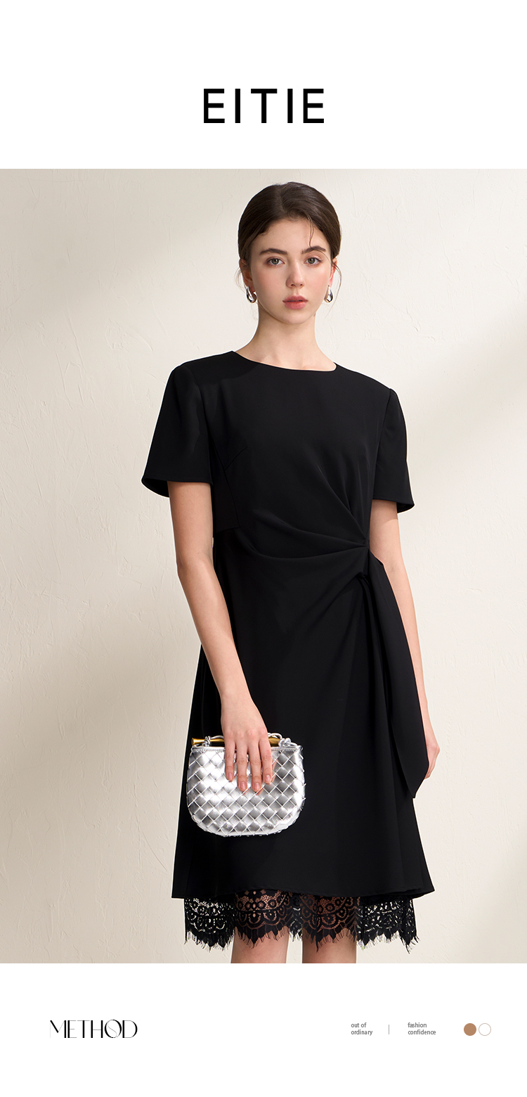 EITIE爱特爱优雅气质黑色拼接蕾丝花边短袖通勤连衣裙2026夏新款B2607204