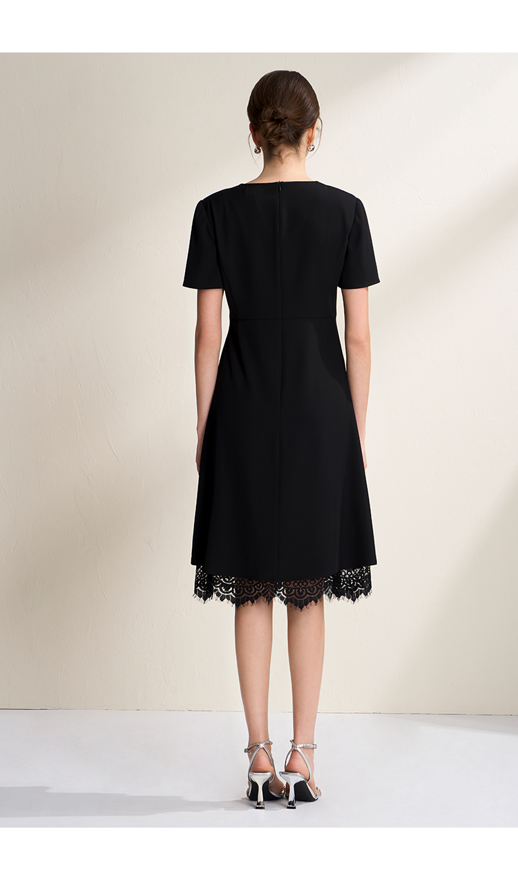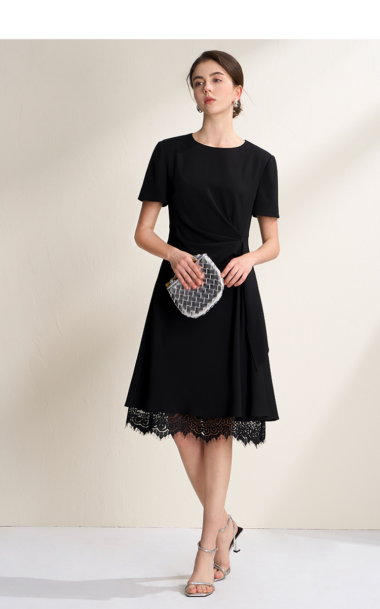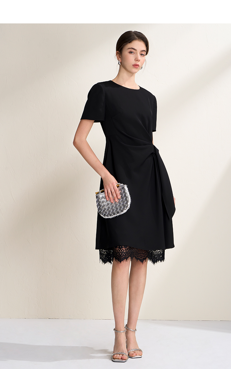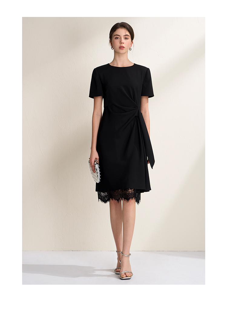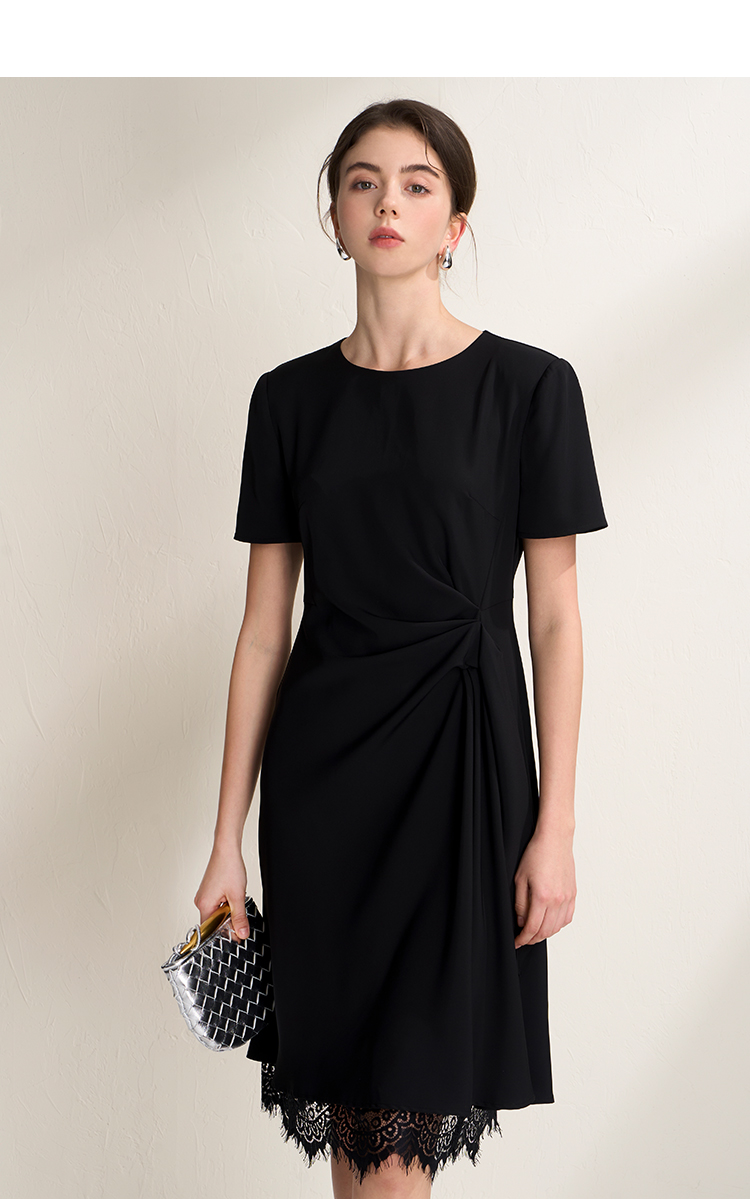 EITIE爱特爱优雅气质黑色拼接蕾丝花边短袖通勤连衣裙2026夏新款B2607204