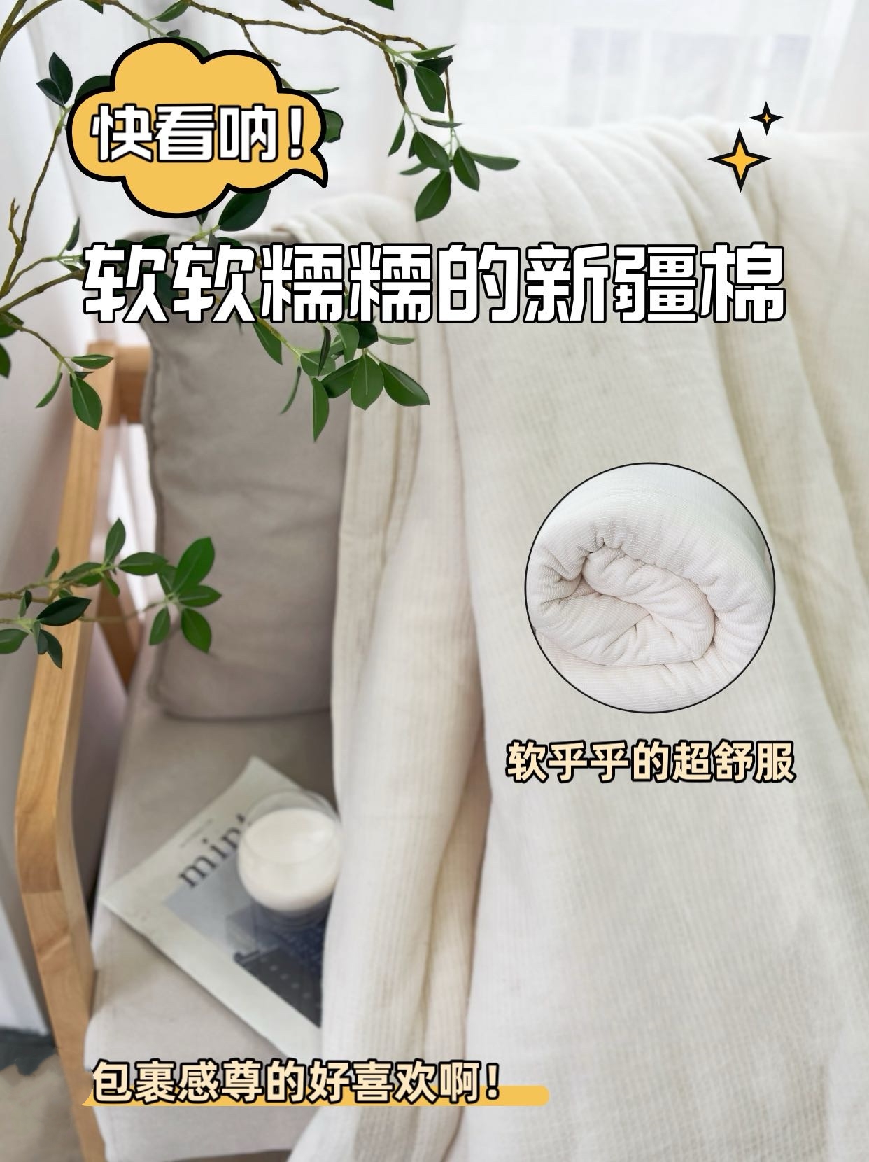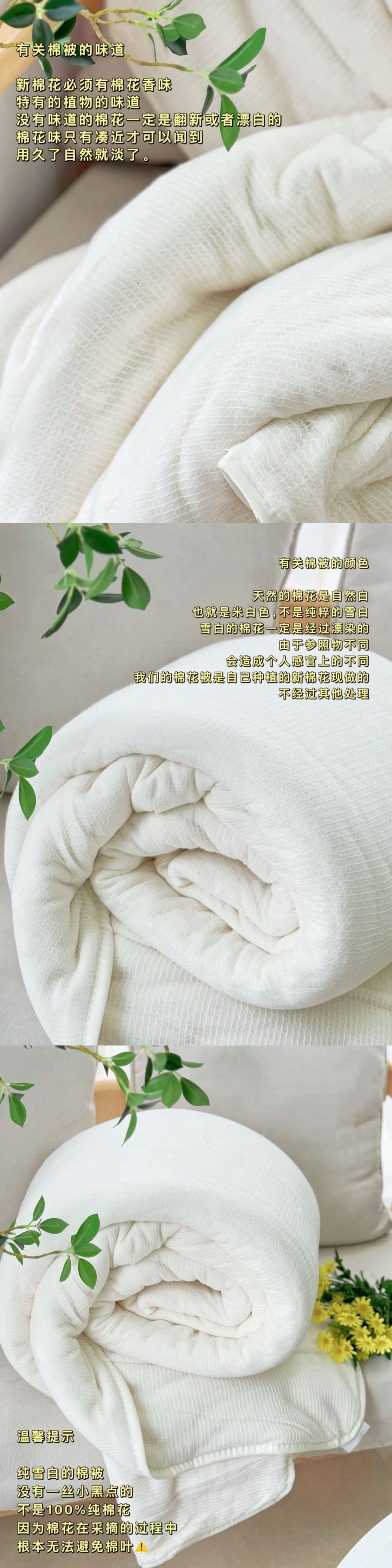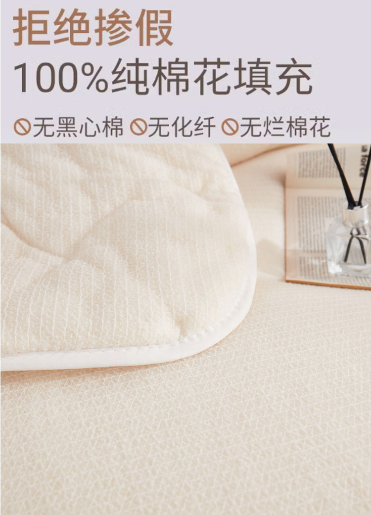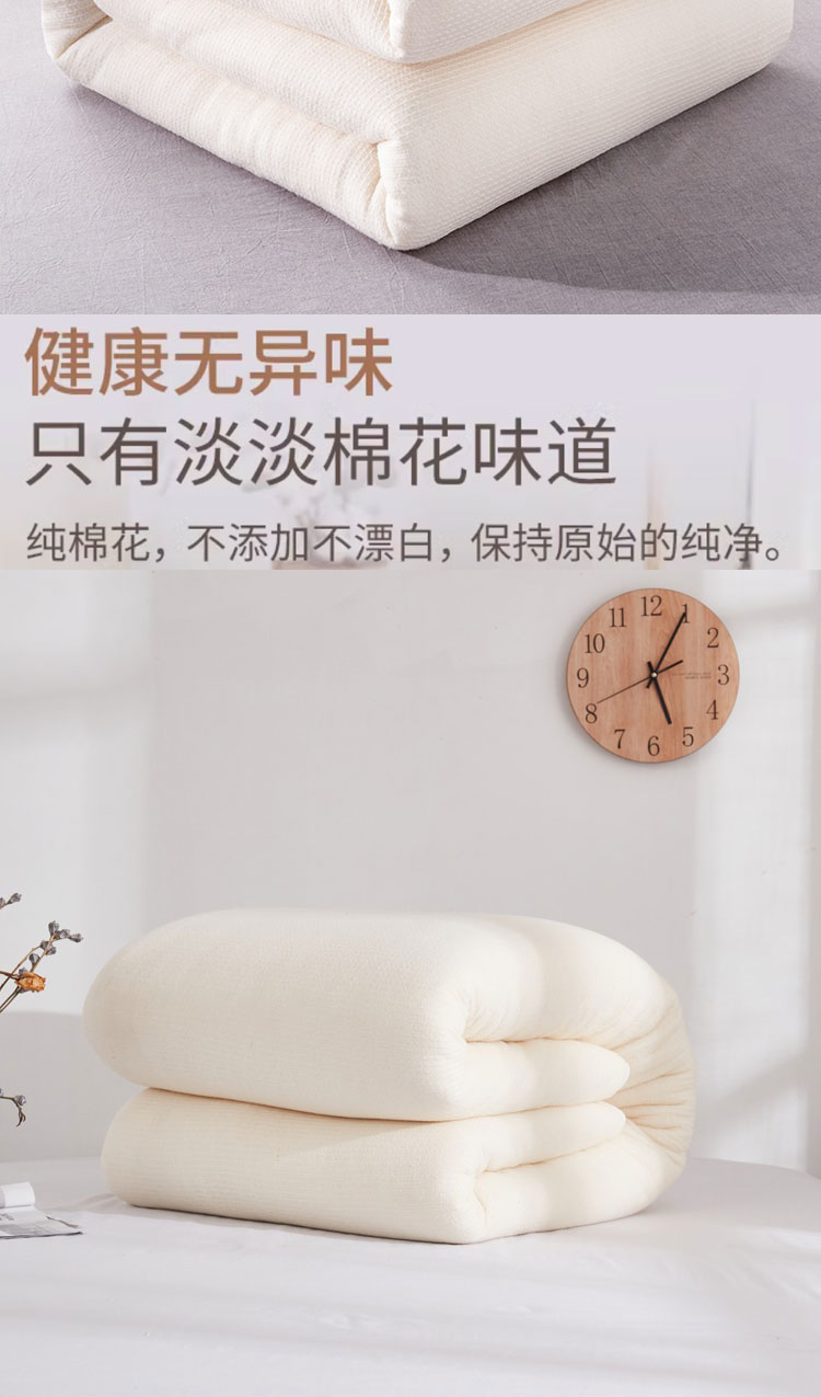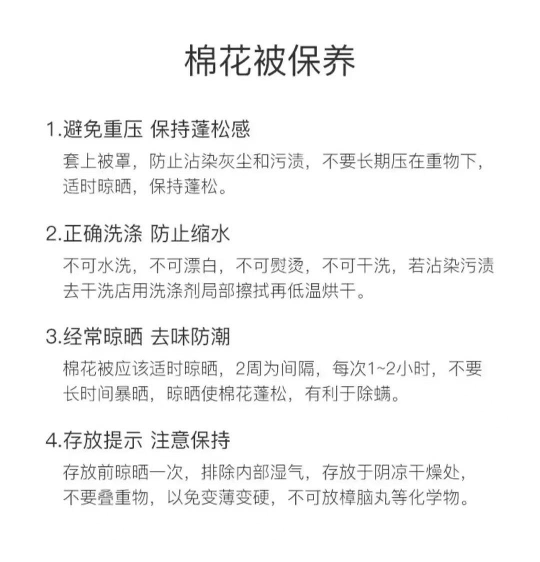 ⑤新棉被是全新棉花制作的会比较蓬松,先当做垫被压几天,使棉胎和网纱结合更紧实,装被套时不要太大力拉扯,另外注意拉能等尖锐物品不要挂住网纱。
