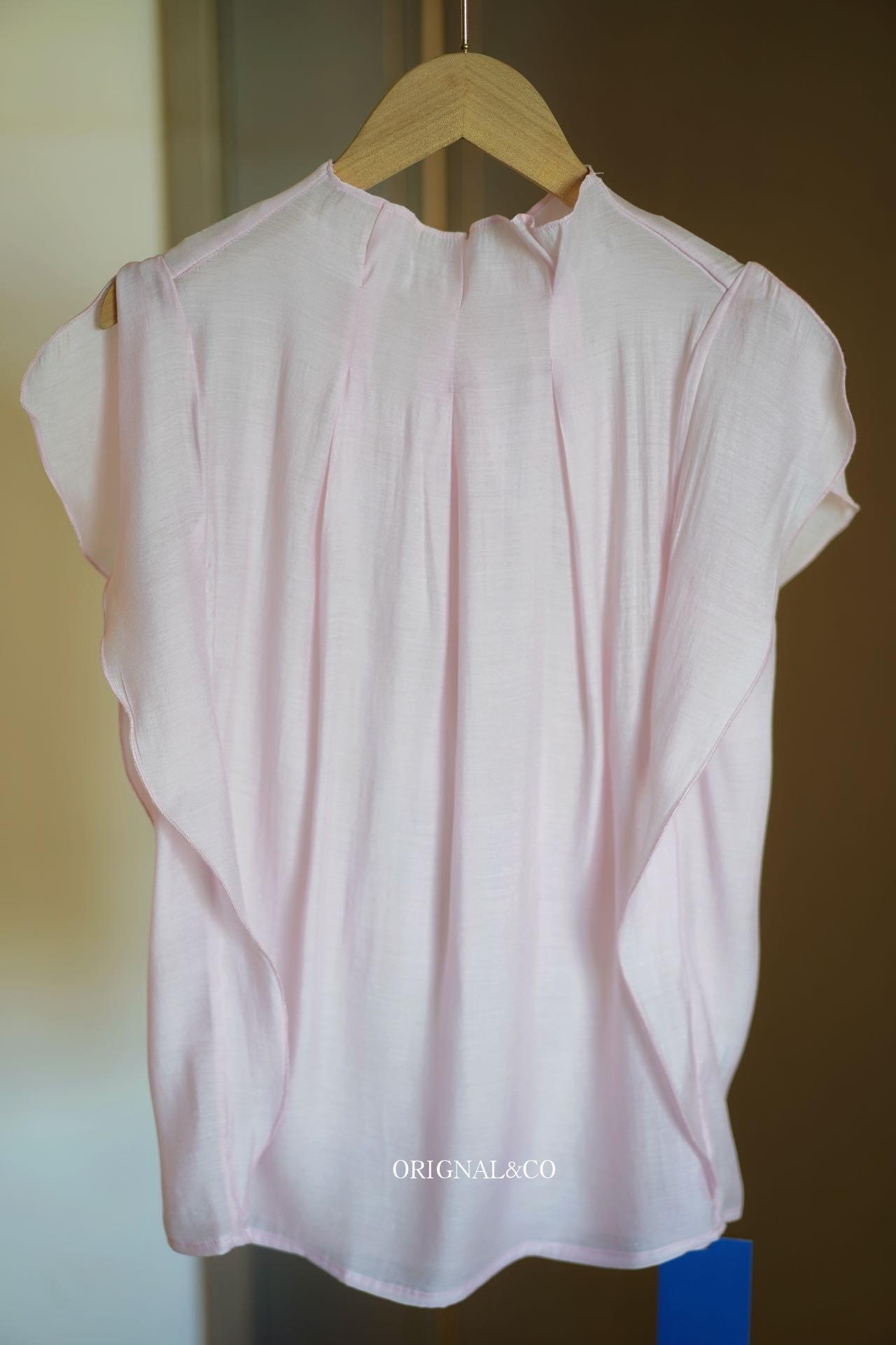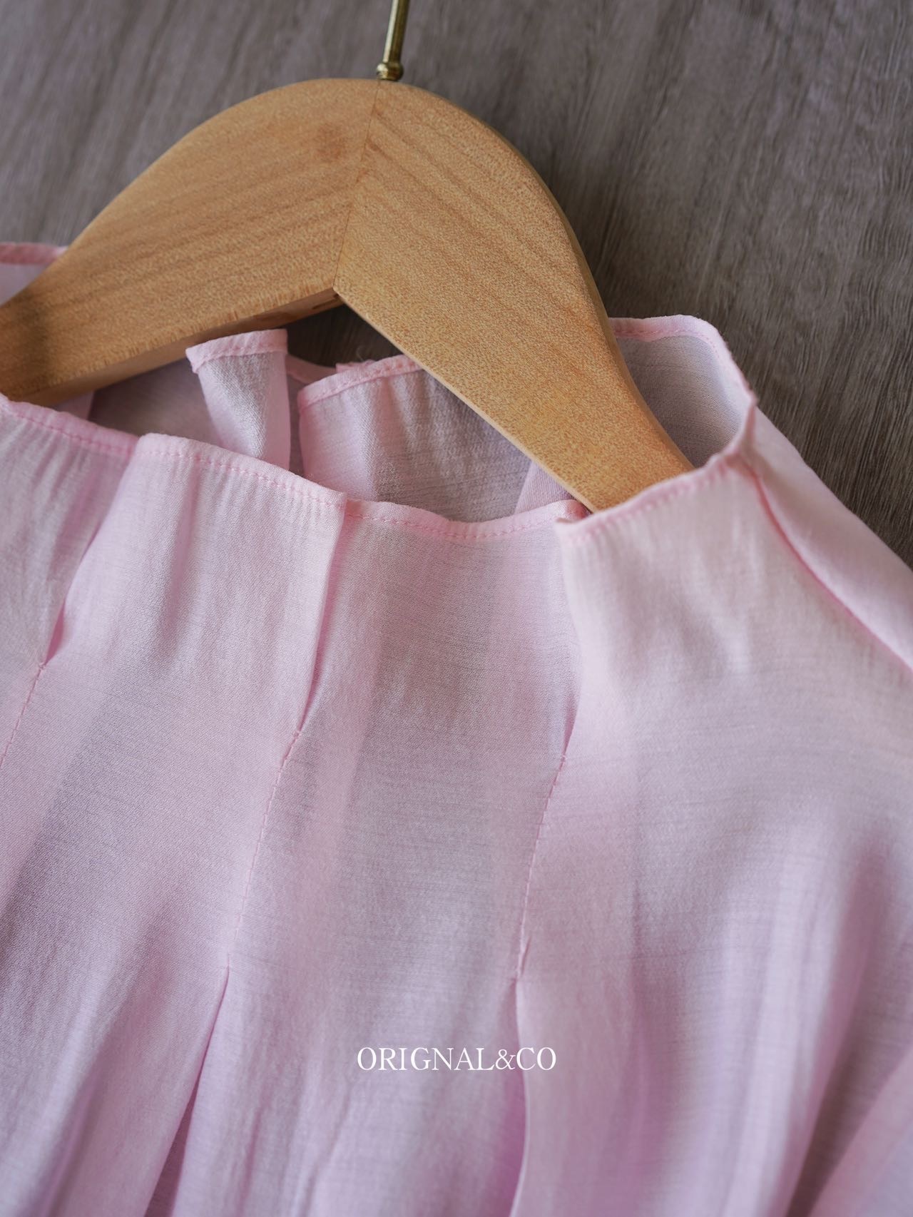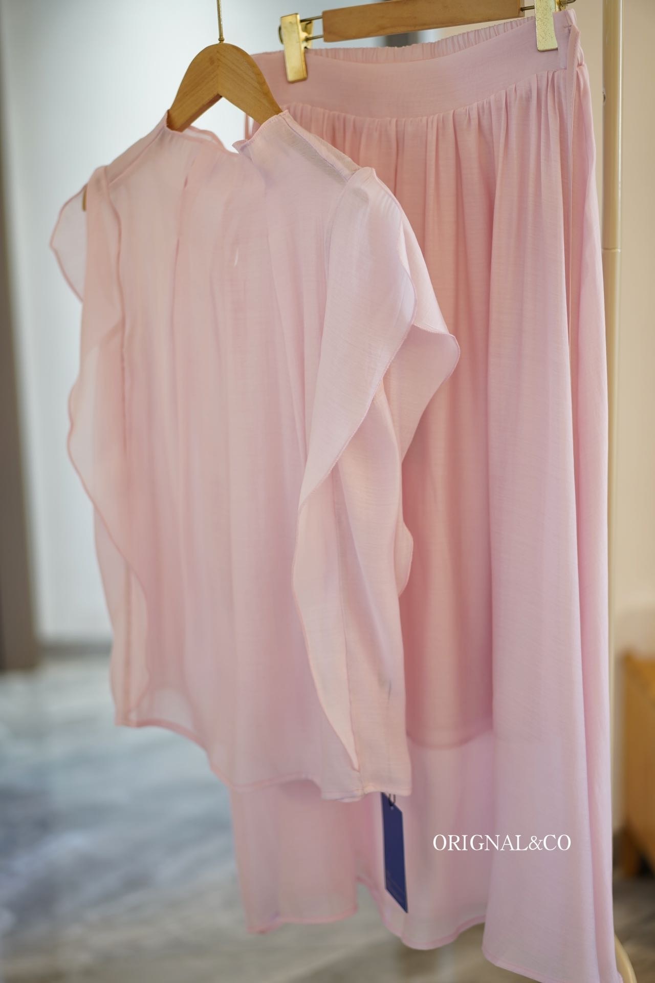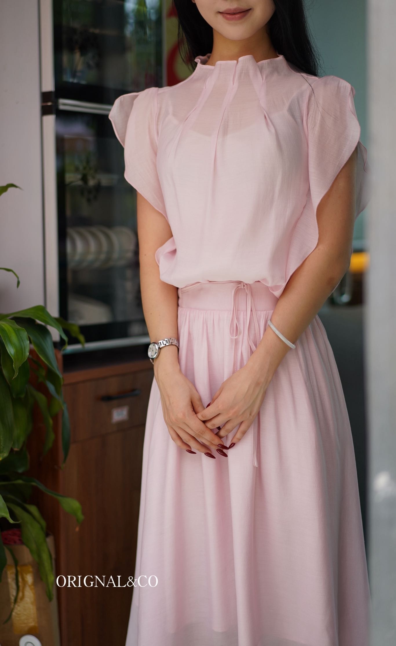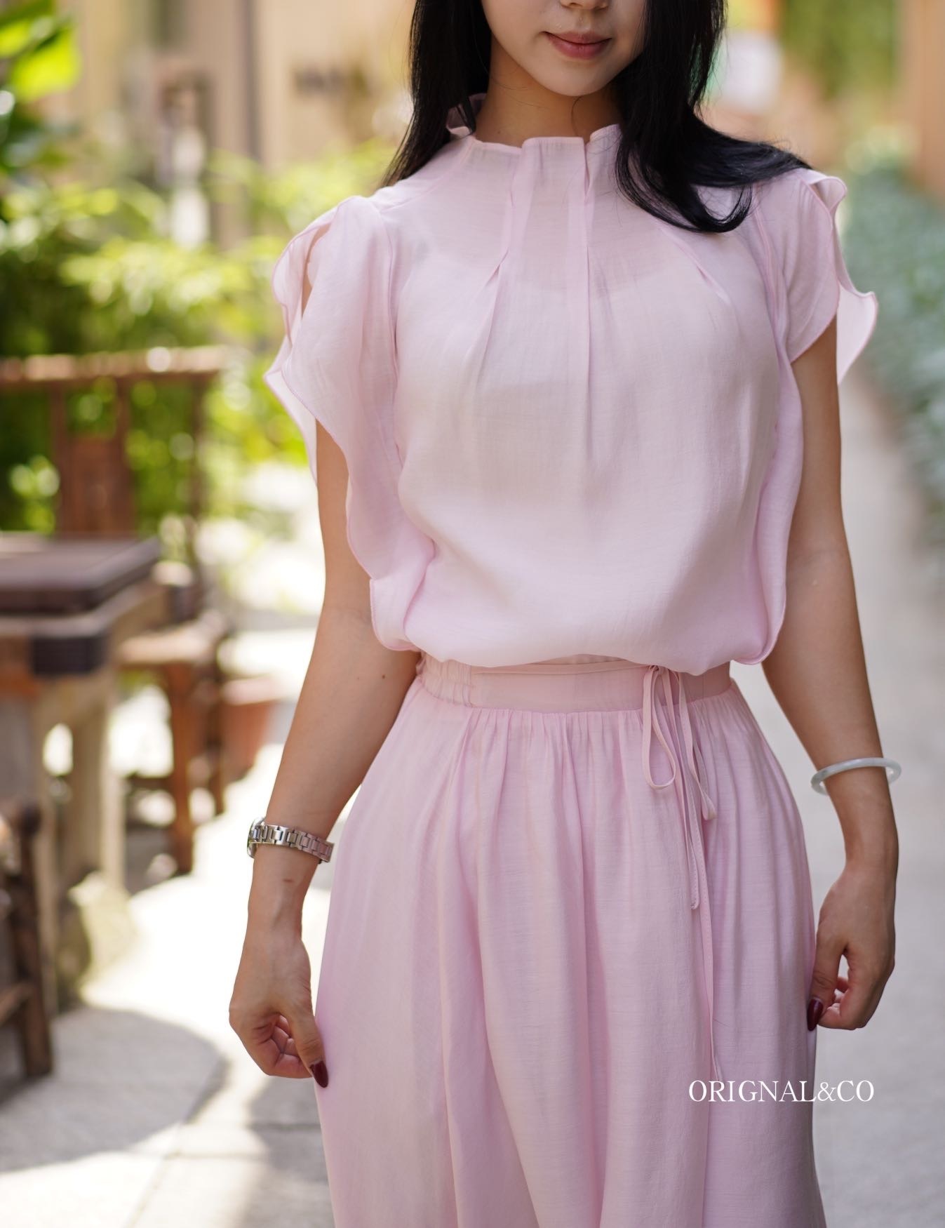 【英国ORIGNAL&CO 珠光粉套装】上衣+半裙 半裙宽松版型 花瓣袖上衣 选用优质天丝面料