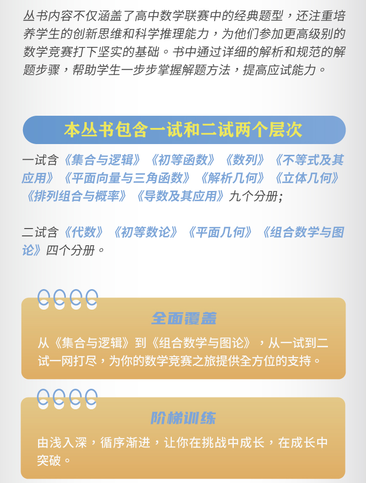 全面覆盖:从《集合与逻辑》到《组合数学与图论》,从一试到二试一网打尽,为你的数学竞赛之旅提供全方位的支持。