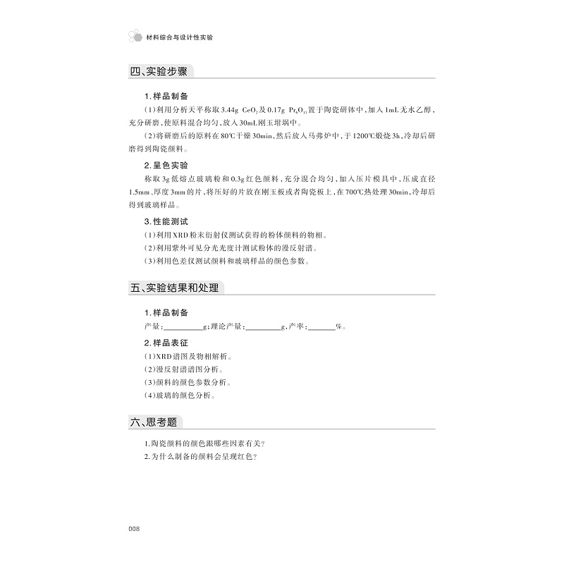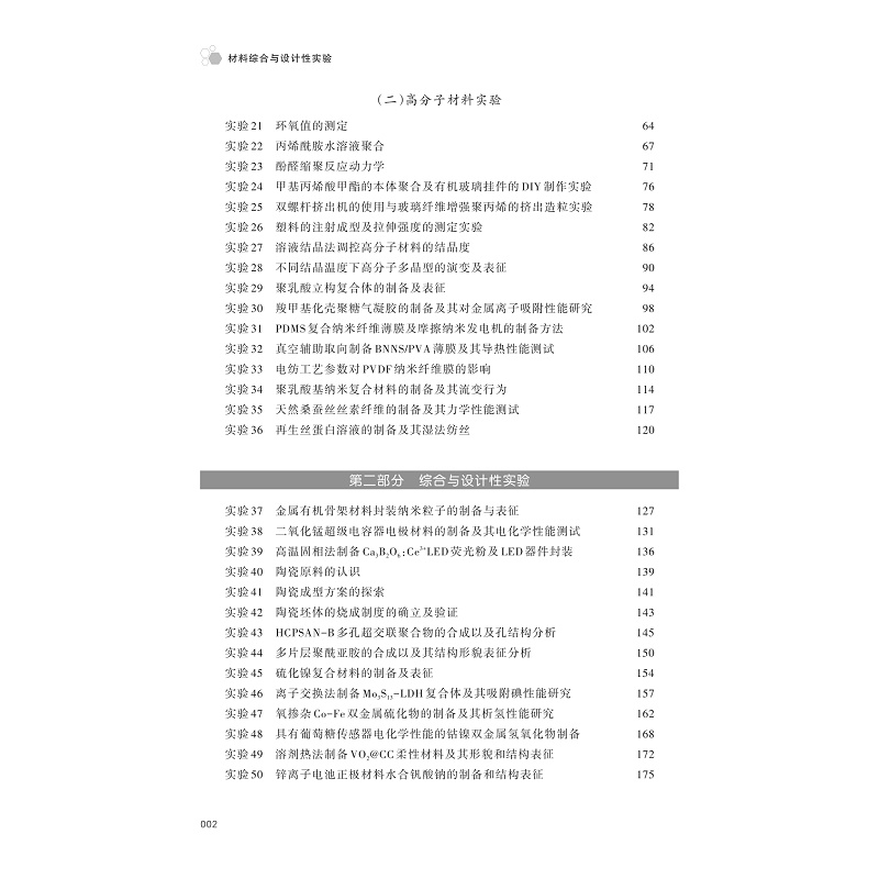 以新工科发展和建设为标准,以培养服务于地方经济发展需求的高素质应用型、复合型、创新型人才为目标,加深材料化学各专业课程的理解和应用,达到理论联系实际的目的。主要内容包括材料化学基础性实验、综合与设计性实验、校企合作开发实验、附录(常用仪器设备简介)四个模块。涵盖材料的设计、合成、制备以及结构、性能表征等方面的实验内容,重点是对学生创新精神和动手能力的培养。本书可作为综合性大学和高等师范院校 材料类专业本科生和研究生的教材,也可供化学和材料研究工作者参考。