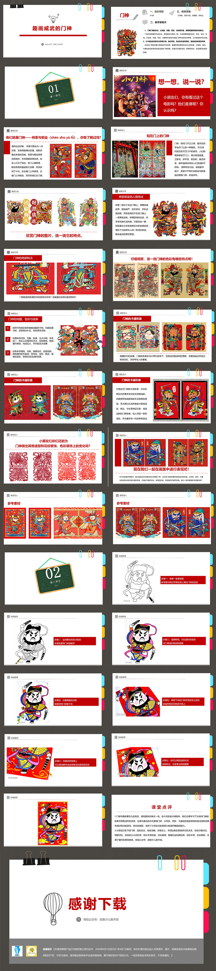 1、了解门神的文化,从造型,构图,色彩,功能等方面,感受我国民间美术的魅力。