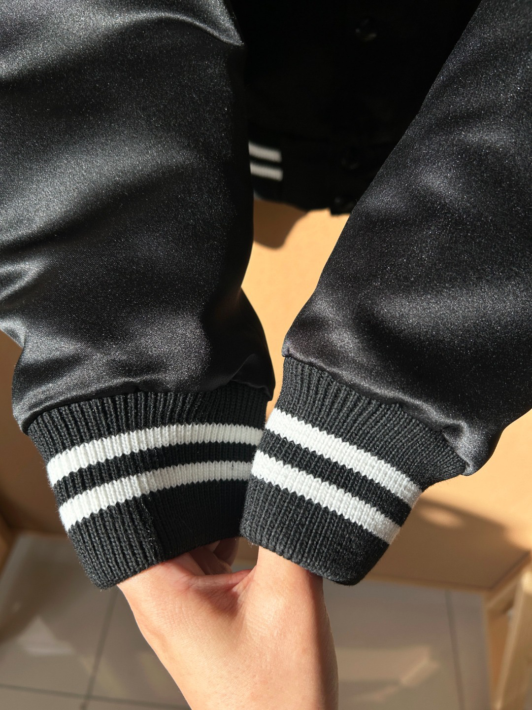 ✅领口、袖口和下摆处采用黑白撞色条纹设计,是棒球服的经典元素,增添了复古运动气息~