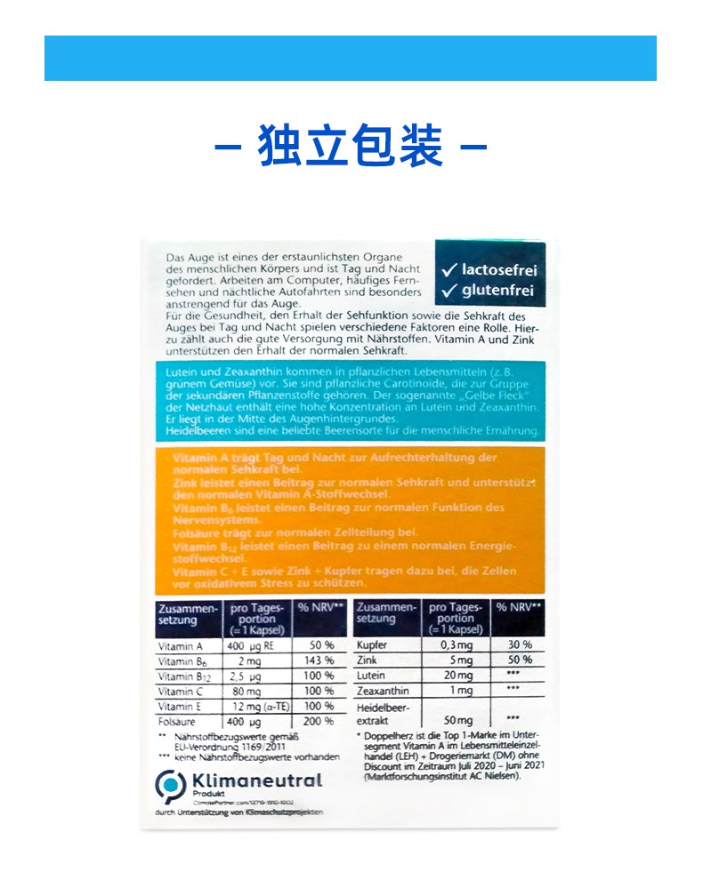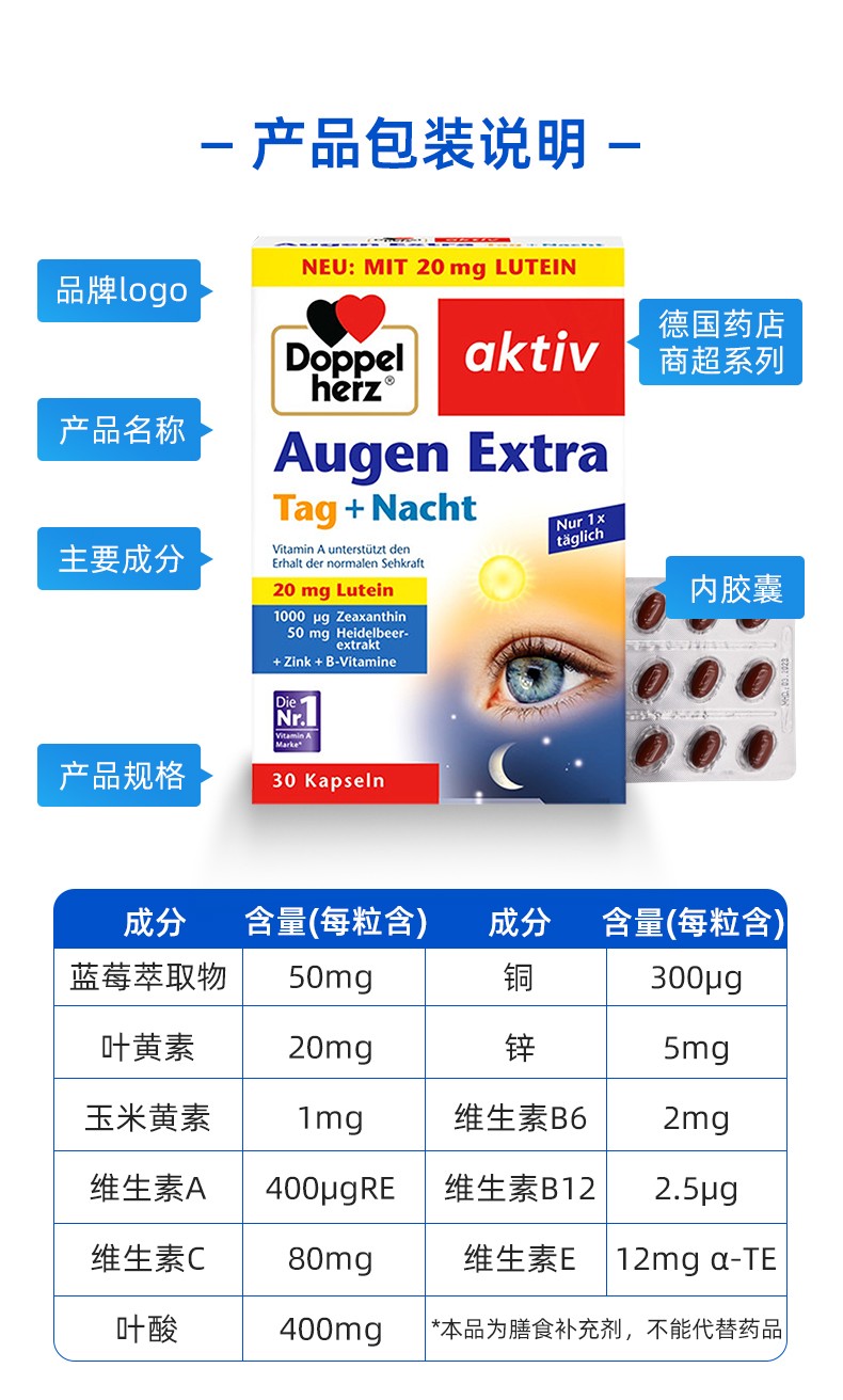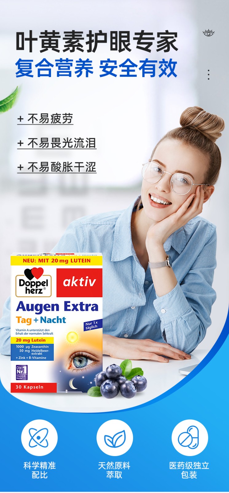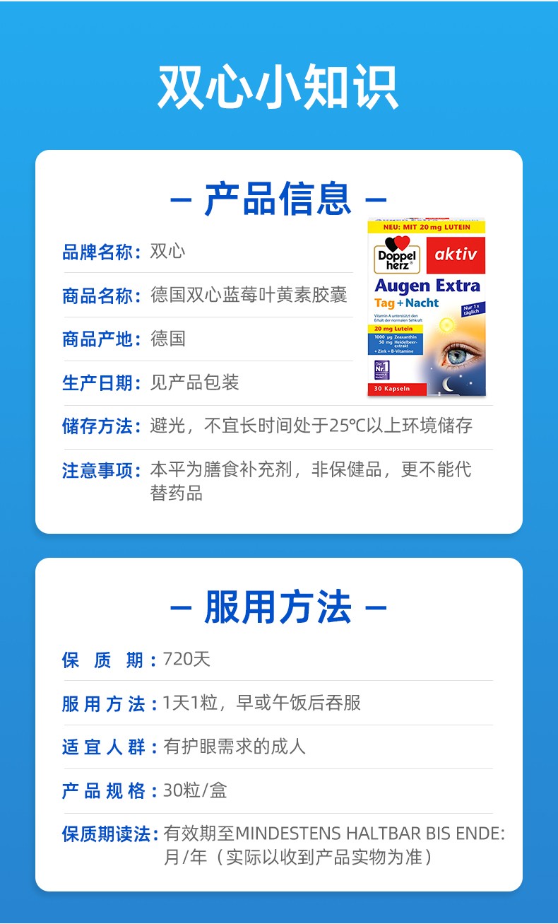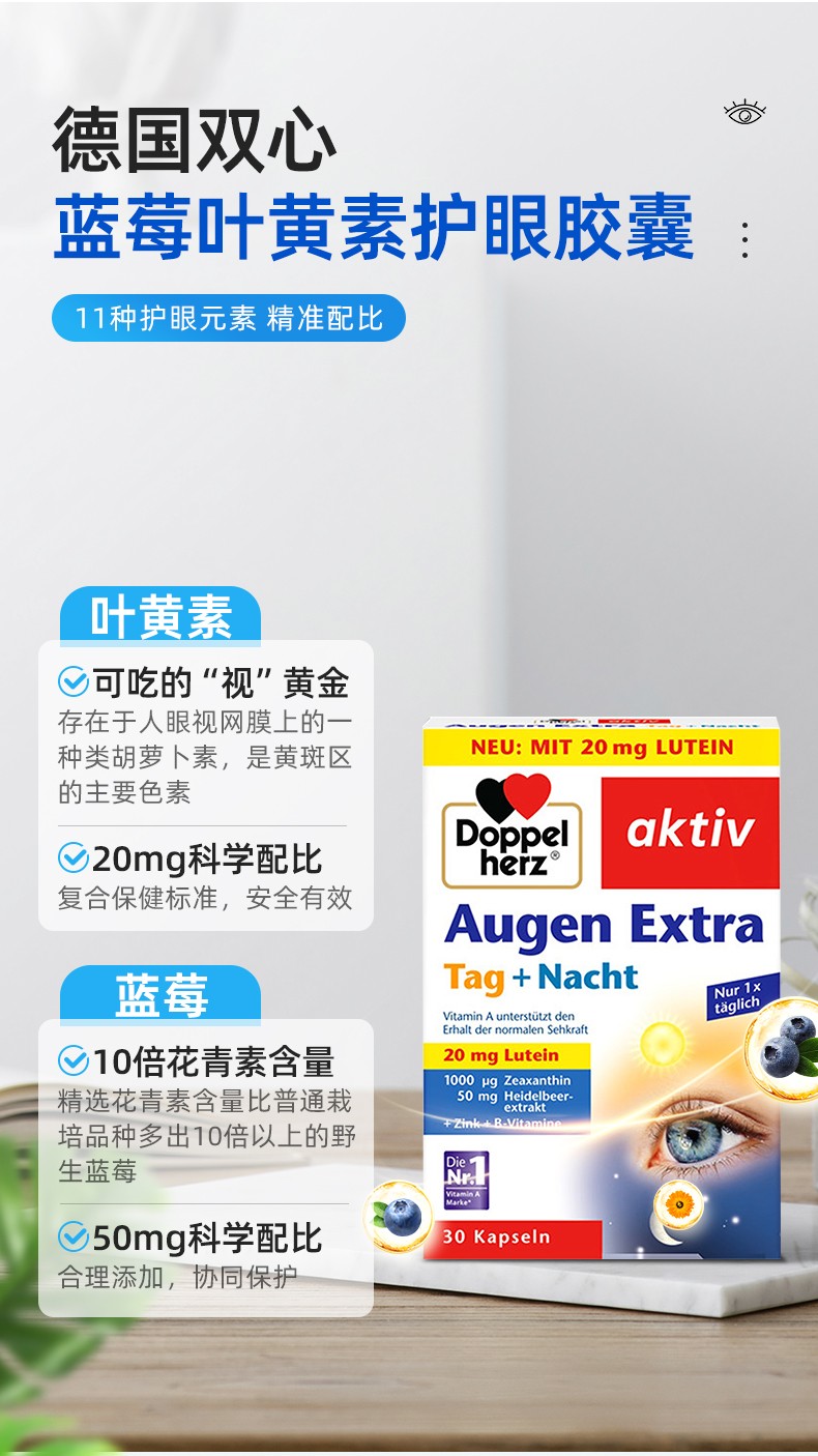 【跨境】【单盒装】德国Doppelherz双心蓝莓叶黄素胶囊30粒