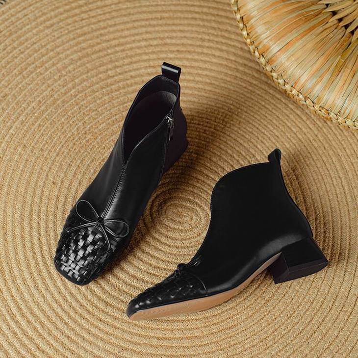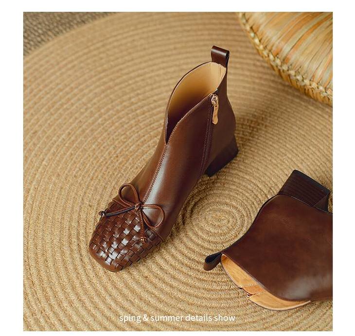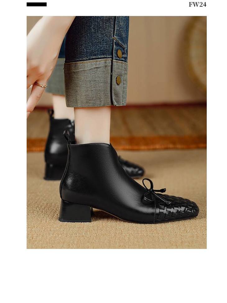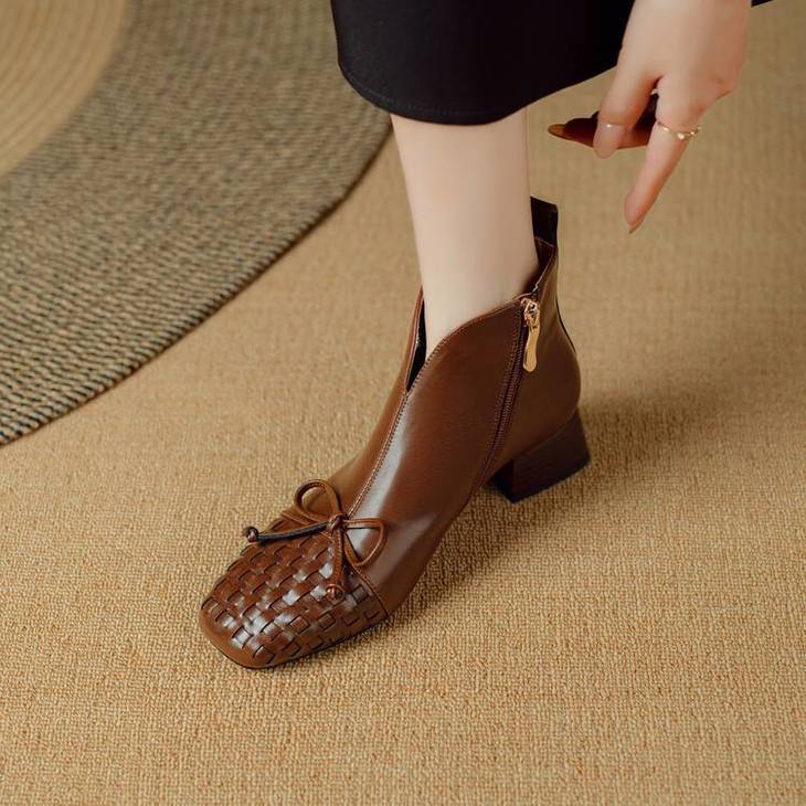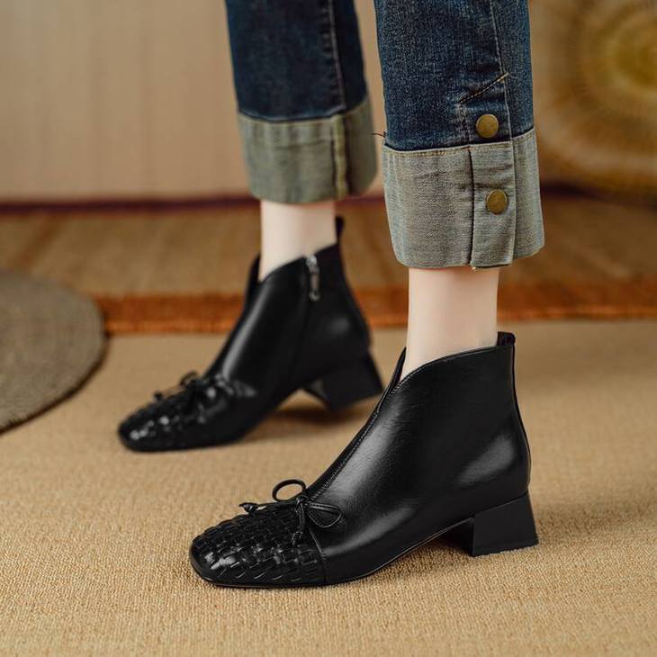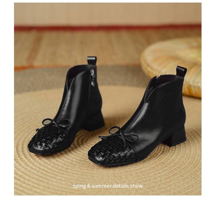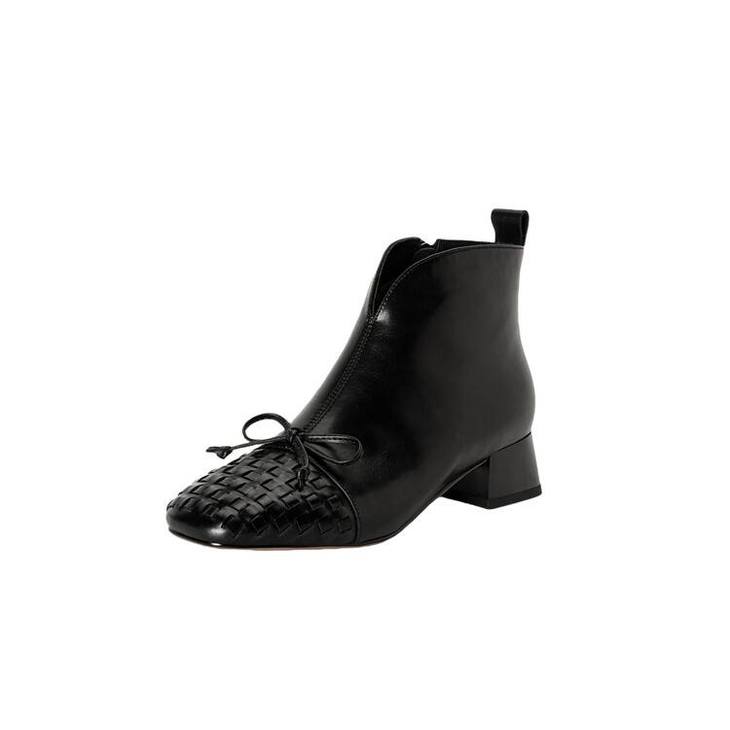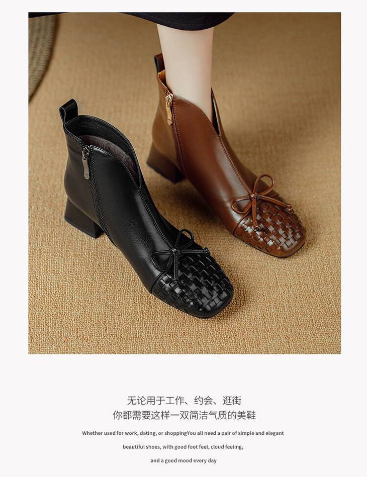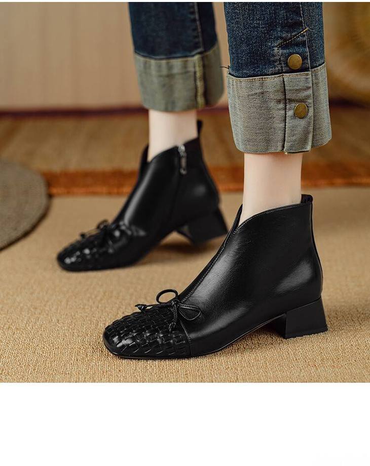 【预售5天】巨好看初秋新款编织短靴女新款蝴蝶结中粗跟复古方头马丁靴NJMK&K1126