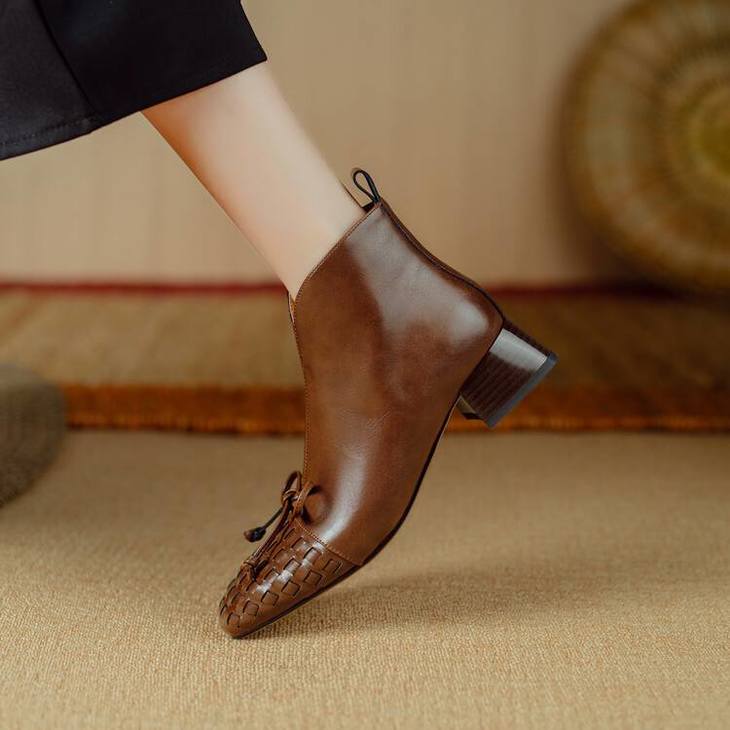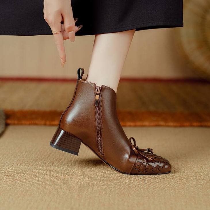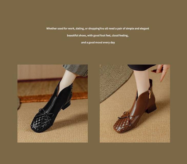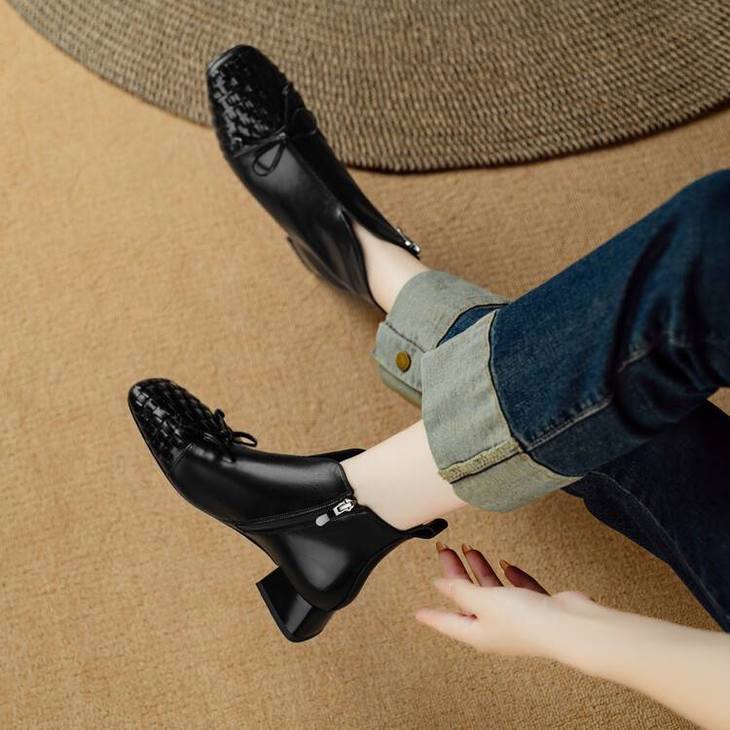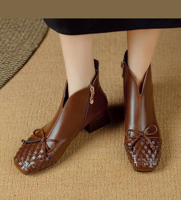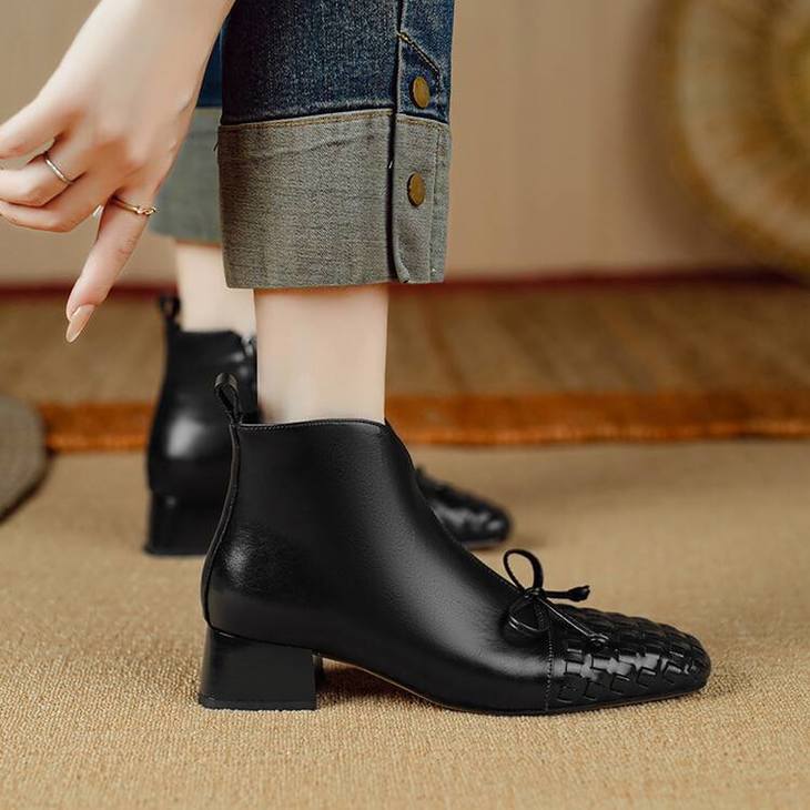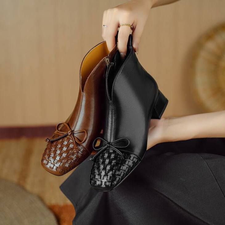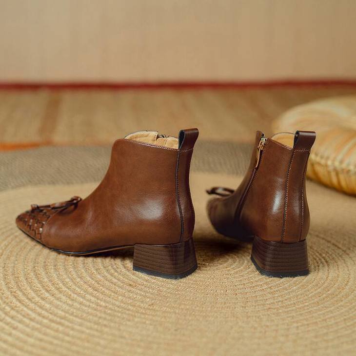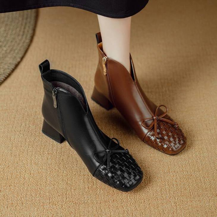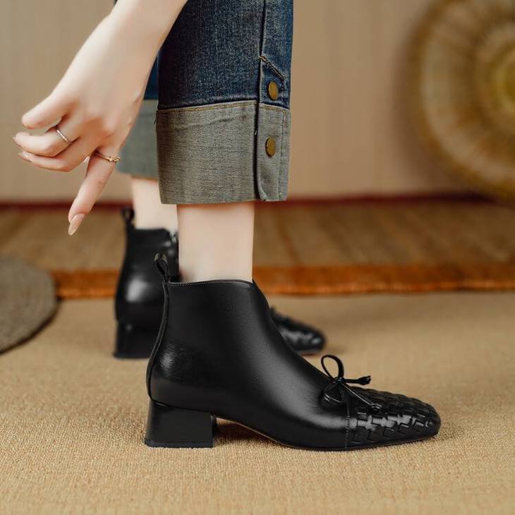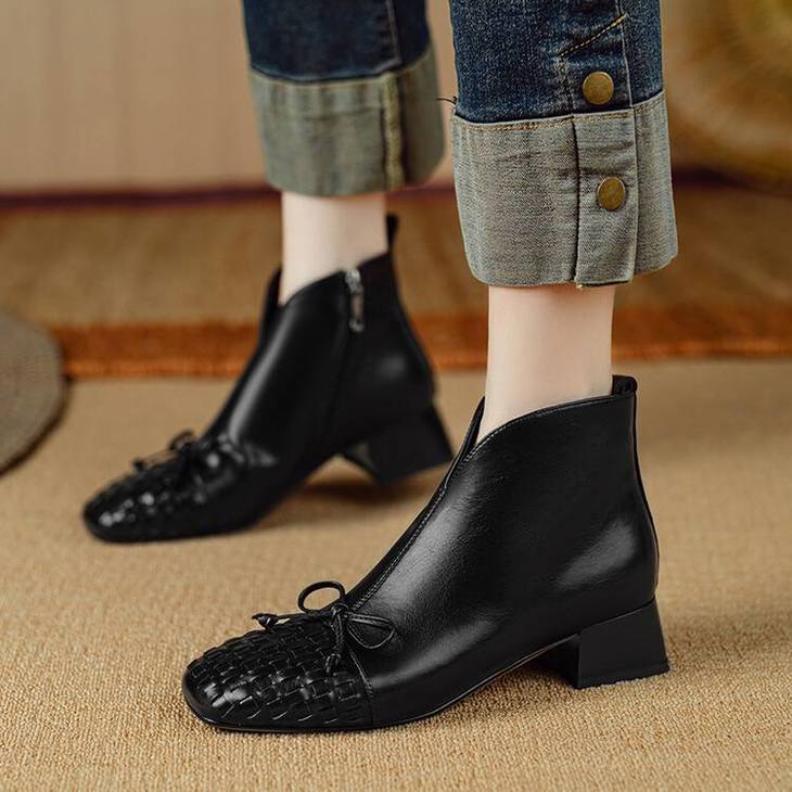 【预售5天】巨好看初秋新款编织短靴女新款蝴蝶结中粗跟复古方头马丁靴NJMK&K1126