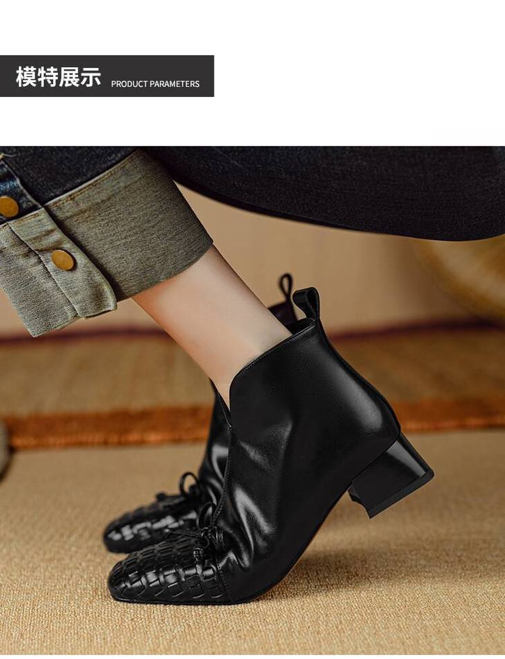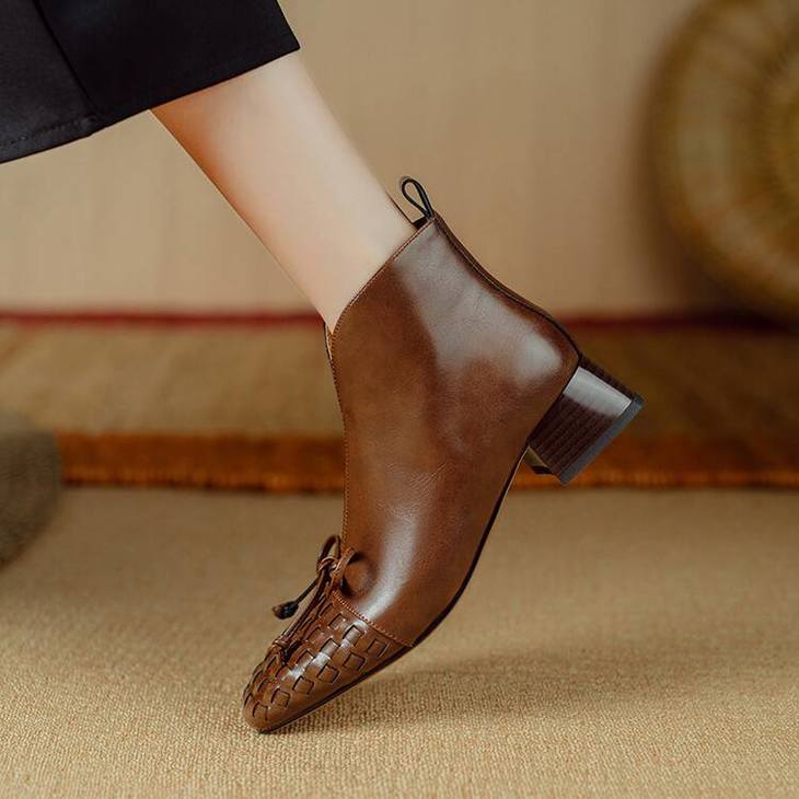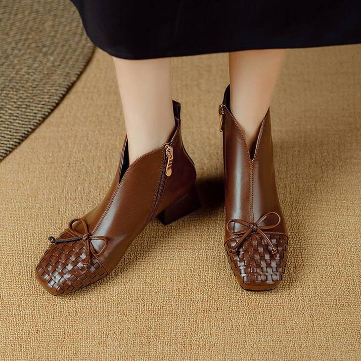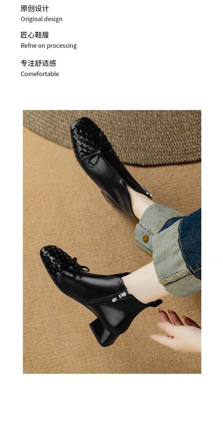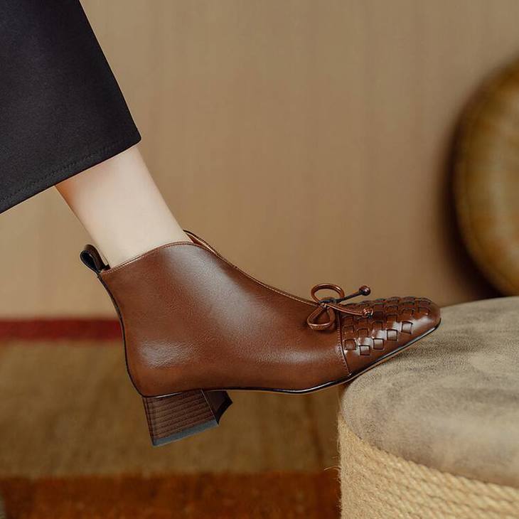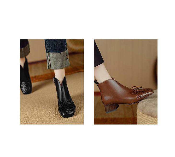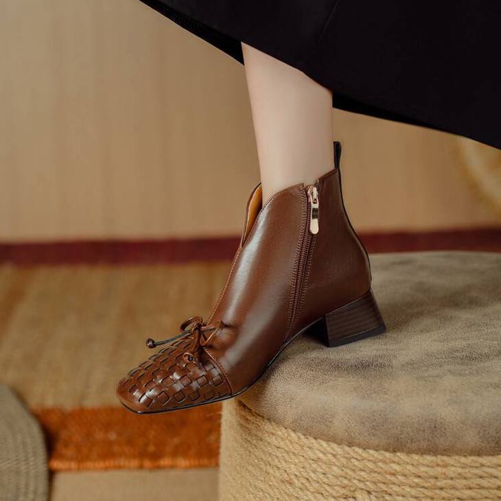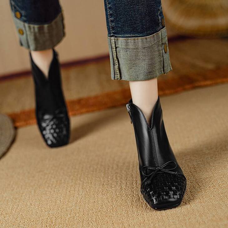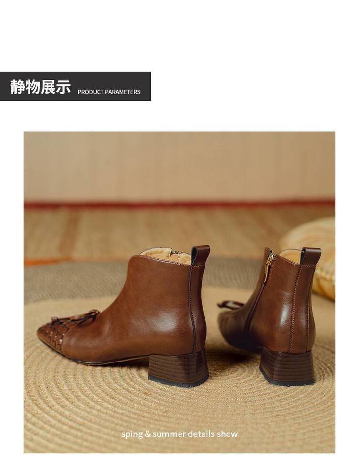 【预售5天】巨好看初秋新款编织短靴女新款蝴蝶结中粗跟复古方头马丁靴NJMK&K1126