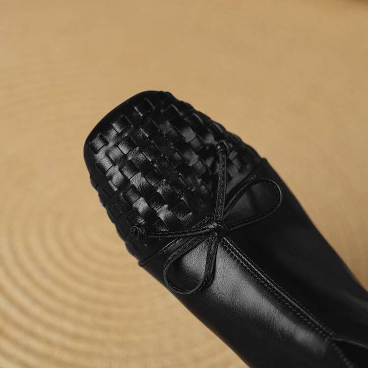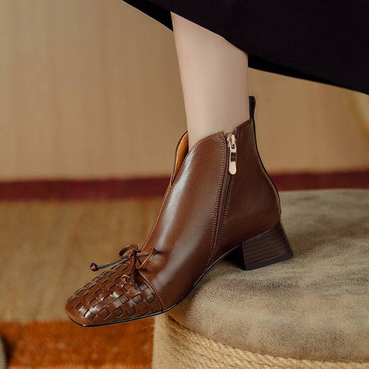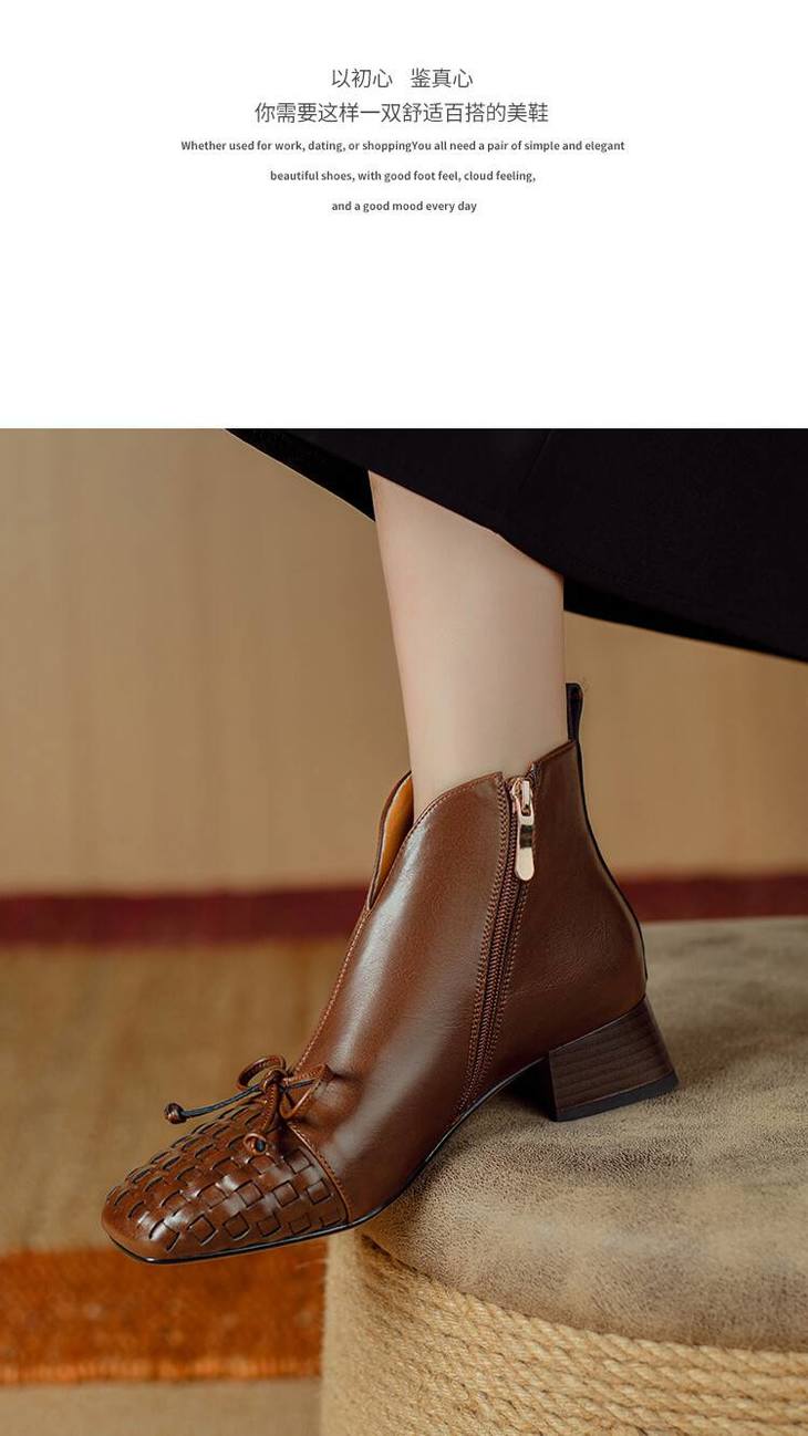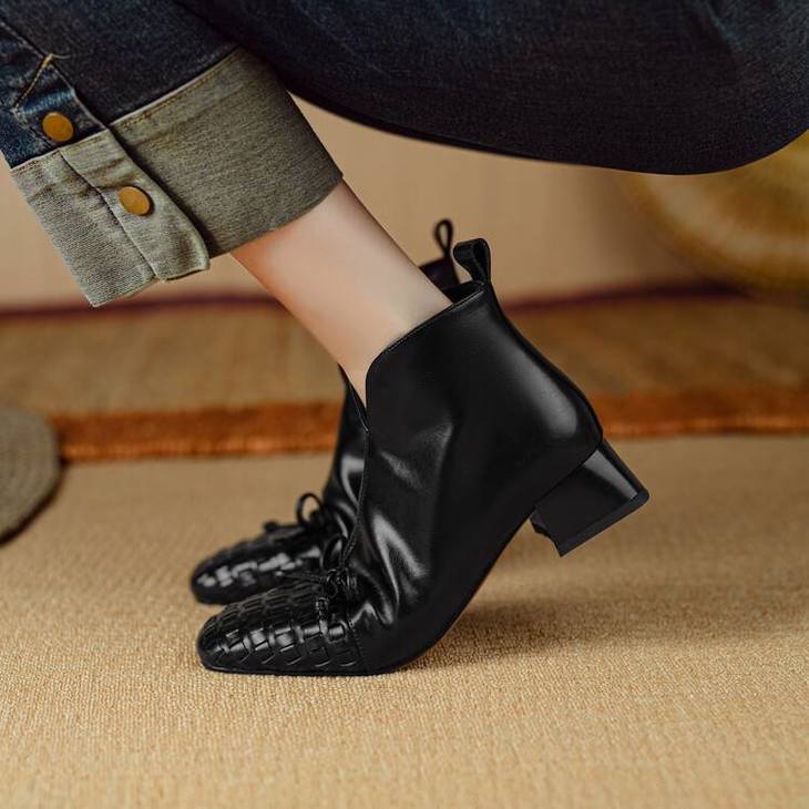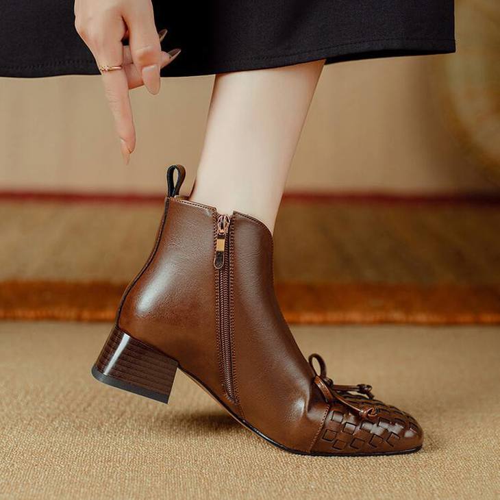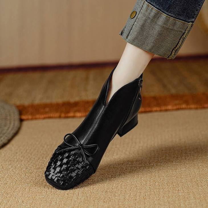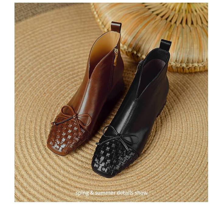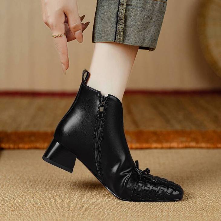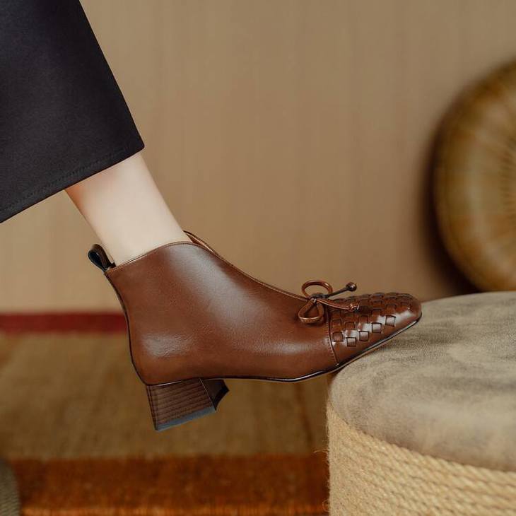 【预售5天】巨好看初秋新款编织短靴女新款蝴蝶结中粗跟复古方头马丁靴NJMK&K1126