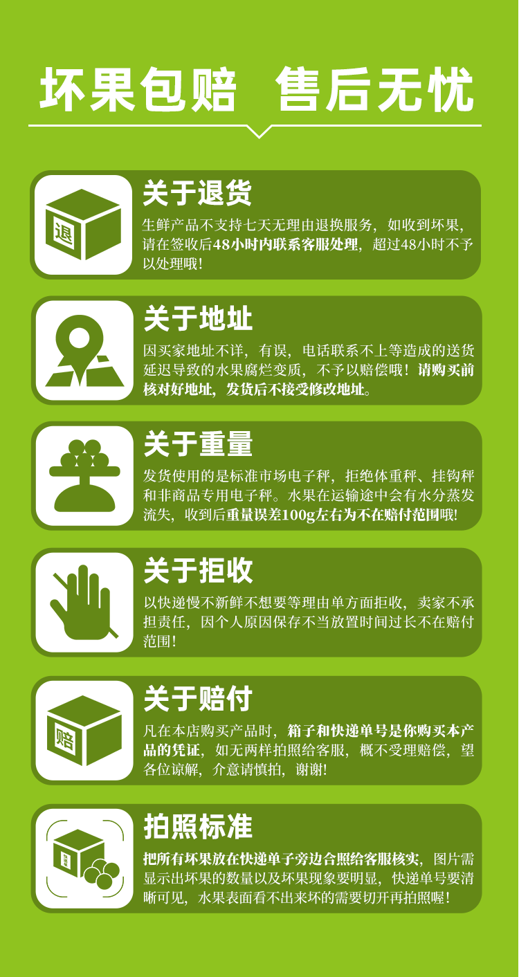 ③生鲜果蔬产品不支持退货退款,收到货后有任何质量问题,在24小时之内拍照联系客服进行售后理赔(提供快递单+包装箱+坏果图),售后方式按比例赔付(赔付金额=付款金额/产品总个数*坏果个数)。感谢您的信任,祝您购物愉快!